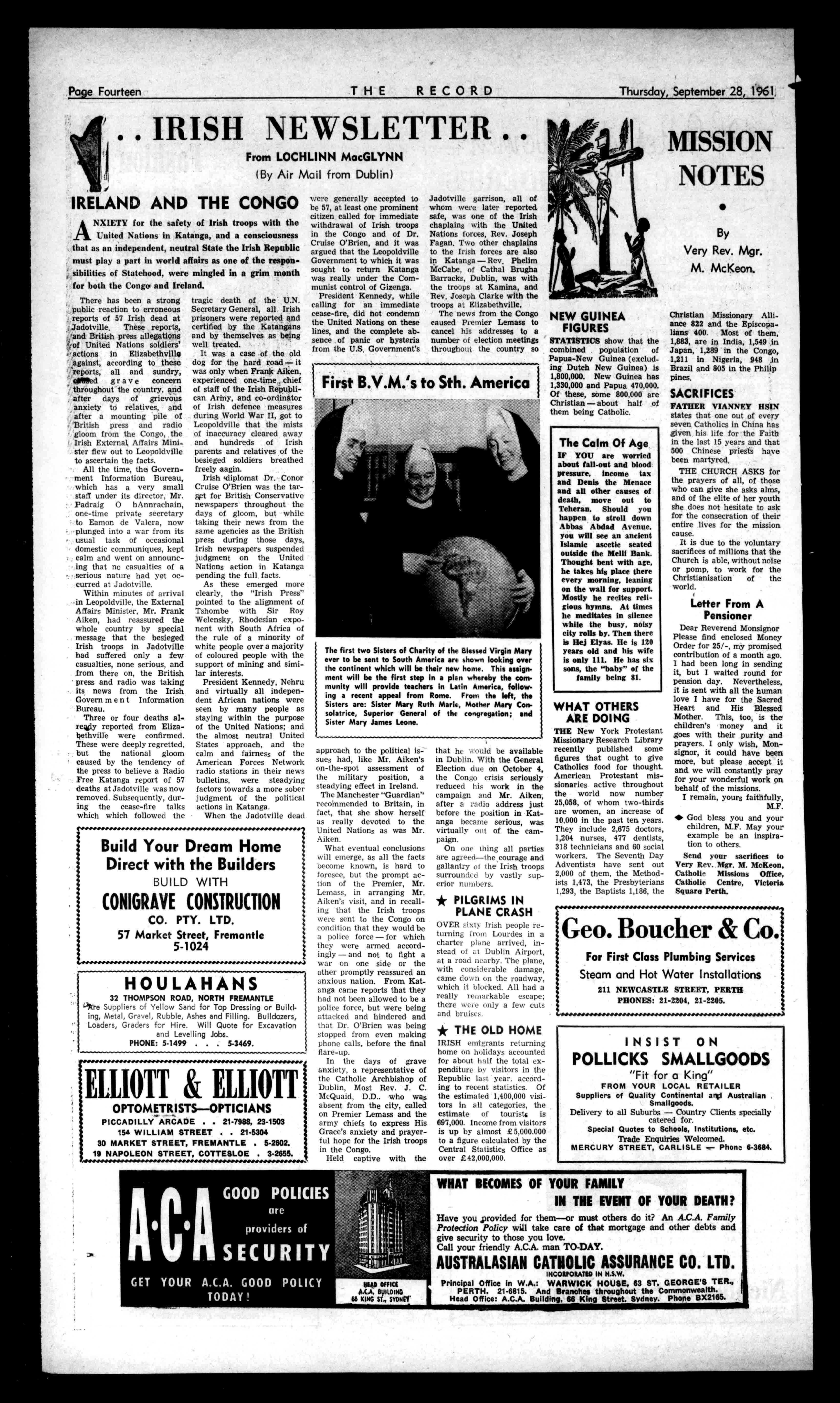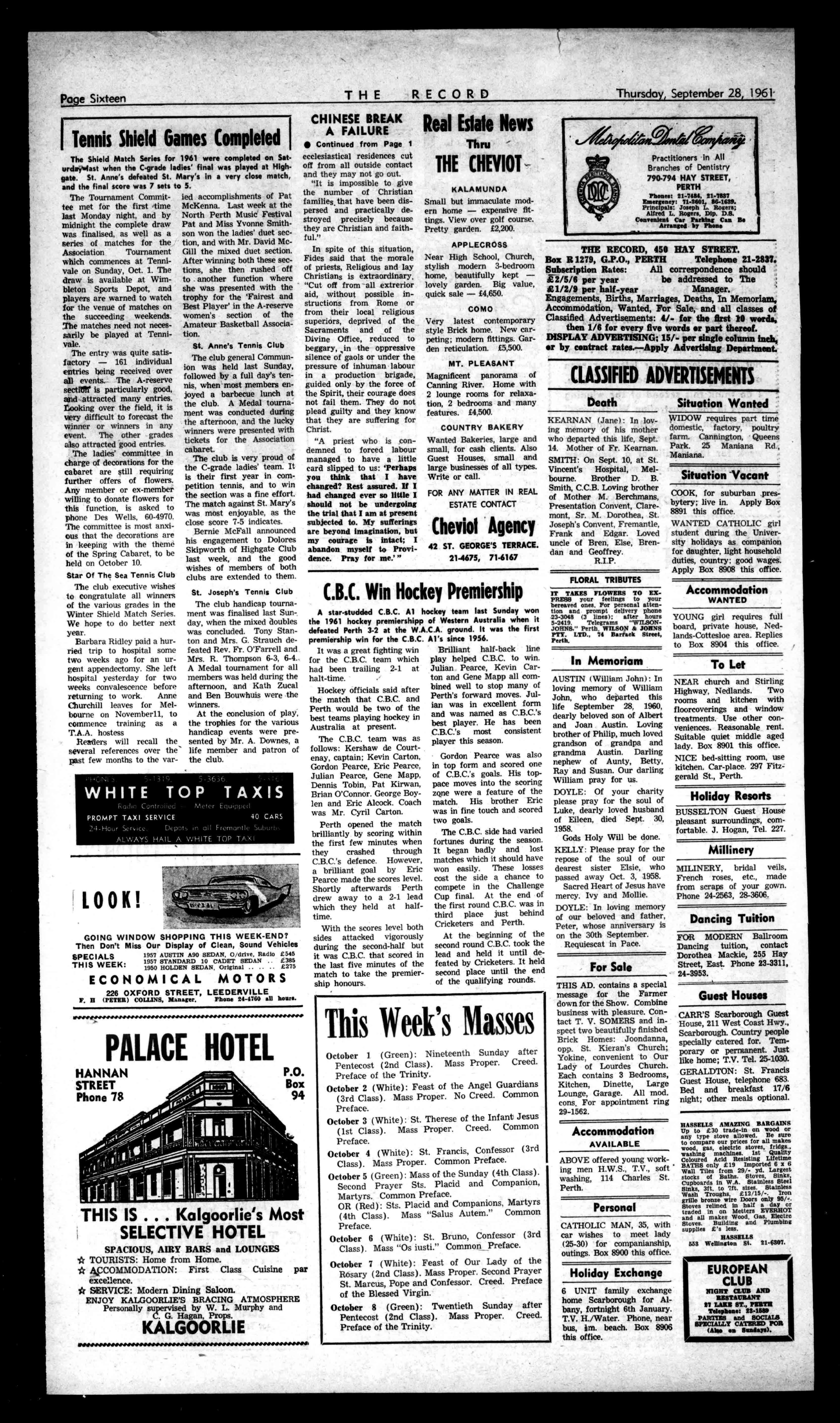 PractitionersinAll BranchesofDentistry 794794HAYSTREET, PERTH Phones:21-7454,21-7537 Emergency:71-2601,116-1639. Principals:JosephL.Rogers; AlfredL.Rogers,Dip.D.S. ConvenientCarParktagCanBe A dbyPhone THERECORD,450HAYSTREET. BoxR1279,G.P.O.,PERTH Telephone21-2837. SubscriptionRates: Allcorrespondenceshould k2/516peryear beaddressedtoThe £112/9perhalf-year Manager. Engagements,Births,Marriages,Deaths,InMemoriam. Accommodation,Wanted,ForSale,andallclassesof ClassifiedAdvertisements:4/-forthefirst10words, then1/6foreveryfivewordsorpartthereof. DISPLAYADVERTISING;15/-persingleC0111111/1inch, orbycontractrates.-ApplyAdvertisingDepartment. CLASSIFIEDADVERTISEMENTS Death KEARNAN(Jane):Inlovingmemoryofhismother whodepartedthislife,Sept. 14.MotherofFr.Kearnan. SMITH:OnSept.10,atSt. Vincent'sHospital,Melbourne.BrotherD.B. Smith,C.C.B.Lovingbrother ofMotherM.Berchmans, PresentationConvent,Claremont,Sr.M.Dorothea,St. Joseph'sConvent,
