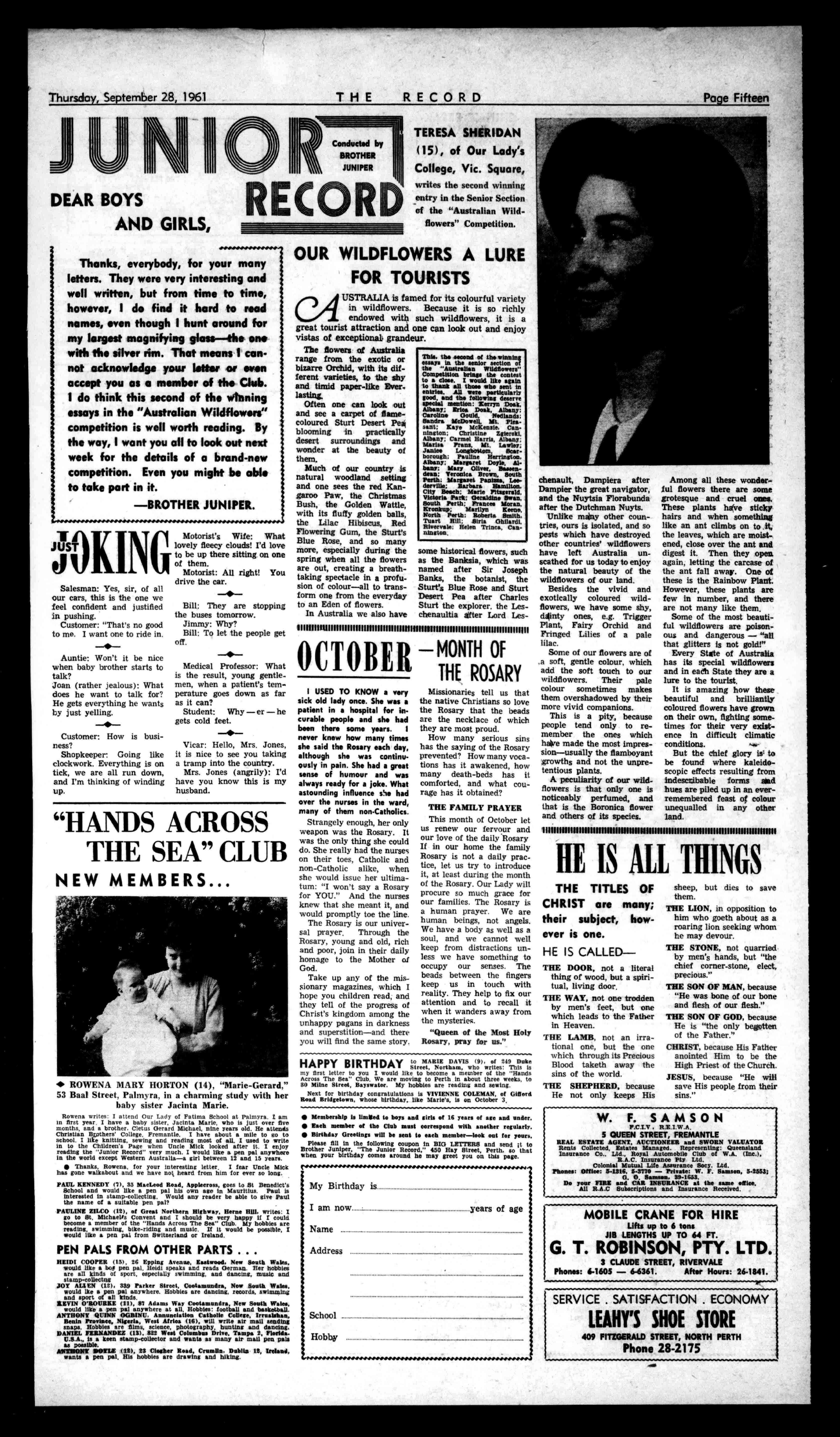 hobbiesarereadingandsewing. NextforbirthdaycongratulationsisVIVIENNECOLEMAN,ofGifford RoadBridgetown,whosebirthday,likeMarie's,isonOctober3, MembershipIslimitedtoboysandgirlsof16yearsofageandunder. EachmemberoftheClubmastcorrespondwithanotherregularly. BirthdayGreetingswillbesenttoeachmember-lootoatforyours. PleasefillinthefollowingcouponinBIGLETTERSandsendit.to BrotherJuniper,"TheJuniorRecord,"450HayStreet,Perth,sothat whenyourbirthdaycomesaroundhemaygreetyouonthispage. MyBirthdayis Iamnow.. yearsofage Name AddressSchool Hobby