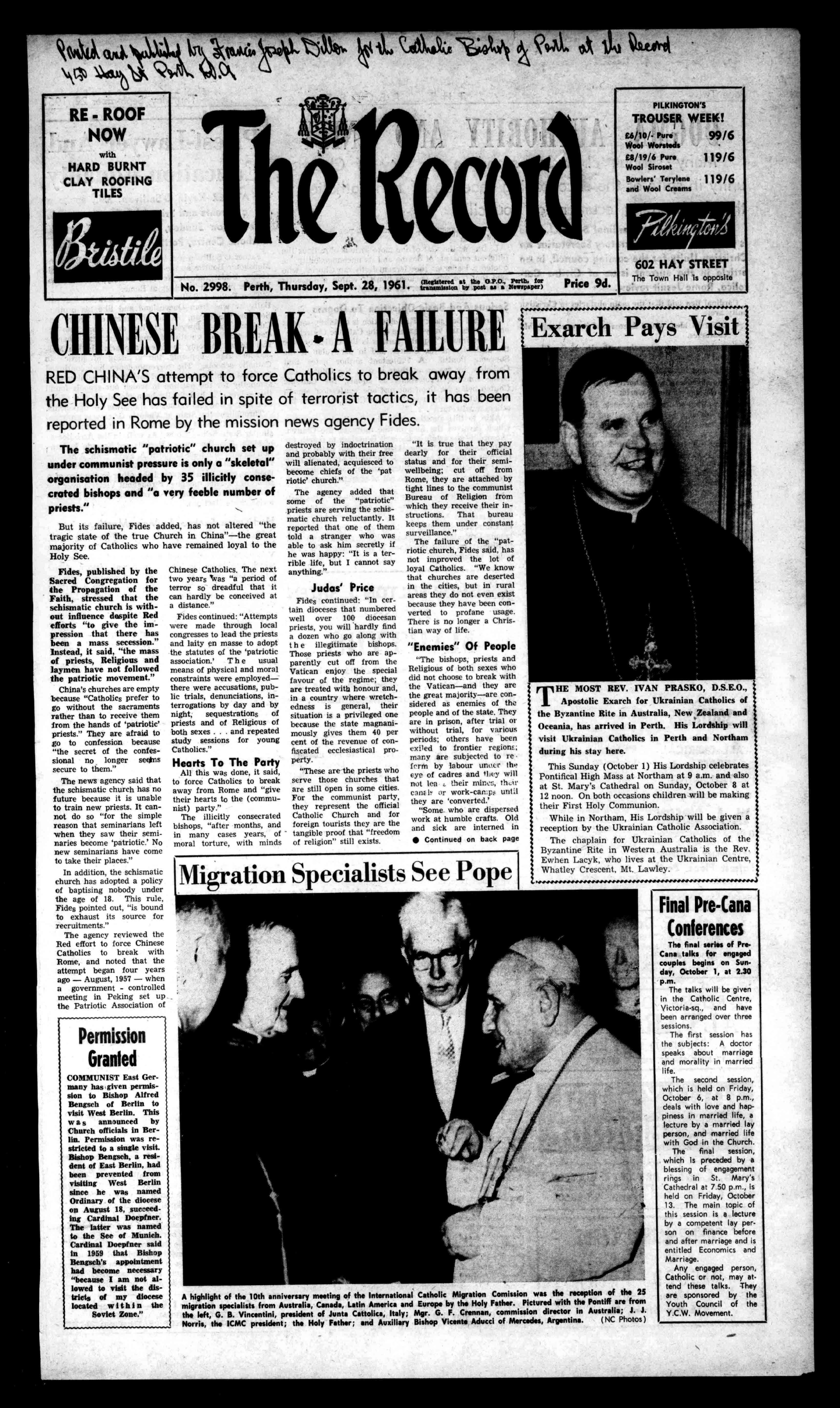 2998.Perth,Thursday,Sept.28,1961.==.17g.tc*L;jr..hp;(47) Price9d.