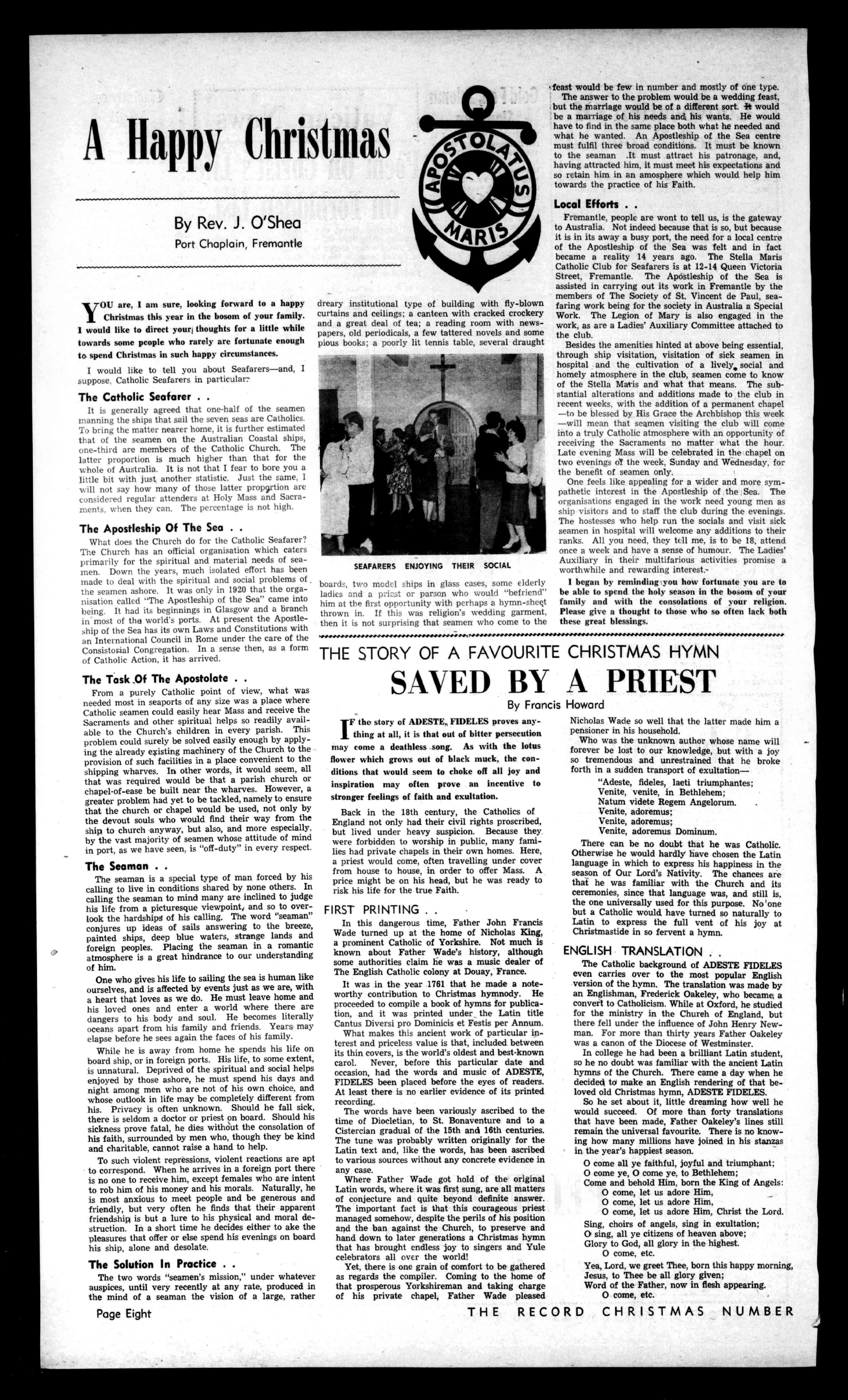 Dec.20: 8p.m.:Blessextensionsto "StellaMaris"CatholicClub forSeafarers,Fremantle