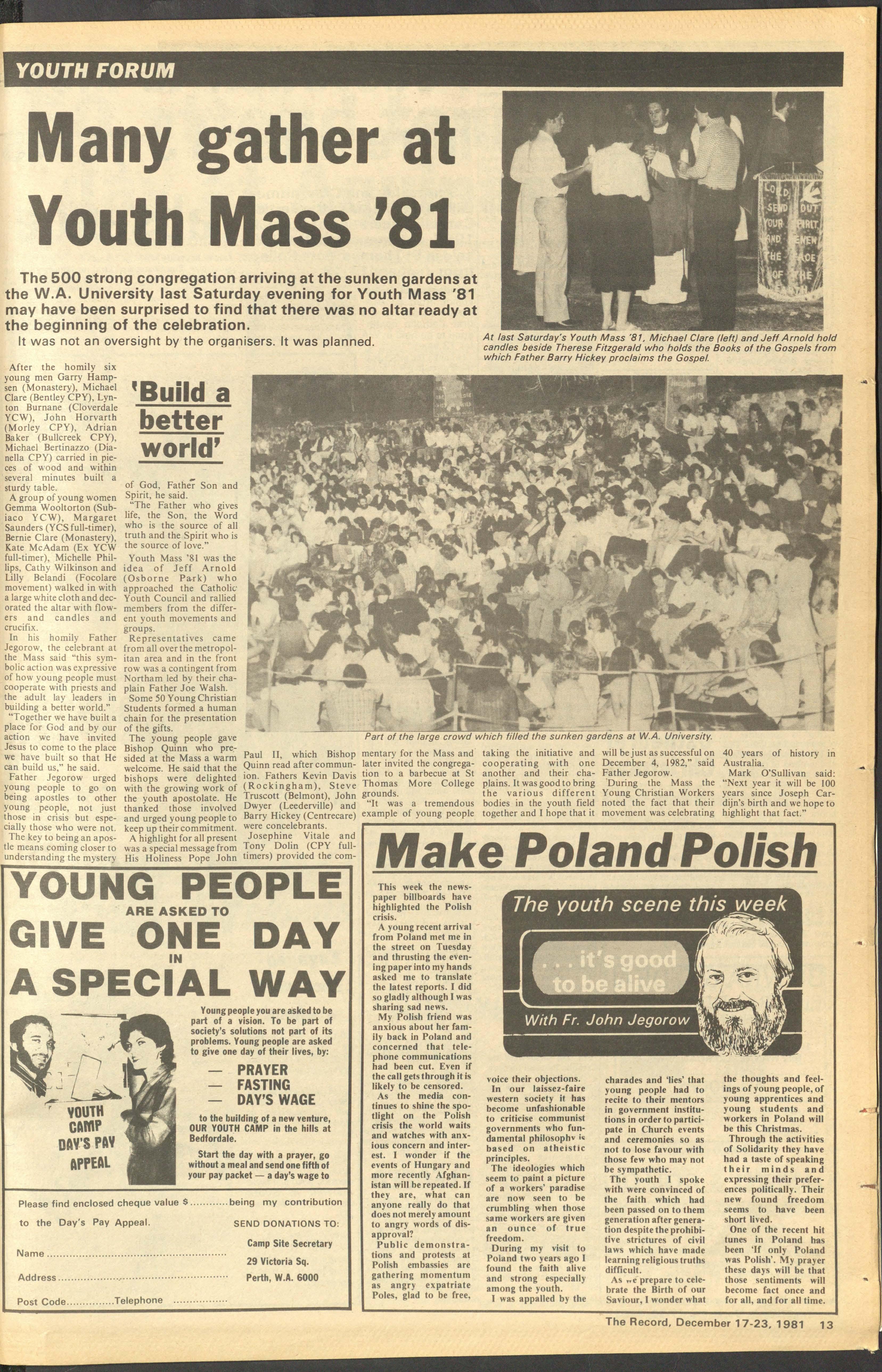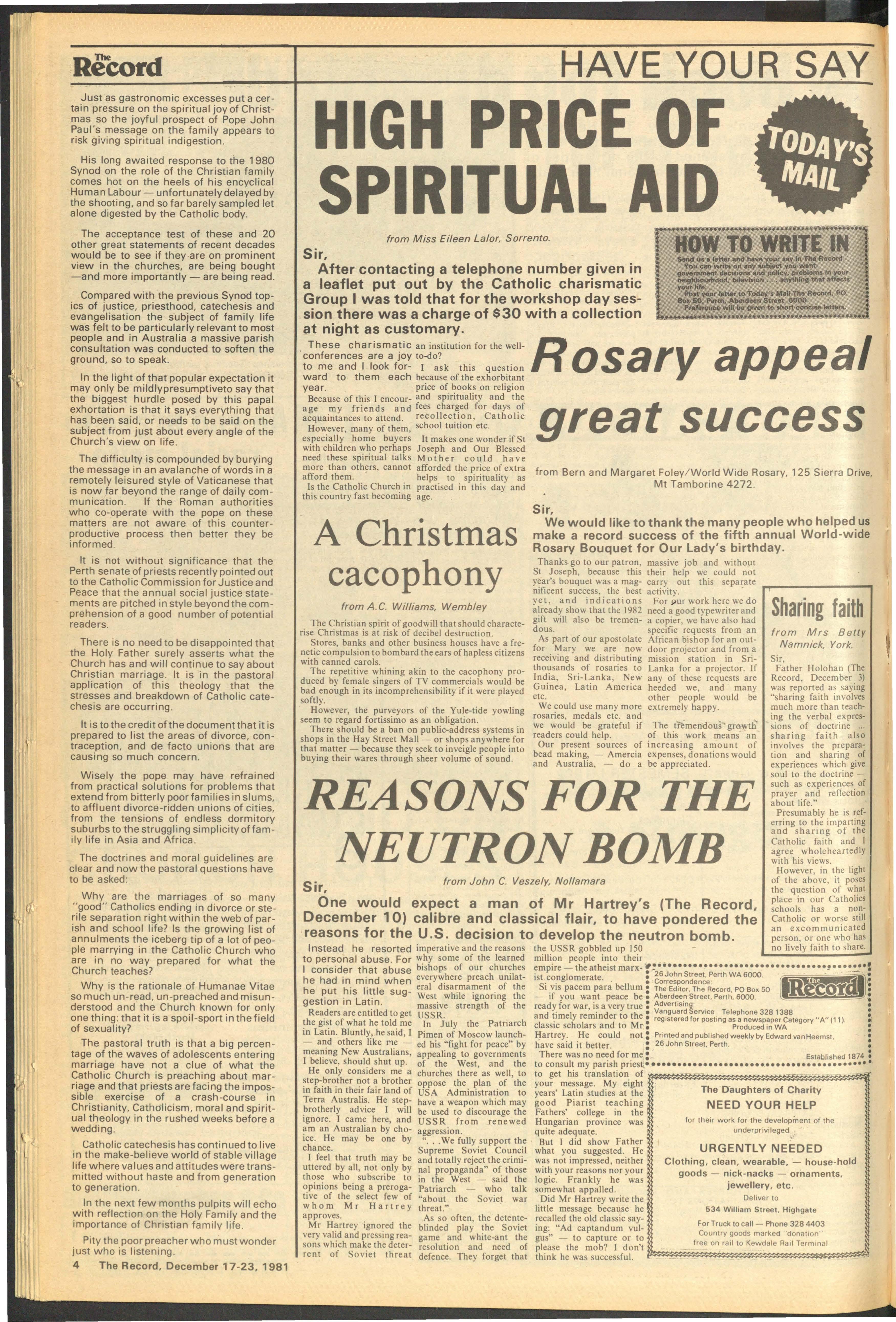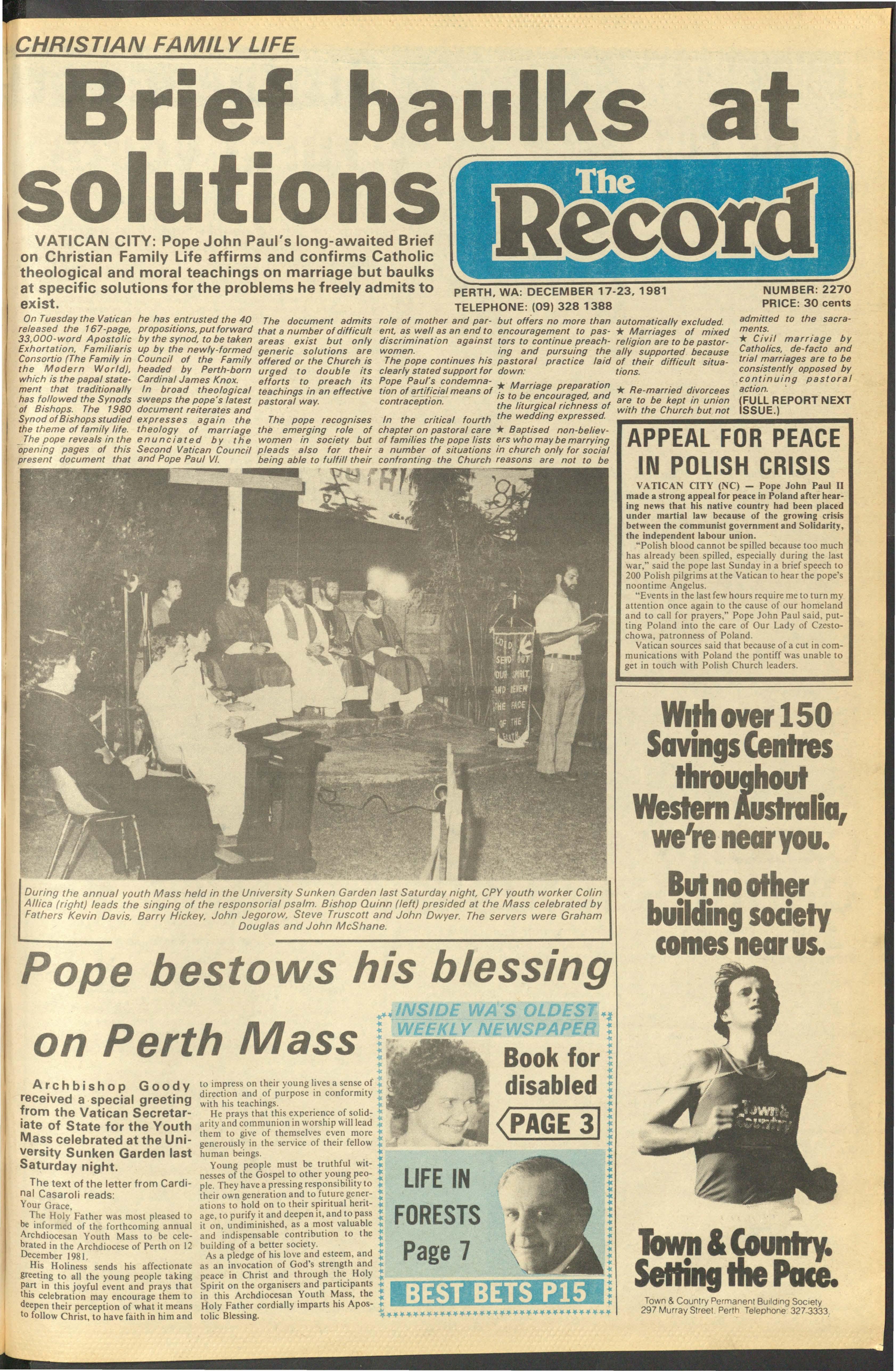The text of the letter from Cardinal Casaroli reads: Your Grace 1:he Hot/ Father was most pleased to be mformed of the forthcoming annual Archdiocesan Youth Mass to be celebrated in the Archdiocese of Perth on 12 December 1981.