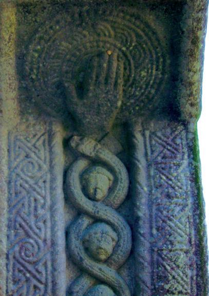 Above, the Dextera Dei , the Right Hand of God, is portrayed on the north face of Muiredach’s Cross, left, the largest of the stone “high crosses” at Monasterboice in County Louth,
