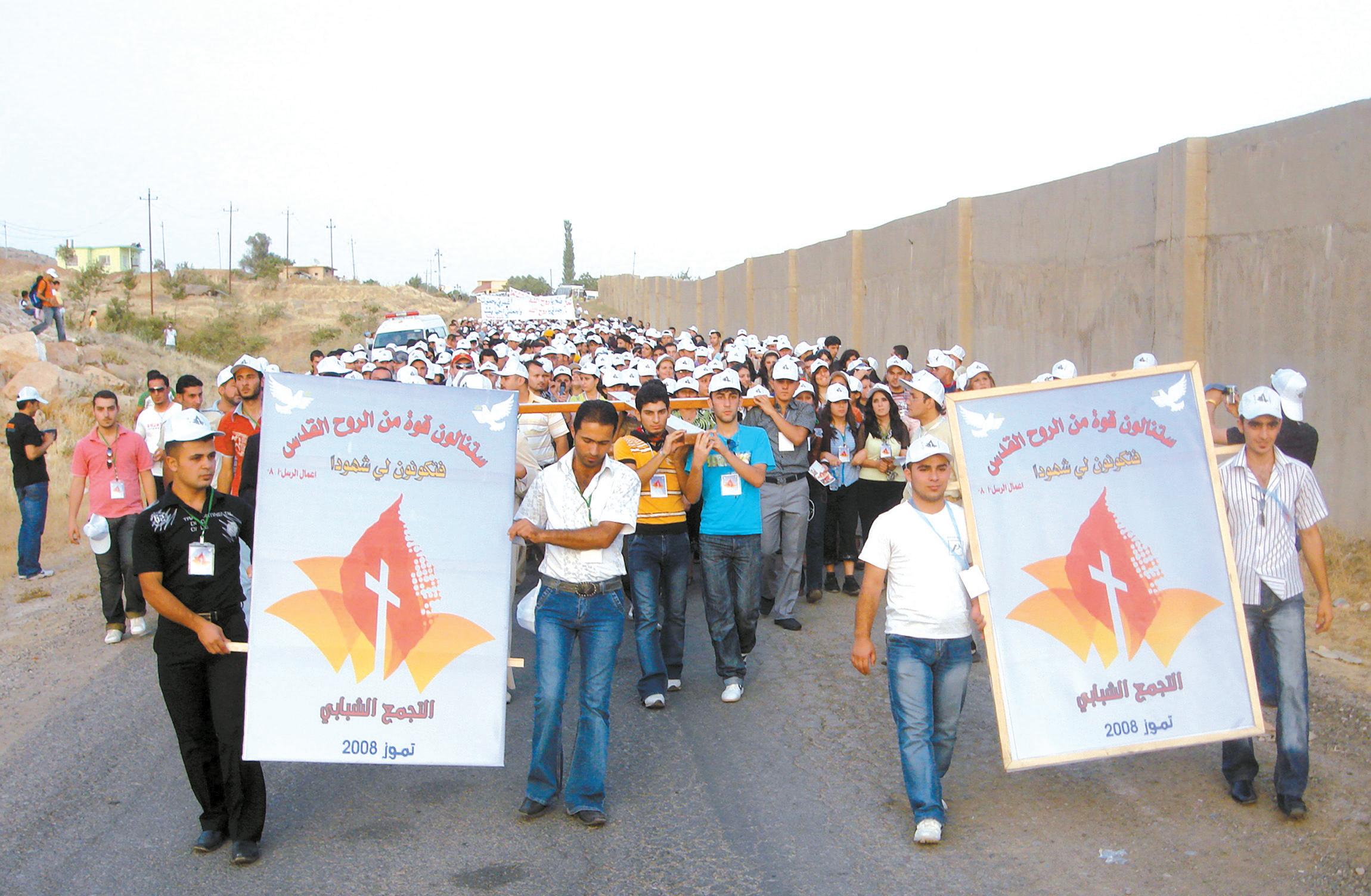 Even here... faith in Him survives - and is proud. Iraqi Catholic youth carry World Youth Day posters and a cross during a procession in Aradel, northern Iraq, on July 17 in the midst of WYD happening in another hemisphere. More than 6500 youth in Iraq participated in processions, catechesis, the Way of the Cross, singing and Masses to mark the simultaneous international gathering occurring in Sydney. Some Iraqi Catholics who had made plans to travel to Sydney were not granted visas.