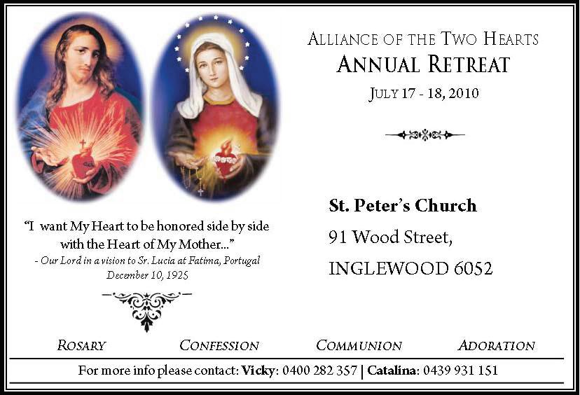 7pm at St Peter’s Church, 93 Wood St, Inglewood. Benediction, Praise and Worship followed by Mass with Fr Sam and Fr Joseph Tran as celebrants, later fellowship. Enq: Priscilla 0433 457 352.