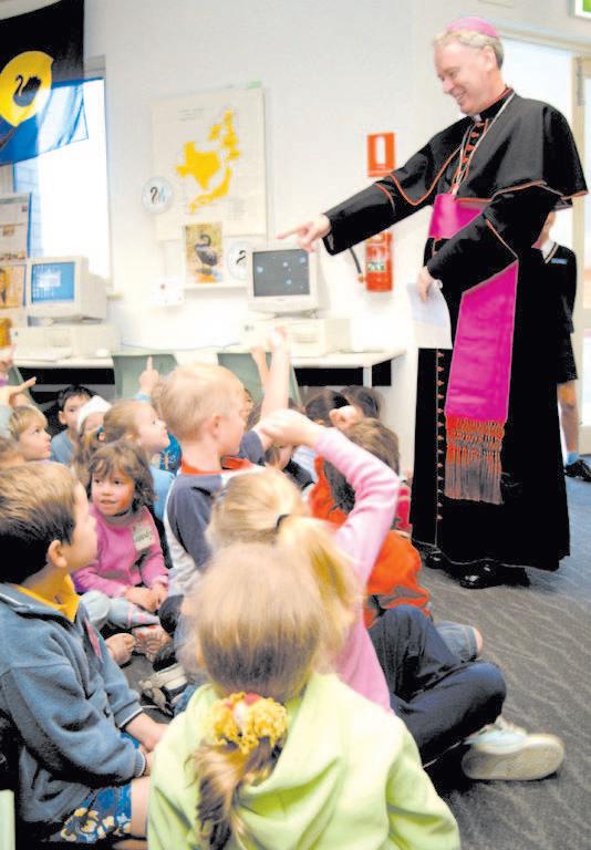 Auxiliary Bishop Donald Sproxton fields questions from students at Our Lady of Grace School in North Beach after blessing the newly-completed fifth stage of the school’s capital works program recently. The main feature of the program was the renovation and extension of the school’s library. Blessing the new facilities, Bishop Sproxton prayed for students, teachers and parents who, he said, collaboratively help to promote sound education. Catholic Education Office director Ron Dullard said the commitment of the community provided the students with an excellent education that built on the efforts of the past to provide them with