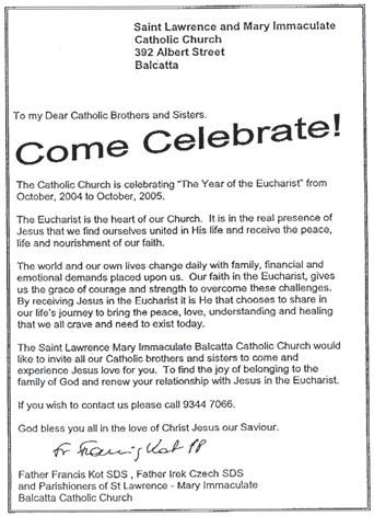 As a response to Pope John Paul II’s request to consider this year as “The Year of the Eucharist”, the Parish of Saint Lawrence and Mary Immaculate in Balcatta last November sent out 8366 invitations to encourage their lapsed