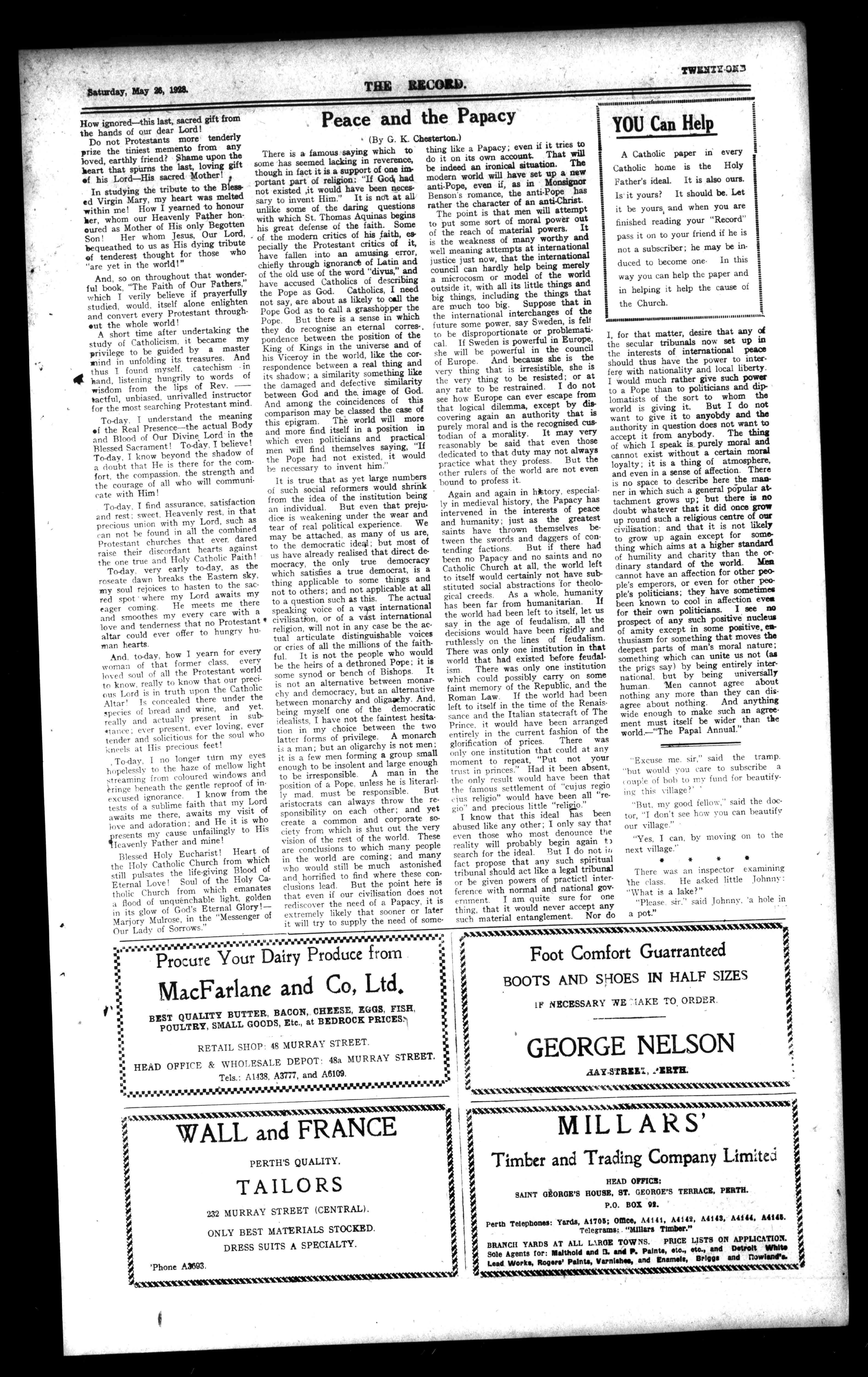 `imuninmiMiniuMMOnminhoulmilThinfinnmuthmunhOwnin I a a PUBLISHEDWEEKLY. ACATHOLICWEEKLYCIRCULATINGTHROUGHOUTTHESTATEOFWESTERNAUSTRALIA. PRICETHREEPENCE. RegisteredattheG.P.O.,Perth,forTransmissionbyPostasaNewspaper. liSTAILISIED1374. inieliMINSMININ IliElli1141MIEMilliiillii111li1U111111E1E111111111111111111111111111111111111111111111111111I " NUM ADDRESS:BOXNW,fLP.O. 'PHONEA.5447. No.2,511 TheAustralasianCatholicAssurance COMPANYLIMITED.' PLEADOFFICE:OCEANHOUSE,34MARTINPLACE,SYDNEY. RegisteredundertheCompanies'Act,1899,ofNewSouthWales. BRANCHOFFICES:-VICTORIA:475Collins-street,Melbourne. SOUTHAUSTRALIA:29KingWilliam-strut,Adelaide. HEADOFFICEFORWESTERNAUSTRALIA: WARWICKHOUSE,ST.GEORGE'STERRACE,PERTH. DistrictOffices:Newcastle,BallaratandGeelong.hateUNIIka ADULTLIFEANDENDOWMENTASSURANCESOFALL CLASSESEFFECTED. 'PhoneSPECIALENDOWMENTASSURANCEFORCHILDREN. A6484. T.J.McGRATH,ResidentSecretary. "cloomEloommicloacwooMMIZIC3C3CICXXVIC PERTH,SATURDAY,MAY26,1928 IN.01.1110 y.WOMINWWWWWYWOMee0A1WIPAMWEVieeiern. '-'1.1.1"..".%'.V..1%WrANWAVYW YOURSILKS AREBESTPROCUREDAT COURT'S ONEQUALITY-THEHIGHEST!ONEPRICE-THELOWEST! AUTUMNSILKSANDVELVETSJUSTOPENED. NOWSHOWINGINWONDERFULARRAY. CONVENTS,COLLEGES,INSTITUTIONSANDSCHOOLSSPEC1 ALLYCATEREDFOR. THEYAREINBARRACKSTREET .: PtP.;4., 1441:: ii ii is,NuseseowM P!. IL NISMB 11111'1 11111.,...111 er;:: "ConsistentlyGood" HereisONEREASONwhy keen,shopperstravelmilestoplace theirorderswithus.Listentothis: "Thereisneveranattemptio'ringin' cheapbrandsatthesamepriceas stani'ardlinesatJohnWills&Co.Ltd. IalwaysgothereformygoodsasI findthequalityCONSISTENTLY GOOD."-Soseysoneladytoher friend. Ifunabletoshoppersonally,postor phoneyourorderTO-DAY-Youcan payondelivery-you'llbepleased,too PullPH,.ListonApplitattott A4398$(2__:EITR":H=A5698 JohnWills&Co.Ltd,, lin mi.,"MIN Vol.LII. 104111.11611111611.10110110611 MtI.