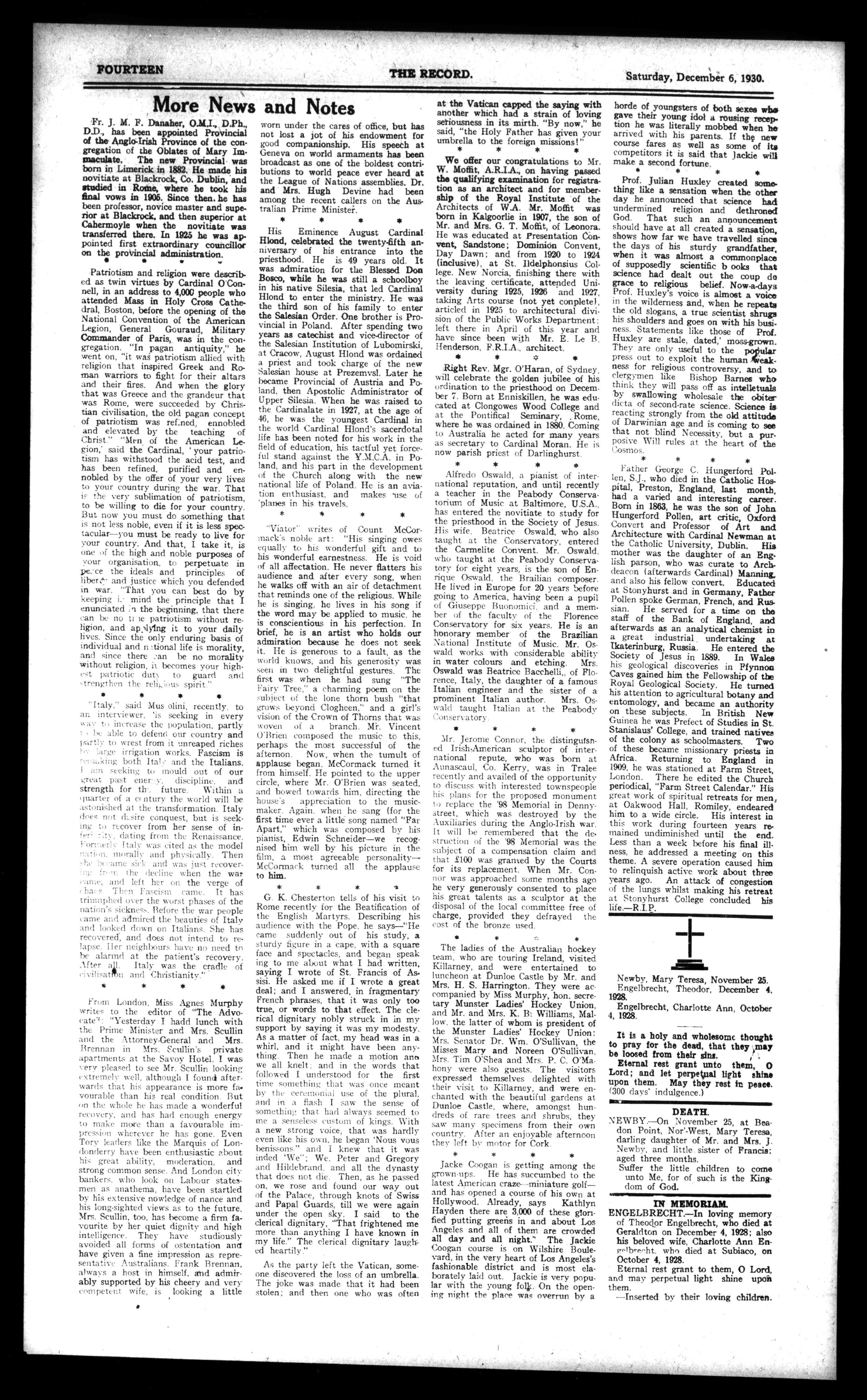 Brennan'sCeylonTea,2/6lb. PUBLISHEDWEEKLY. 9 ADDRESS:BOXJ639,G.P.O. 'PHONEB5447. Official()NanofthoArchdioceseof PRICETHREEPENCE. ACATHOLICWEEKLYCIRCULATINGTHROUGHOUTTHESTATEOFWESTERNAUSTRALIA. RegisteredattheG.P.O.,Perth,forTransmissionbyPostasaNewspaper. ESTABLISHED1879. No.2,646 PERTH,SATURDAY,DECEMBER6,1930 Vol.LTV. BartlettoStudio ViceRegalPhotographers. NOTENEWADDRESS: TRINITYBUILDINGS,HAYSTREET(Centre) 1;th,LitttornTrinityArcade). FORHIGHSTANDARDPORTRAITURE. NIGIITORDAYWEDDINGSASPECIALITY. MakeYourAppointment. 'Phone83851. CARTSBROS. THEGIFTSHOP ATTHEOLDORIGINALADDRESS. BARRACKSTREET NEWOPTICALDEPARTMENT UNDERMANAGEMENTOFMRVMGLICK,F.V.O.A., ClimbtheStairs-SaveaPennyEveryStep GrocerySelfService FIRSTFLOOR Prunes,inSyrup,largetins. GoodVinegar,largebottle ChoicePrunes CampPie PlumJam,24oz.tins "Willsgood"S.R.Flour,71b.for GiantBarSoap CcndensedMilk,thgeetinsfor ThreeDozenClothesPegsfor LooseTableRaisins SkimMilk JellyCrystals,5packetsfor 11b.PacketCustardPowder Vidtin 6d.t. 71d.tin. 61d. 1,2. 10(1.tin. 1 6d 6d.lb. 7d.tin. 1 C.andB.Pickles,small 61d.bottle. HomeMadePlumPuddingandPacketCustardfor1 SampleAssortmentBiscuits 3d.bag. JohnWills&Co.Ltd. WillsgoodHouse PERTH. Wellington-street TheGiftShop FOY&GIBBON'S ItsaShowthatChangesEveryDay TheGiftShop TheGiftShopisahappyhuntinggroundforhurriedshoppers. lii.,50hpIingrendc..4\ turningthe '1),tlightfor,(01.,r1gilt,nggc,tit,t)-thatarenew.novel,maul. V11'11,1,1101110111