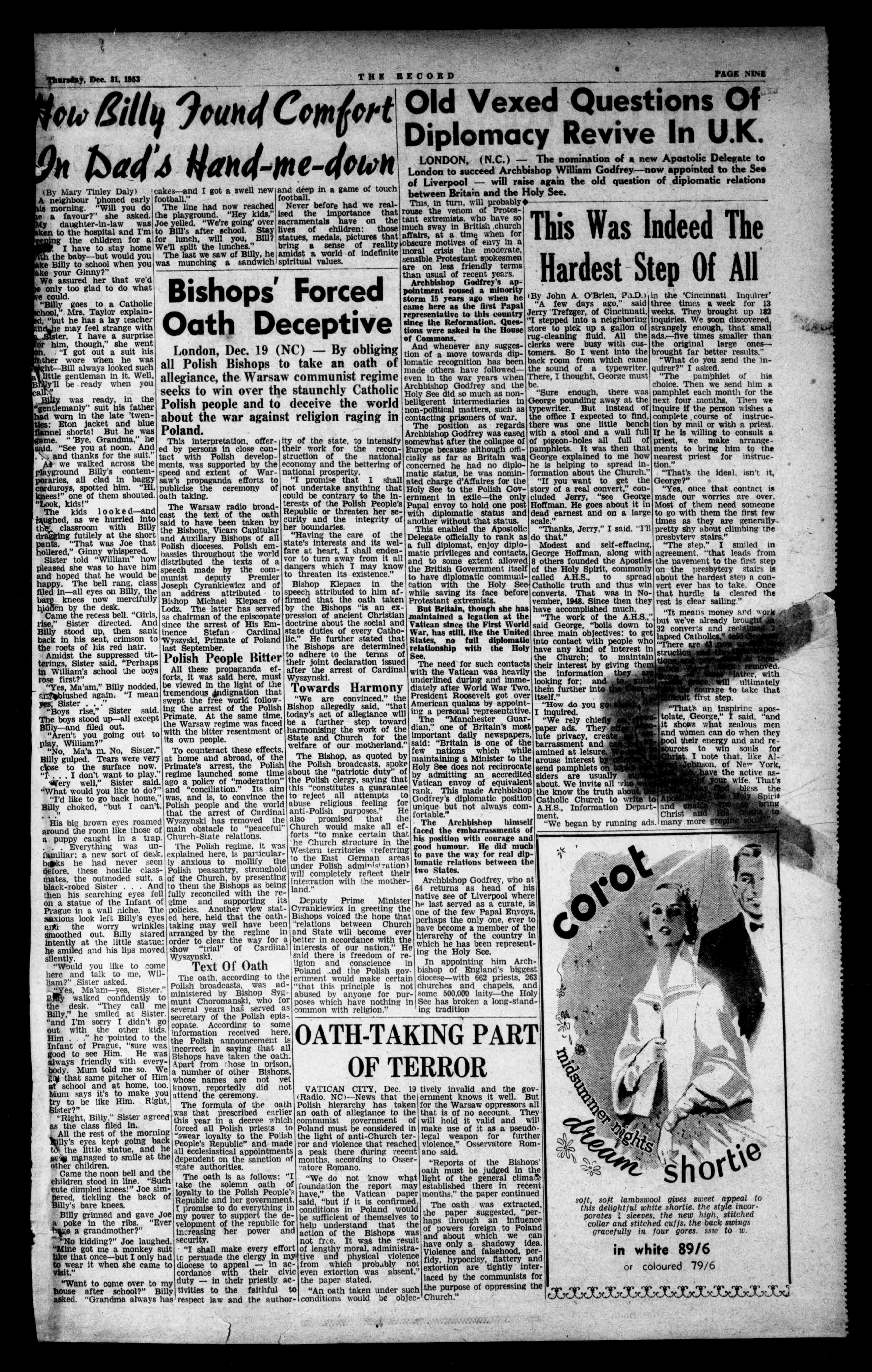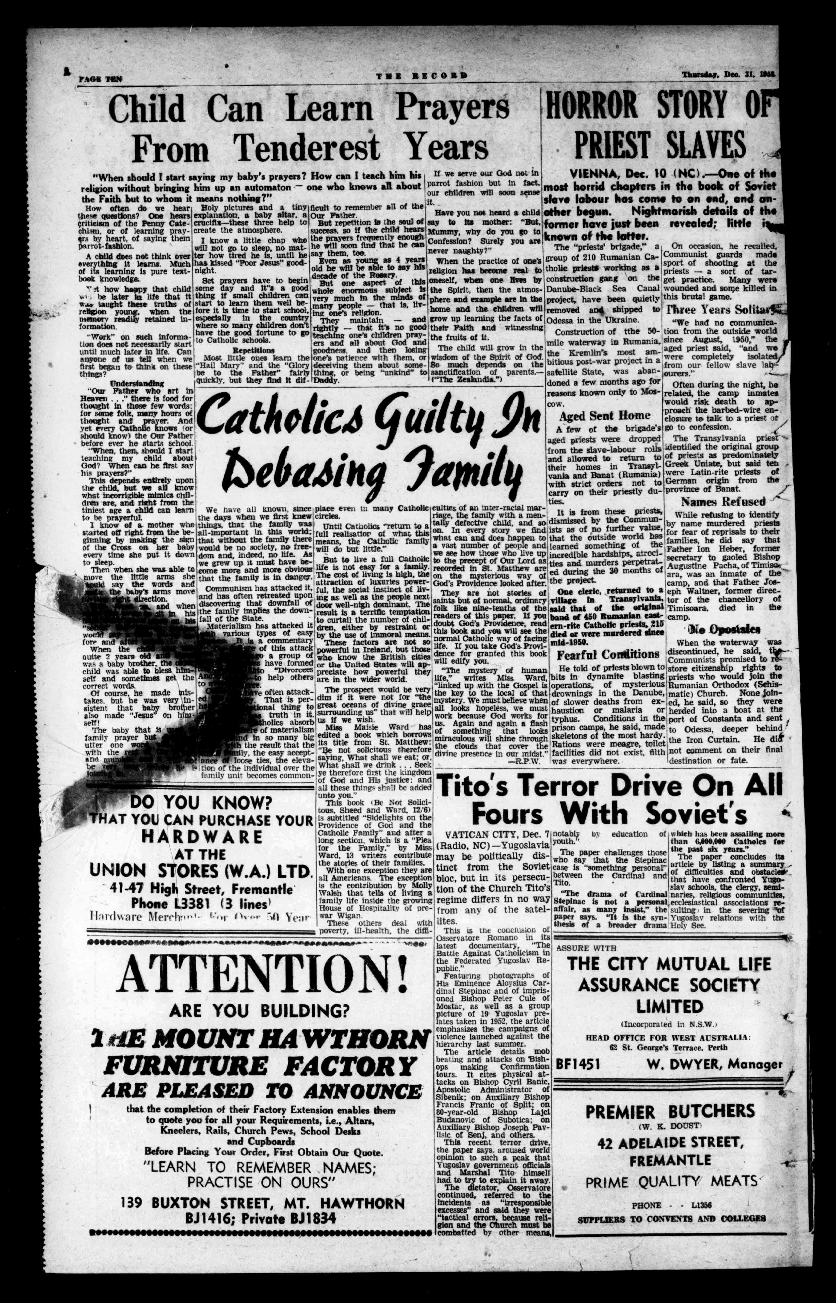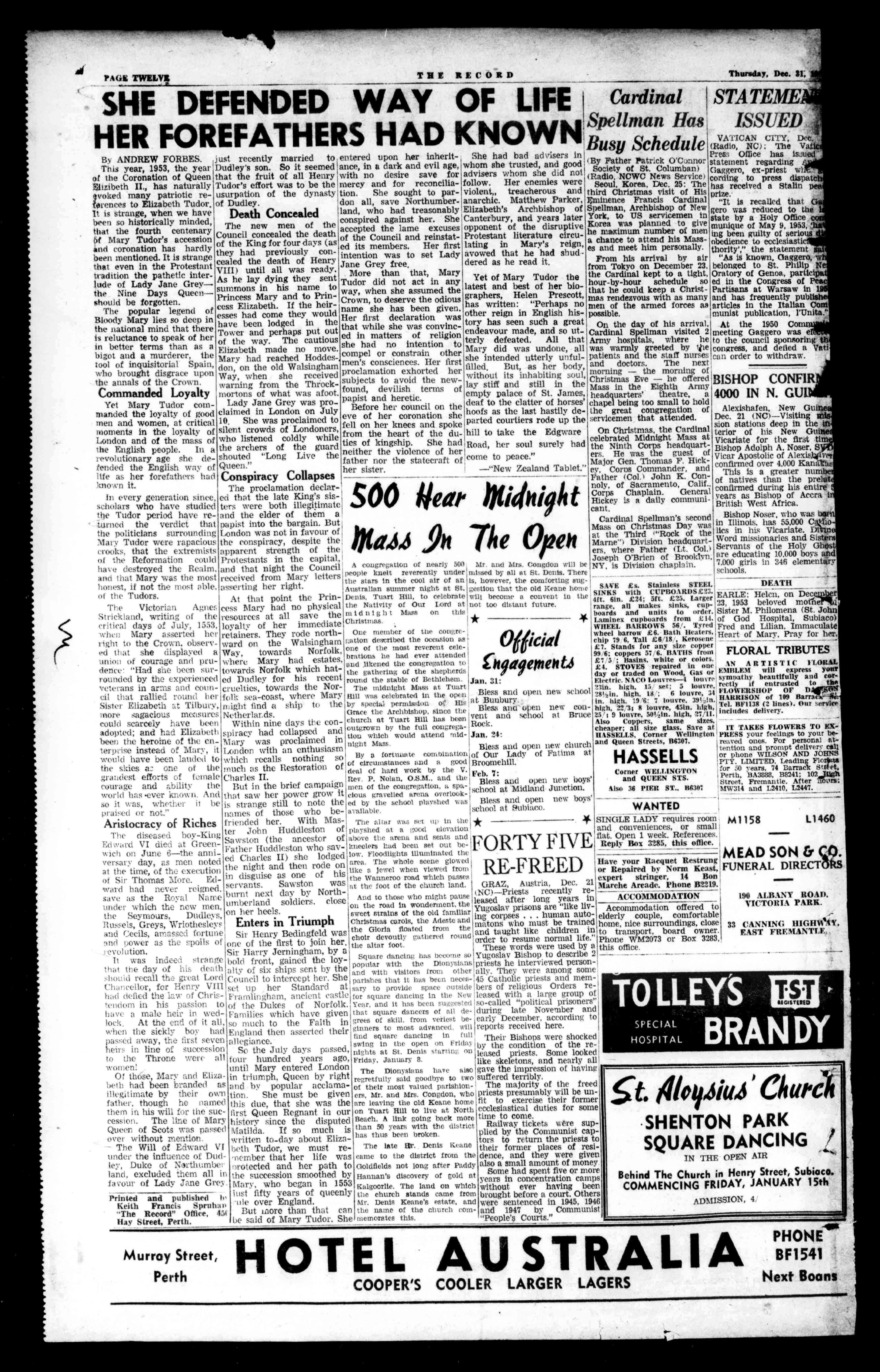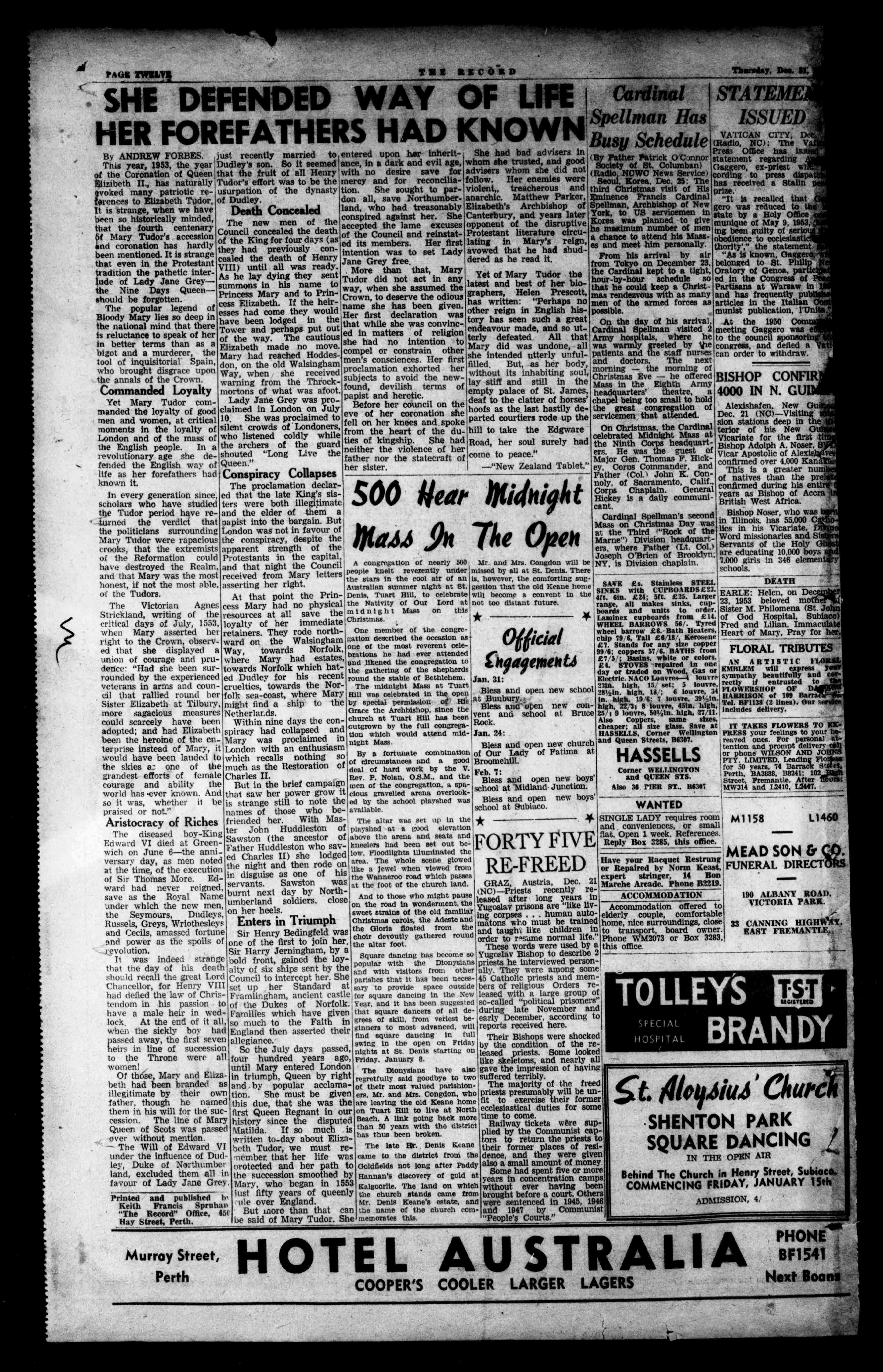 waspassedMatilda.Ifsomuchisthan50yearswiththedistrictRailwayticketsweresuppliedbytheCommunistcapoverwithoutmention. writtento-dayaboutEliza-hasthusbeenbroken. fortoreturntheprieststo -TheWillofEdwardVIbothTudor,wemustre-ThelateIlte.DenisKeanetheirformerplacesofresltindertheinfluenceofDud-memberthatherlifewascametothedistrictfromthedente,andtheyweregiven ley,DukeofNorthumbererotectedandherpathtoGoldfieldsnotlongafterPaddyalsoasmallamountofmoney land,excludedthemallinthesuccessionsmoothedbyHannan'sdiscoveryofgoldatSomehadspentfiveormore favourofLadyJaneGrey.Mary,whobeganin1553Kalgoorlie.Thelandonwhichyearsinconcentrationcamps Printedandpublishedtelustfiftyyearsofqueenlythechurchstandscamefromwithouteverhavingbeen liteoverEngland. broughtbeforeacourt.Others Mr.DenisKettne'sestate,andweresentencedin1945,1946 KeithFrancisSpruhao "TheRecord"Office,454 Butsnorethanthatcanthenameofthechurchcods-and1947byCommunist LiesaidofMaryTudor.SheHIemoratorthis. "People'sCourts" SHEDEFENDEDWAYOFLIFE HERFOREFATHERSHADKNOWNBusySchedul,,VATICANCITY,DeC. r(Radio,NC):TheVat ByANDREWFORBES.justrecentlymarriedtoentereduponherinherit- hadbadadvisersPressOfficehas statementregardingf Gagger°,ex-prlestwl cordingtopressdispaa.' hasreceivedaStalin prize. "Itisrecalledthat gentwasreducedtothe statebyaHolyOffice muldqueofMay9,1953, ing obediencebeenguiltyofserious ecclesiasti thorny',"thestatement:1