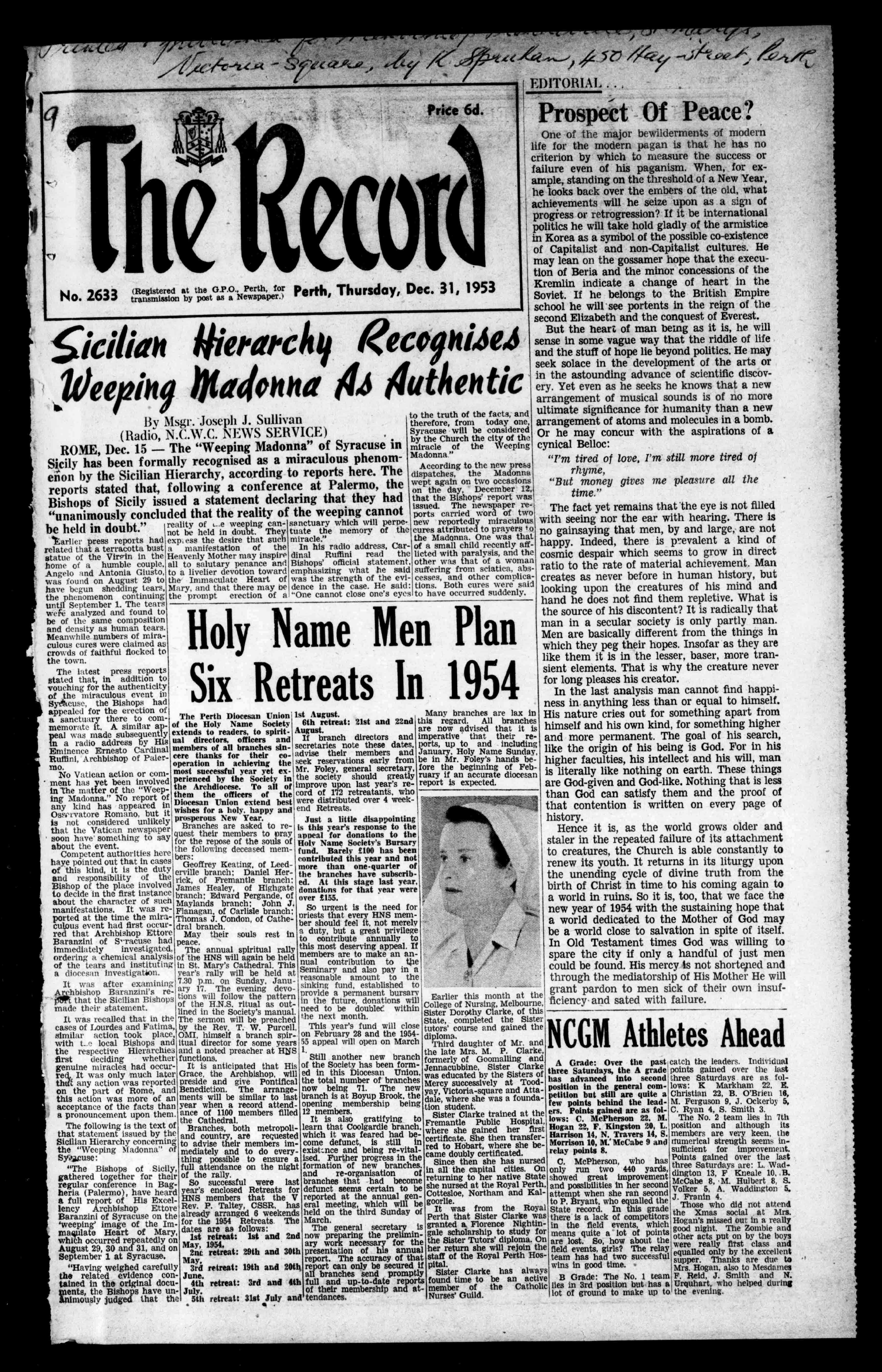 No.2633(RegisteredattheG.P.O.,Perth,forPerth,Thursday,Dec.31,1953 transmission