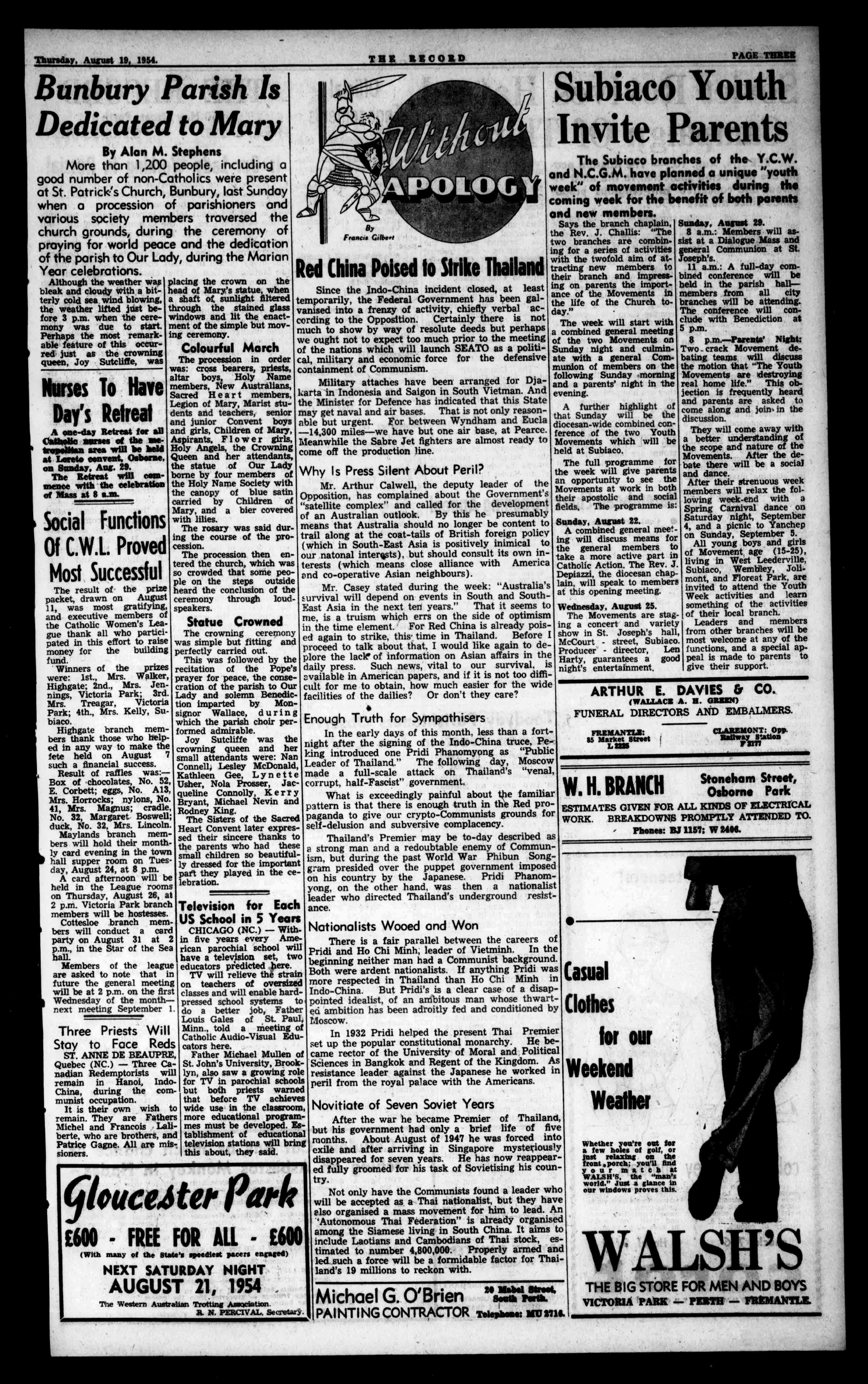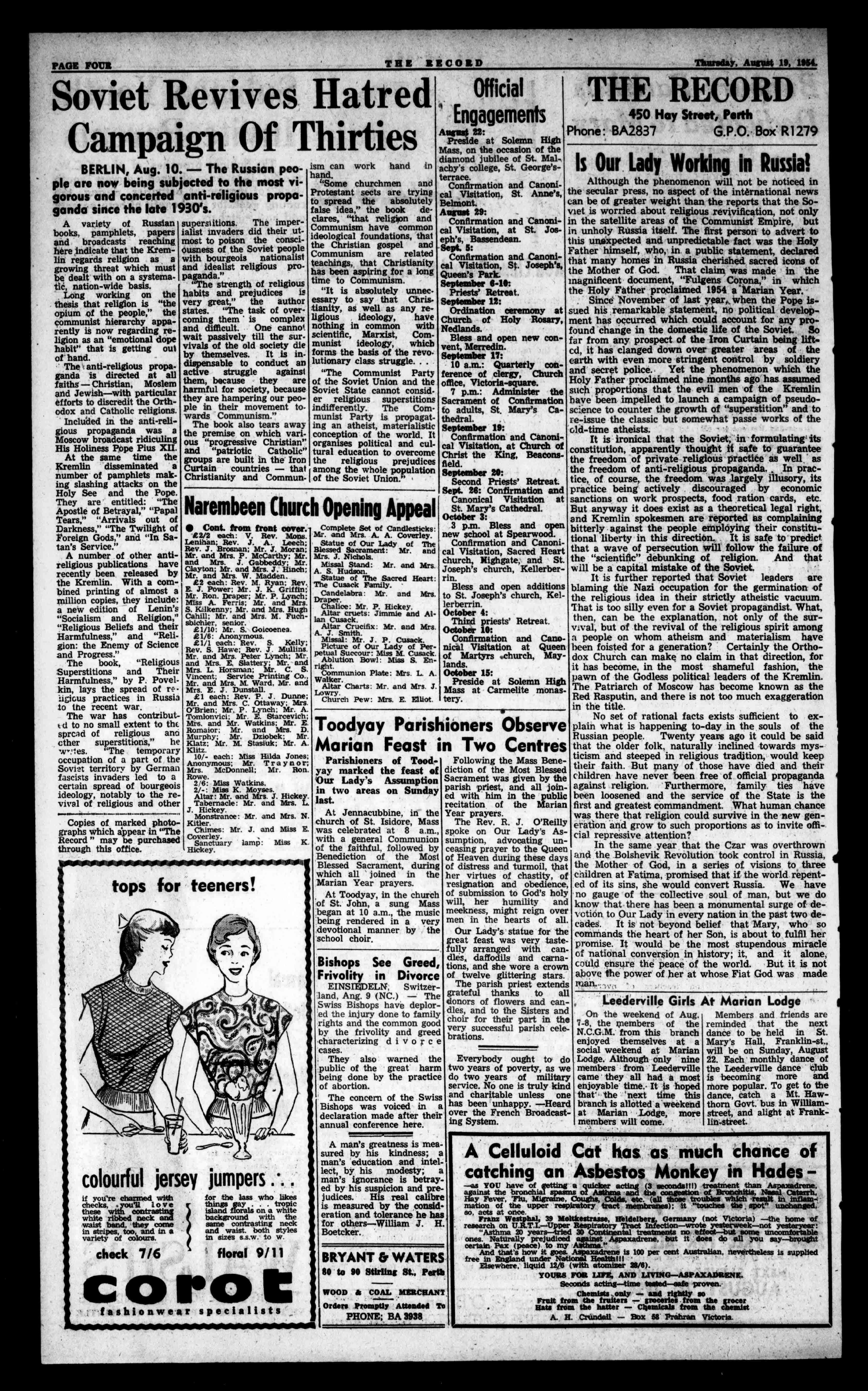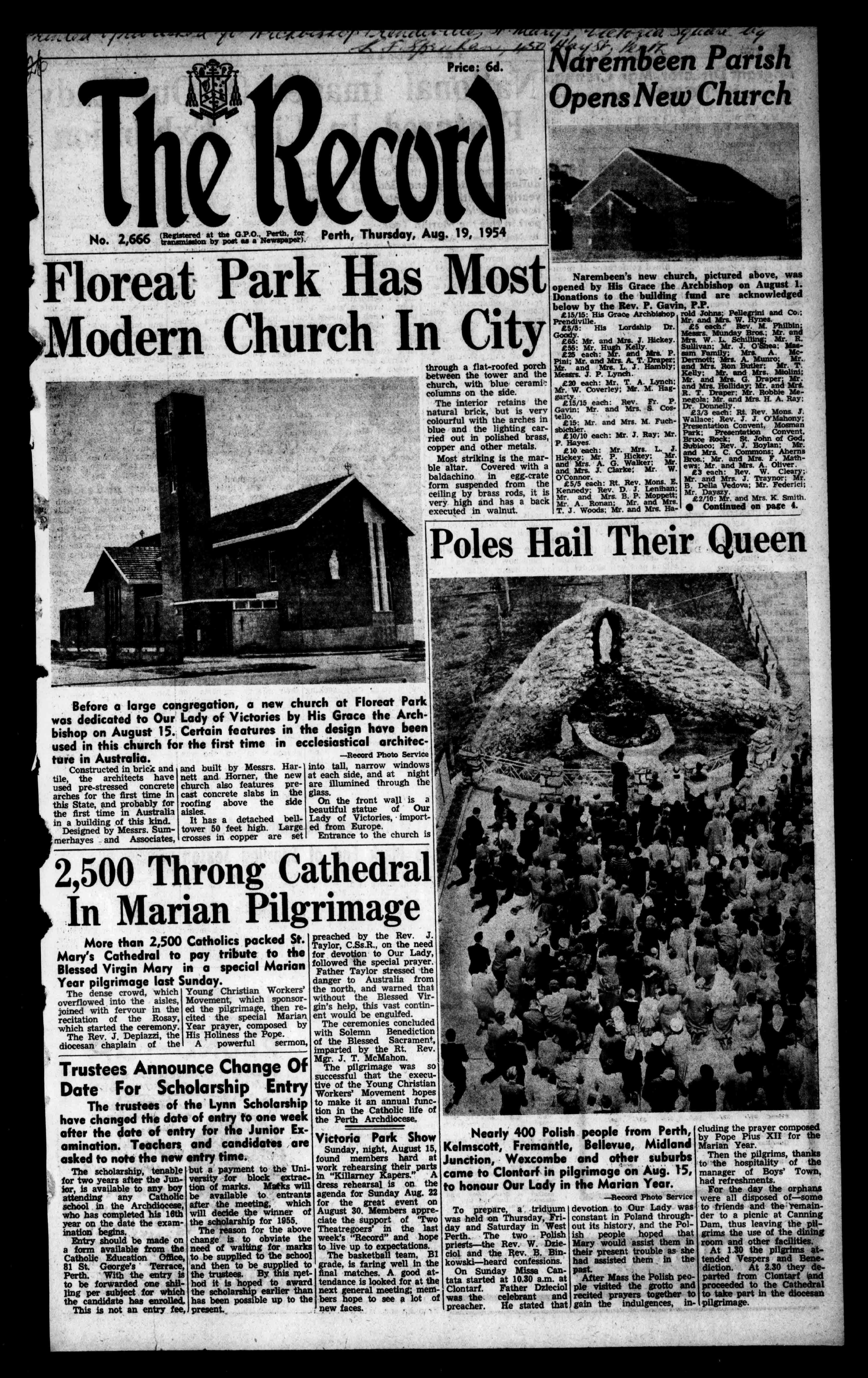 Beforealargecongregation,anewchurchatFloreatPark wasdedicatedtoOurLadyofVictoriesbyHisGracetheArchbishoponAugust15.Certainfeaturesinthedesignhavebeen usedinthischurchforthefirsttimeinecclesiasticalarchitectureinAustralia.