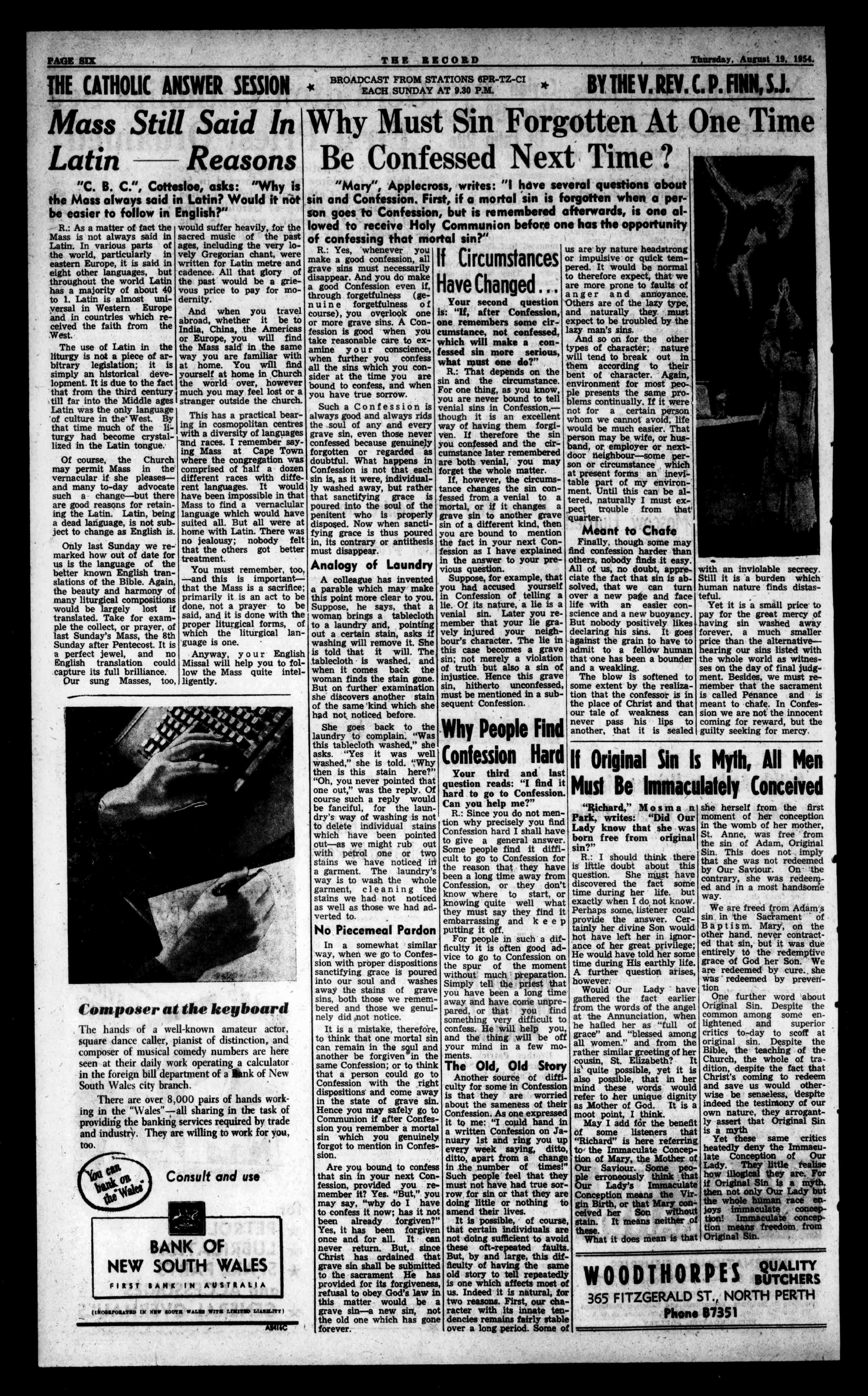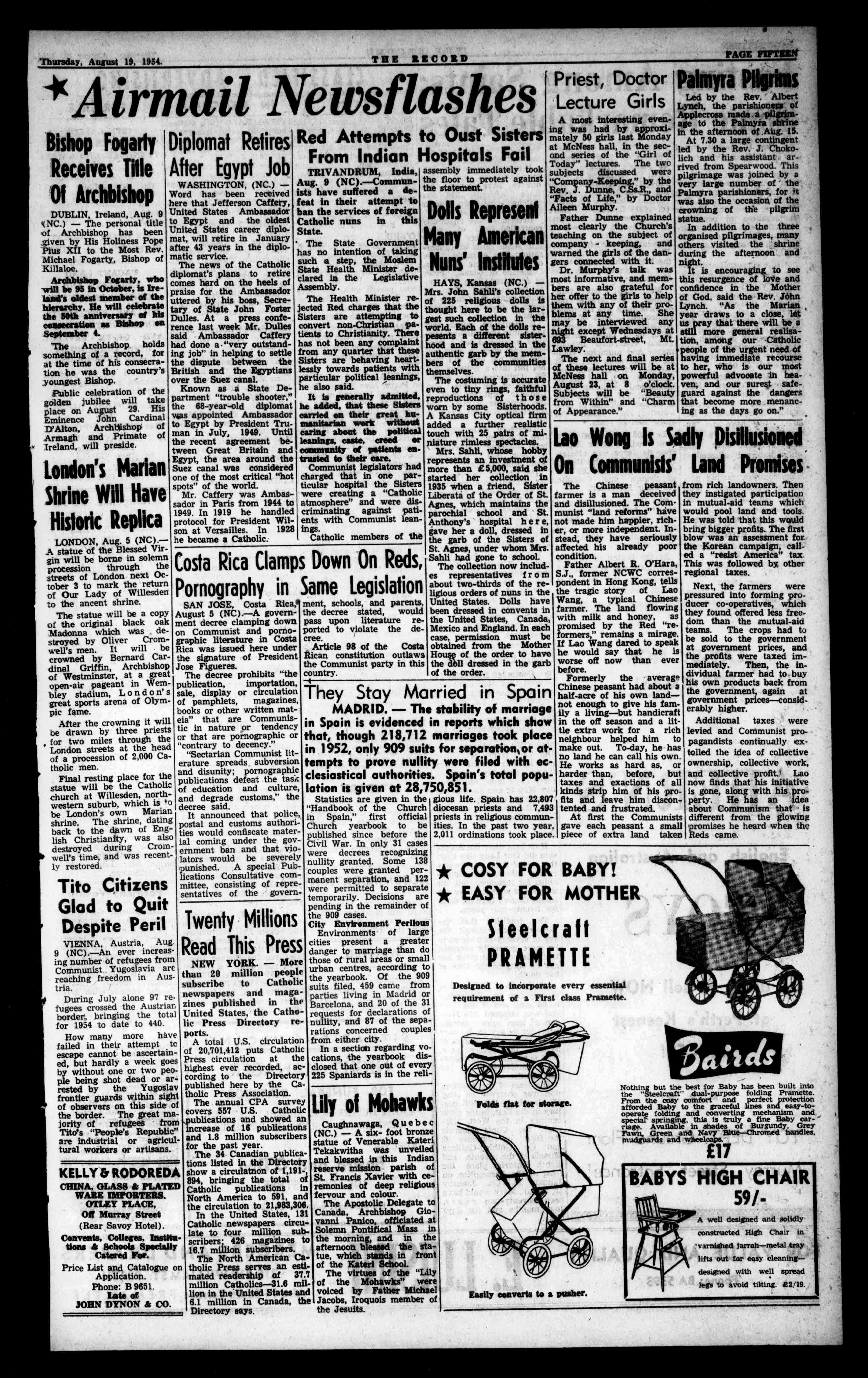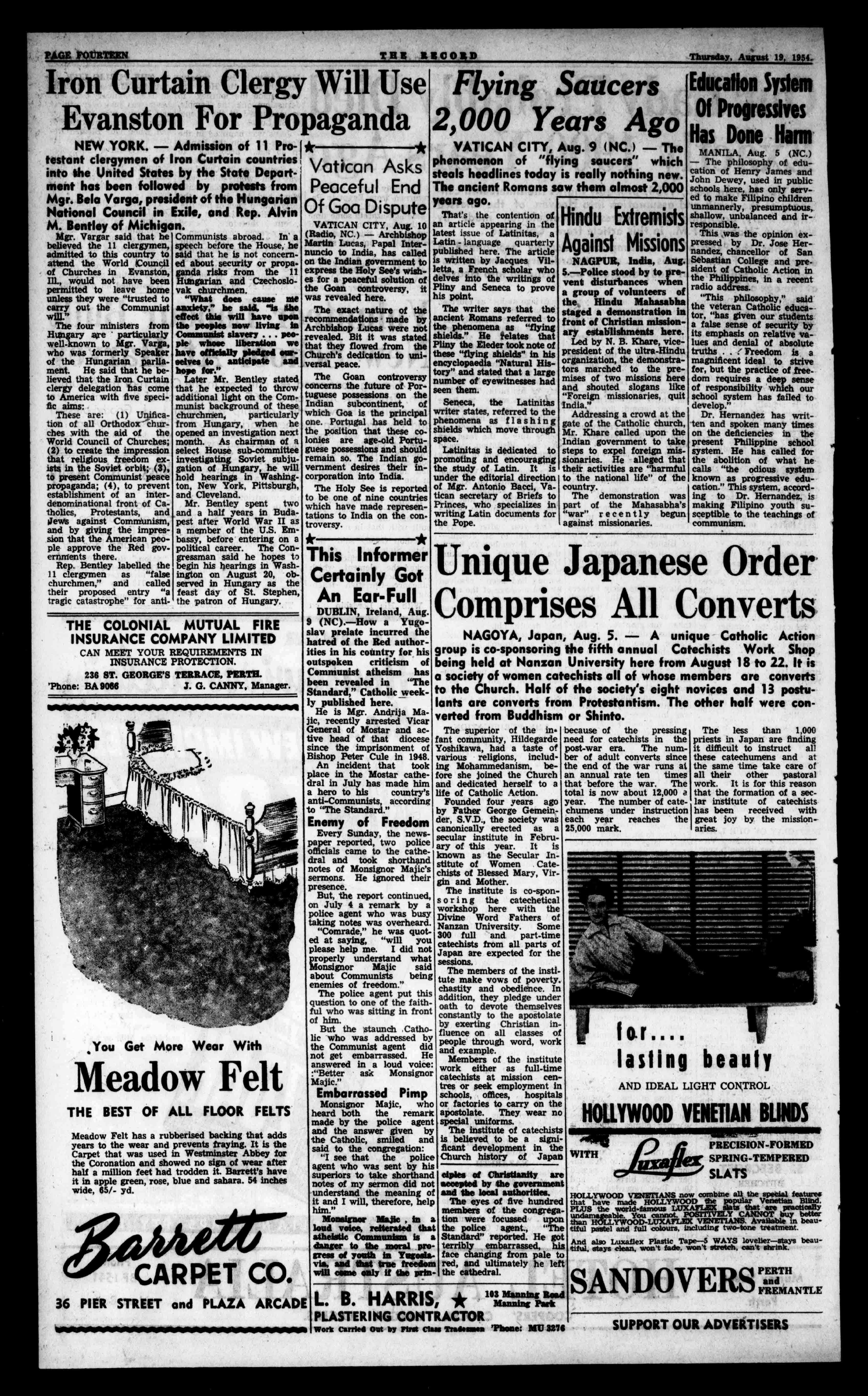 Beforealargecongregation,anewchurchatFloreatPark wasdedicatedtoOurLadyofVictoriesbyHisGracetheArchbishoponAugust15.Certainfeaturesinthedesignhavebeen usedinthischurchforthefirsttimeinecclesiasticalarchitectureinAustralia.
