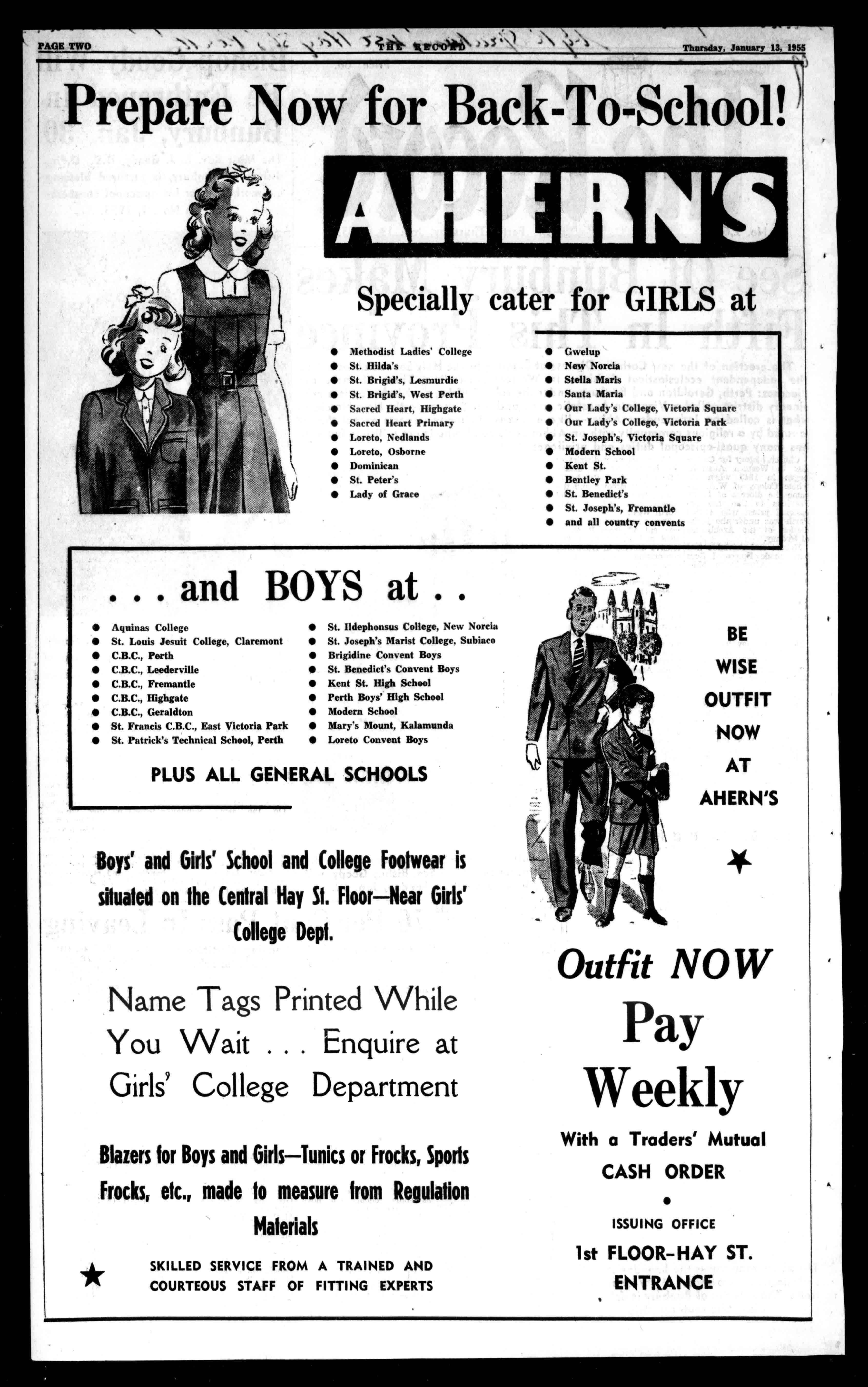 Owingtoourpresentpremisesbeingtoosmalltocopewiththelargevolume oftrade,wehavebeencompelledtotransferthebulkofourSchoolDepartmenttoamoresuitablepremises,sohavemadeportionofourstoreroom situatedatthebasementof36PierStreet,beneathBarrett'sCarpetShop, availableforourshowroom.HereMr.LeoRyan(lateofKalgoorlie)willbe inattendancetolookafterallyourschoolrequirements,whethertheybe smallorlarge.Schoolrequisitesmaystillbehadatourpresentshop,820 HayStreet,Perth,butforbulkrequirementsandlargeordersitwouldbe moreconvenienttocallatourPierStreetshop.