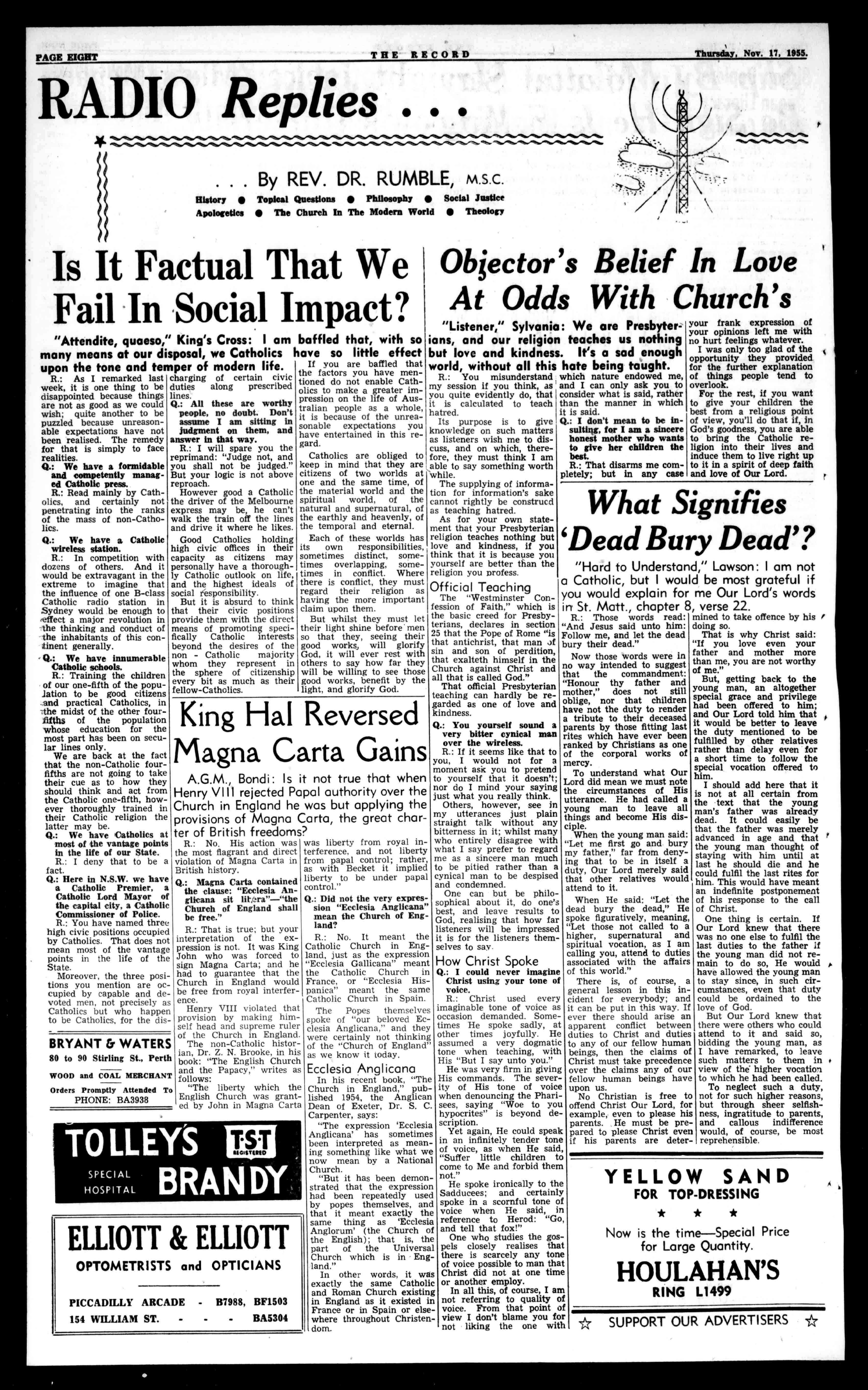RHEUMATICandARTHRITISsufferersareinvitedtocallandinterview ourCatholicConsultantwho willgiveyousincere,genuineandhelpfuladvice, andabetterunderstanding ofthebasiccausesofyour condition.Wherenecessary inadditiontoourPowder, simplebeneficialhome treatmentswillbesuggested andaswehaveachieved overan80%recordofsuccesswewillapproachyour particularcasewithevery confidence.Maywehave yours. A4weeks'Treatment course,Freeconsultation andadvice,fullinstructions andSpecialConcessionRate Vouchershouldyourcomplaintneedfurthertreatment,costsonly£1Post Free.CallorwriteSTRATTONSRHEUMATICPOWDERPty.Ltd.,Ground Floor,McNeilChrs.,9BarrackSt.PhoneB7910. SendstampwithoutobligationforFreeLiteratureand PROOFofoureffective DRUGFREEREMEDY.