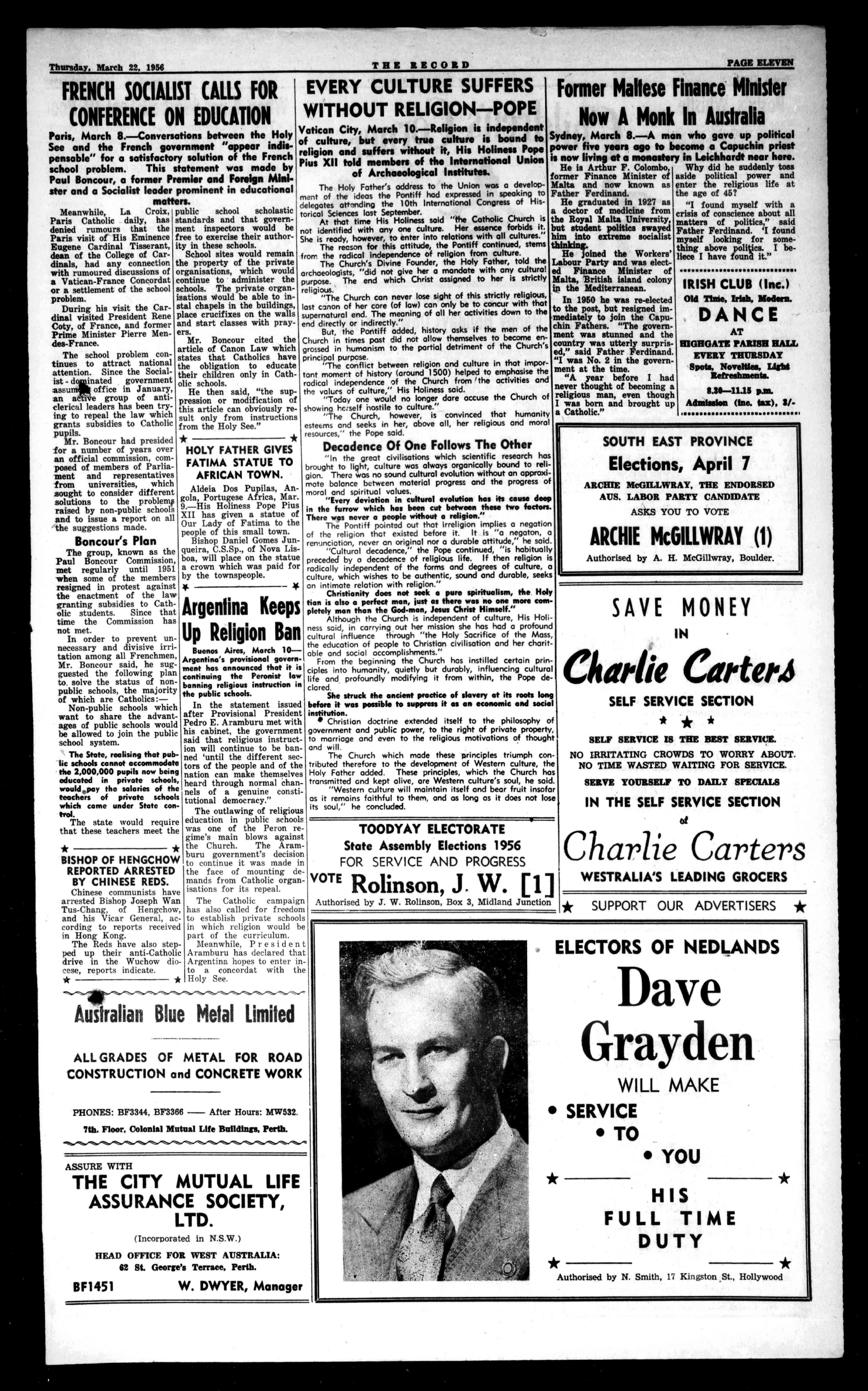 Mr.PatrickDanielFitzgeralddiedatSt.Johnof GodHospital,Belmont,on March20,attheageof'74 years. BornatNewNorcia,deceasedmarriedMissMary Lanigan,amemberofa verywell-knownfamilyin theVictoriaPlainsdistrict.