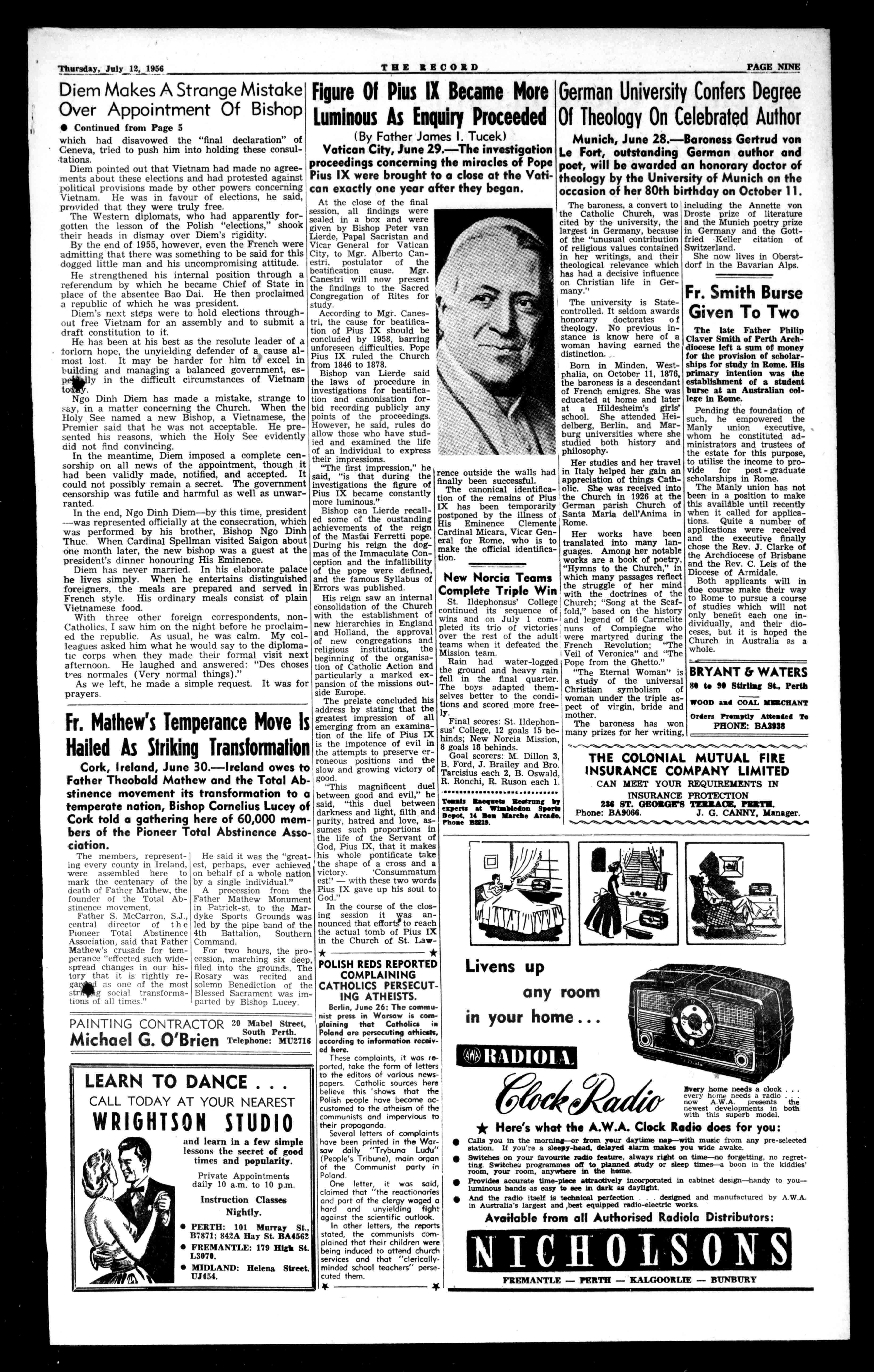 Thereportsherestatedyoungpeople,sangthe thatwhileRedpolicewereancientPolishhymn,"With patrollingthestreetsofGodforPoland'sFreedom," Poznan,Warsawandotherastheymarchedthroughthe largePolishcities,andar-streets. restsinPoznanmountedtoDespitethegeneraldis- 1,000,manythousandsoforder,however,itwasun- Polishpeoplecrowdedthederstoodthatthenewlyre- churchestoprayforfree-builtPoznancathedralwas dom. consecratedonscheduleon ThePoznanrevolt,whichthefeastofSs.Peterand beganatatimewhenmanyPaul,thedayaftertheriot- businessmenfromwesterningbegan. EuropewereinthecityforButbecausetheRedshad aninternationalfair,declaredastateofsiegein broughtaboutimmediatethecity,thecelebration reprisalsfromthecommun-plannedfortheconsecrationistregime,includingtheim-wascurtailedconsiderably. Positionofmartiallaw. stillShootingwasreportedlyArchbishopValentineDygoingoninthesub-mekofPoznan,whohas urbsofPoznanfivedaysbeenill,isnowinahospi- aftertheuprisingbegan,tal,itwaslearned,andthe althoughitwassaidthattheconsecrationwasperform- tankshadbeenwithdrawnedbyhisAuxiliary,Bishop fromthecentreofthecity.FrancisJedwabski. 0ne newspaperwomanThePoznancathedral whowasabletoreturntosufferedgravedamagedurBerlinafterattendingtheingWorldWarII,andits fair,saidthatthePoznanreconstructiontooktenyearsdemonstrators,mostofthemtocomplete.