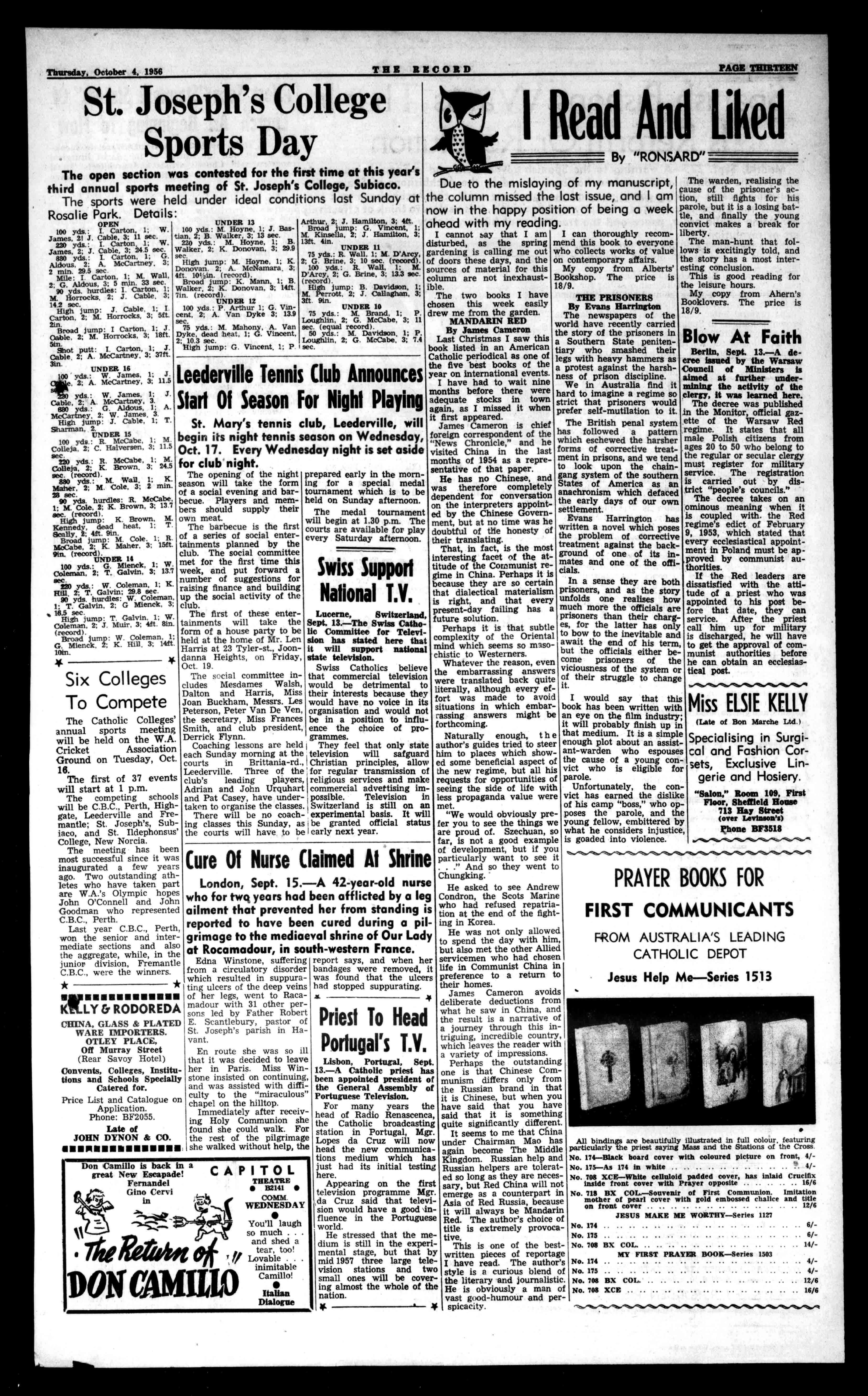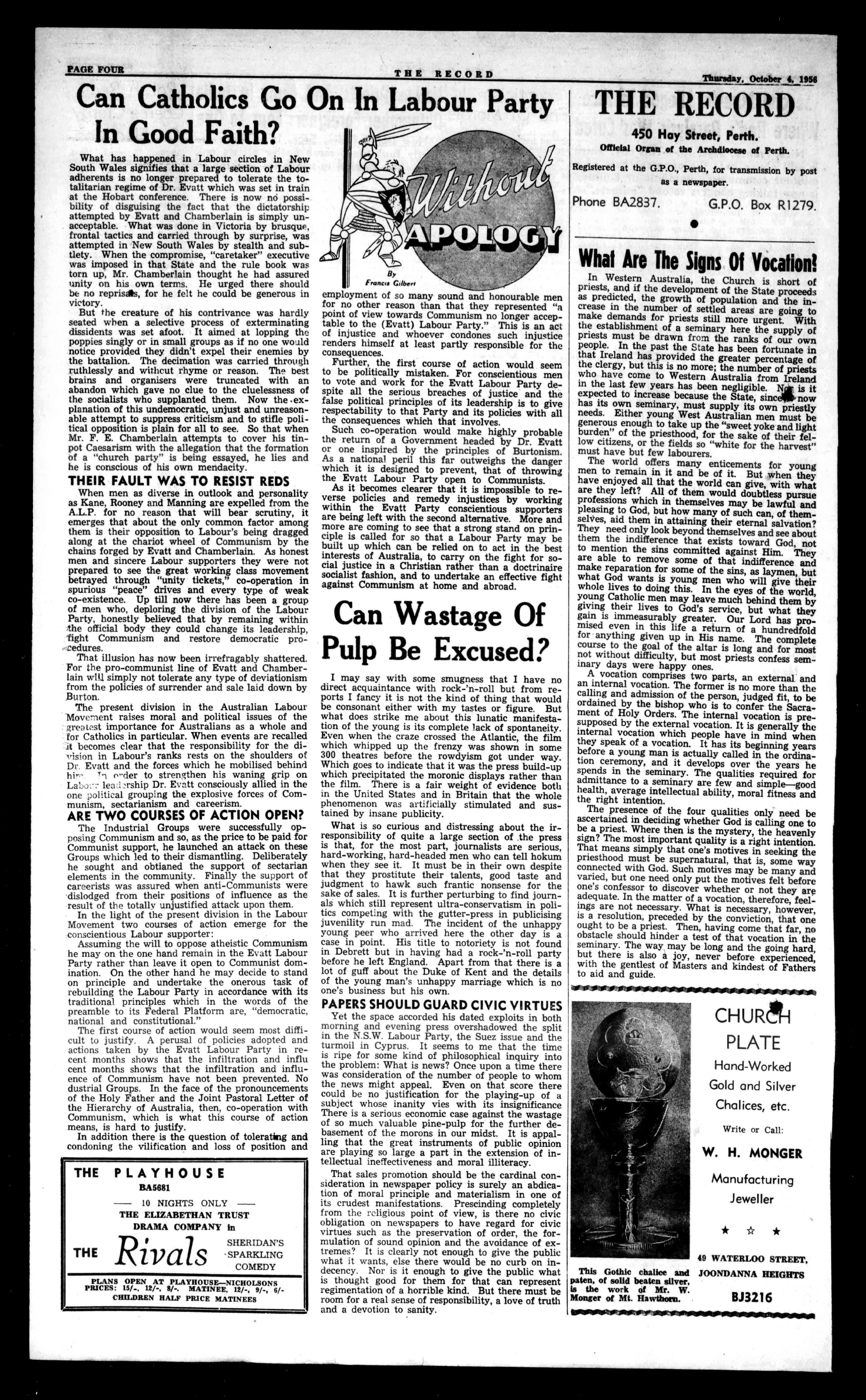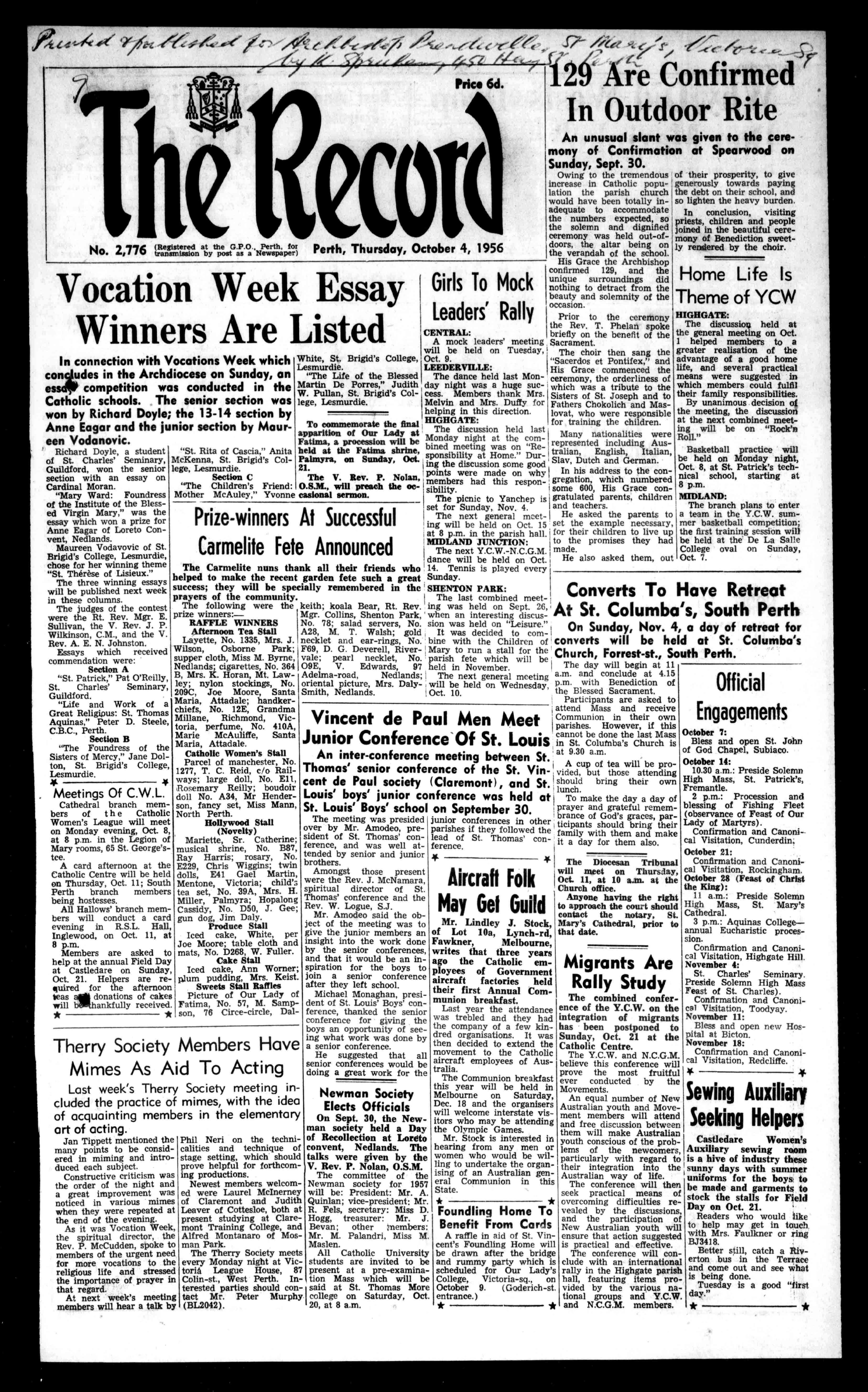 "LifeandWorkofa GreatReligipus:St.Thomas Aquinas,"PeterD.Steele, C.B.C.,Perth. SectionB "TheFoundressofthe SistersofMercy,"JaneDolton,St.Brigid'sCollege, Lesmurdie, 4 MeetingsOfC.W.L. CathedralbranchmembersoftheCatholic Women'sLeaguewillmeet onMondayevening,Oct.8, at8p.m.intheLegionof Maryrooms,65St.George'stce. Acardafternoonatthe CatholicCentrewillbeheld onThursday,Oct.11;South Perthbranchmembers beinghostesses. AllHallows'branchmemberswillconductacard eveninginR.S.L.Hall, Inglewood,onOct.11,at 8p.m. Membersareaskedto helpattheannualFieldDay atCastledareonSunday, Oct.21.Helpersarerequiredfortheafternoon teas donationsofcakes willbillthankfullyreceived.