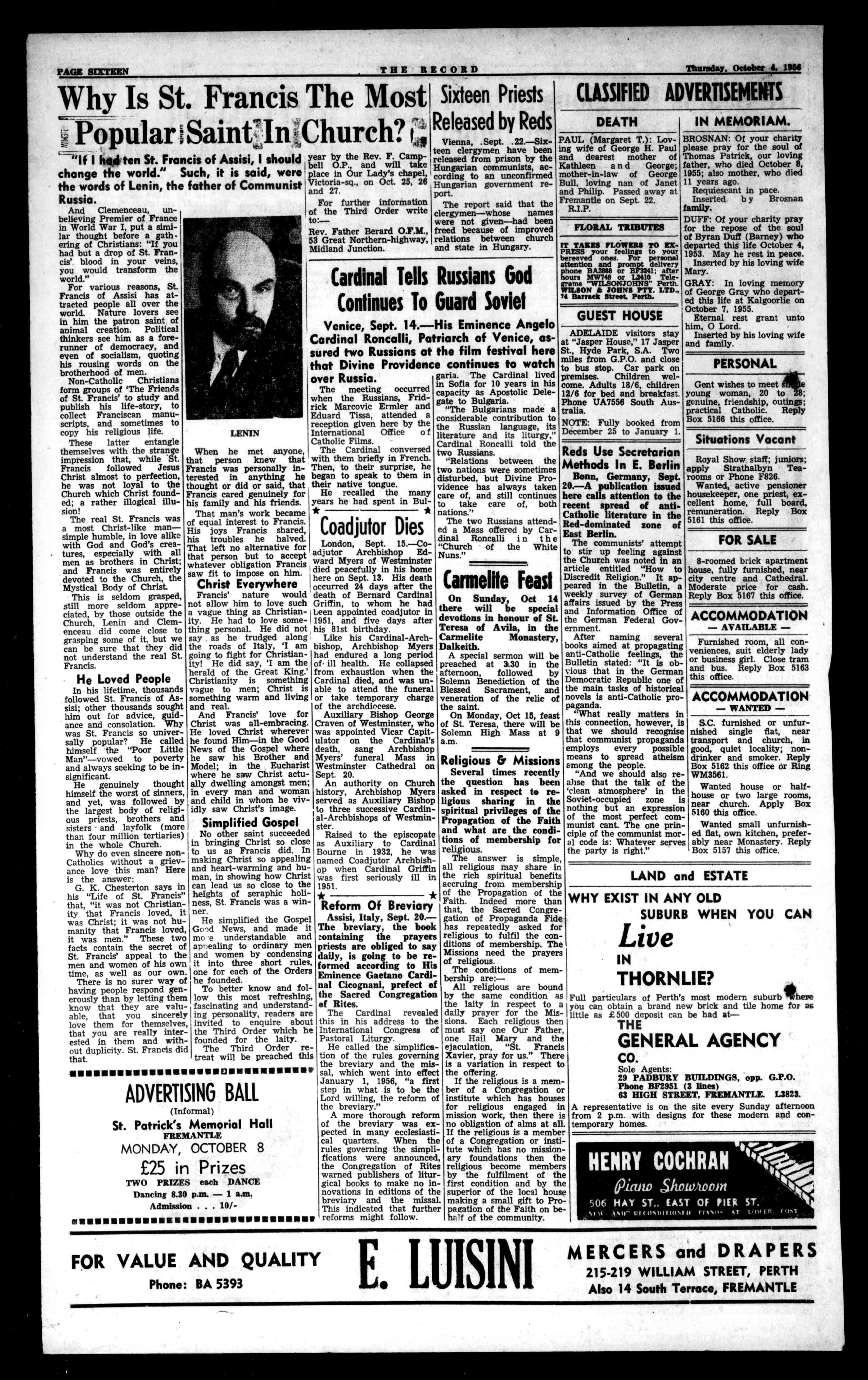 "IfIhtlititenSt.FrancisofAssisi,IshouldYearbaptheRedv.FillCatmap-releasedfromprisonbythe theworld."Such,itissaid,wereplaceinouranLad;;chapel,-cordingHungarian communists, m unconfirmedunists, ac- change thewordsofLenin,thefatherofCommunist'Victoria-sq.,onOct.25,26Hungariangovernmentreand27. port. Russia.