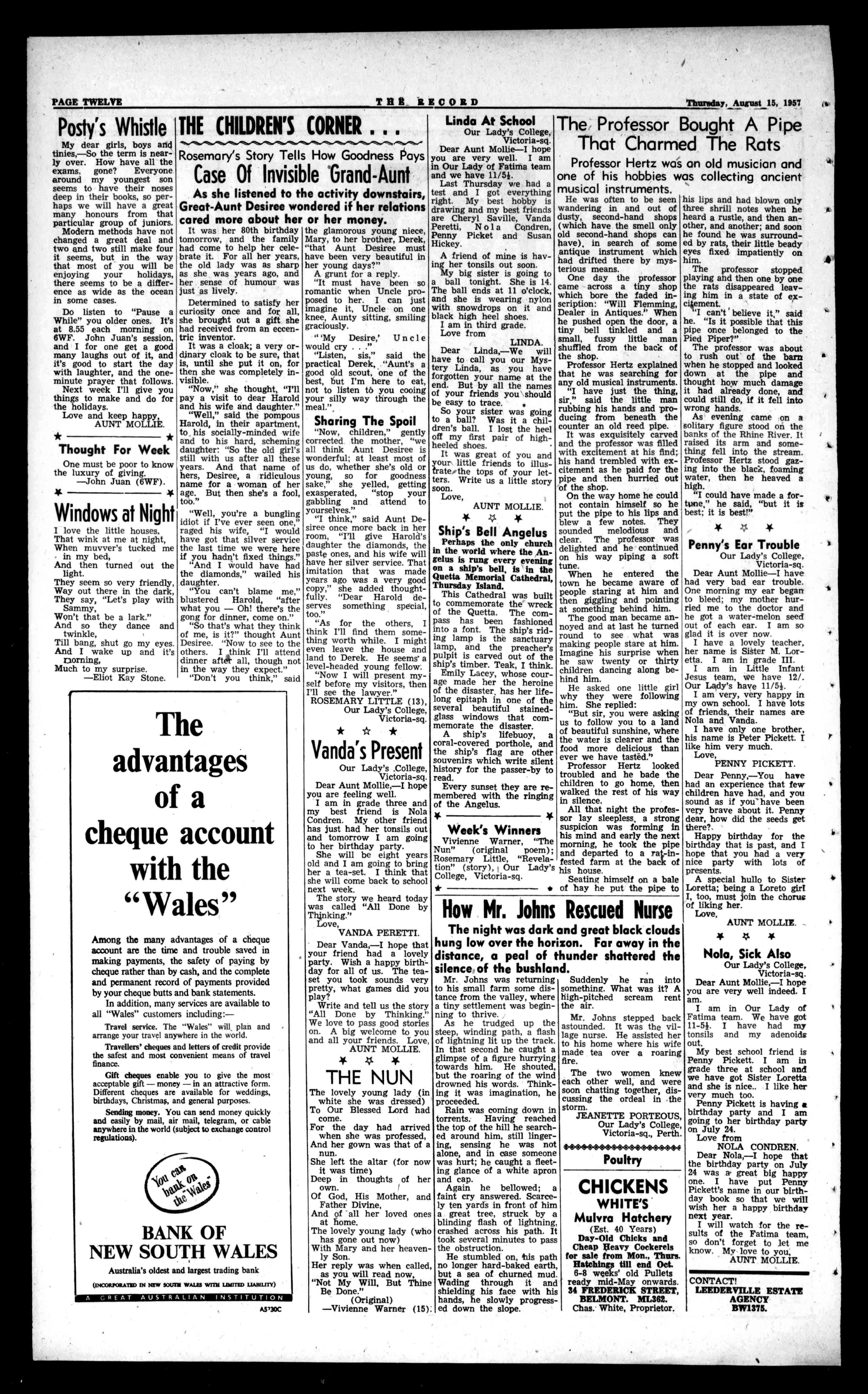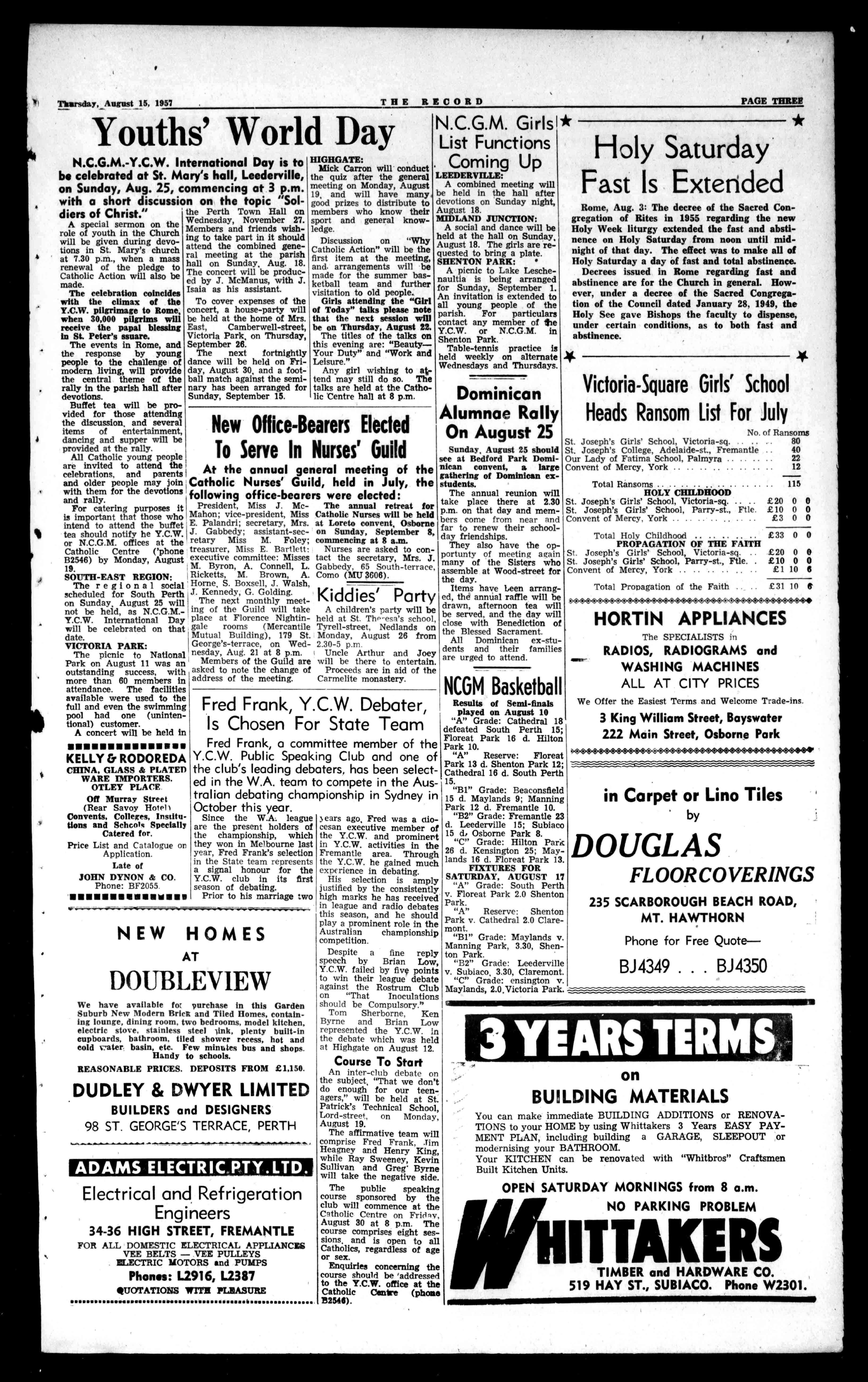 MOTORS 989HAYST.,PERTH BA4986. AfterHours:WU1843. 84CONSULsedan,withradio, oneowner,inwonderful conditionandappearance at 1676 13ZEPHYRsedan,withlatest push-buttonradio,small mileage;oneowner,intiptopcondition £695 54JAGUARMARK7sedan, oneowner,w/radio,mechanicallyperfect £1.245 62HOLDENsedanoneowner, appearanceandmechanical conditionofvehicleisperfectionat £595 51PEUGEOTsedan,mechanicallysound,veryracelittle car,only £195 51PREFECTsedan.MechanicalconditionAl.Asnap at £245 50HOLDENsedanfittedwith newrings,veryattractive car £525 49STANDARDtourer(Illod) Thisisreallybargainbuying 1195 46HILLMANMINXsedan, withnewshortmotor.This isabargainat £265 3$MORRIS8tourer,thebest wehaveeverhandled£1711 36ROVER12sedan,motor completelyoverhauled.This Lourspecial 1145 STOCKWANTED URGENTLY FreeAccident&Sickness InsurancewithallH.P. Trade-insAccepted. BA4986. AfterHours:W171843. RomanCatholicfoster homerequiredurgentlyfor 15-year-oldgirlattending school.PleaseapplyChild WelfareDept.(BF1921). ForSale FloreatPark,gobdposition,twobedroomhome, 31yearsold.PhoneWU1832. GuestHouse ADELAIDEvisitorsstay at"JasperHouse,"17Jasper St.,HydePark,SA.Two milesfromG.P.O.andclose tobusstop.Carparkon premises.Childrenwelcome.Adults18/6,children 12/6,forbedandbreakfast. PhoneUA7556,SouthAustralia. Dominican Reunion WOODSTREET, BEDFORDPARK 2.30p.m.,Sunday,Aug.25. WOOL GrowersConsign toPREYOST&CO. FREMANTLE FULLMARKETRATES PAID. NoCommissionCharges. YourWoolvaluedby Expertswithoutobligation