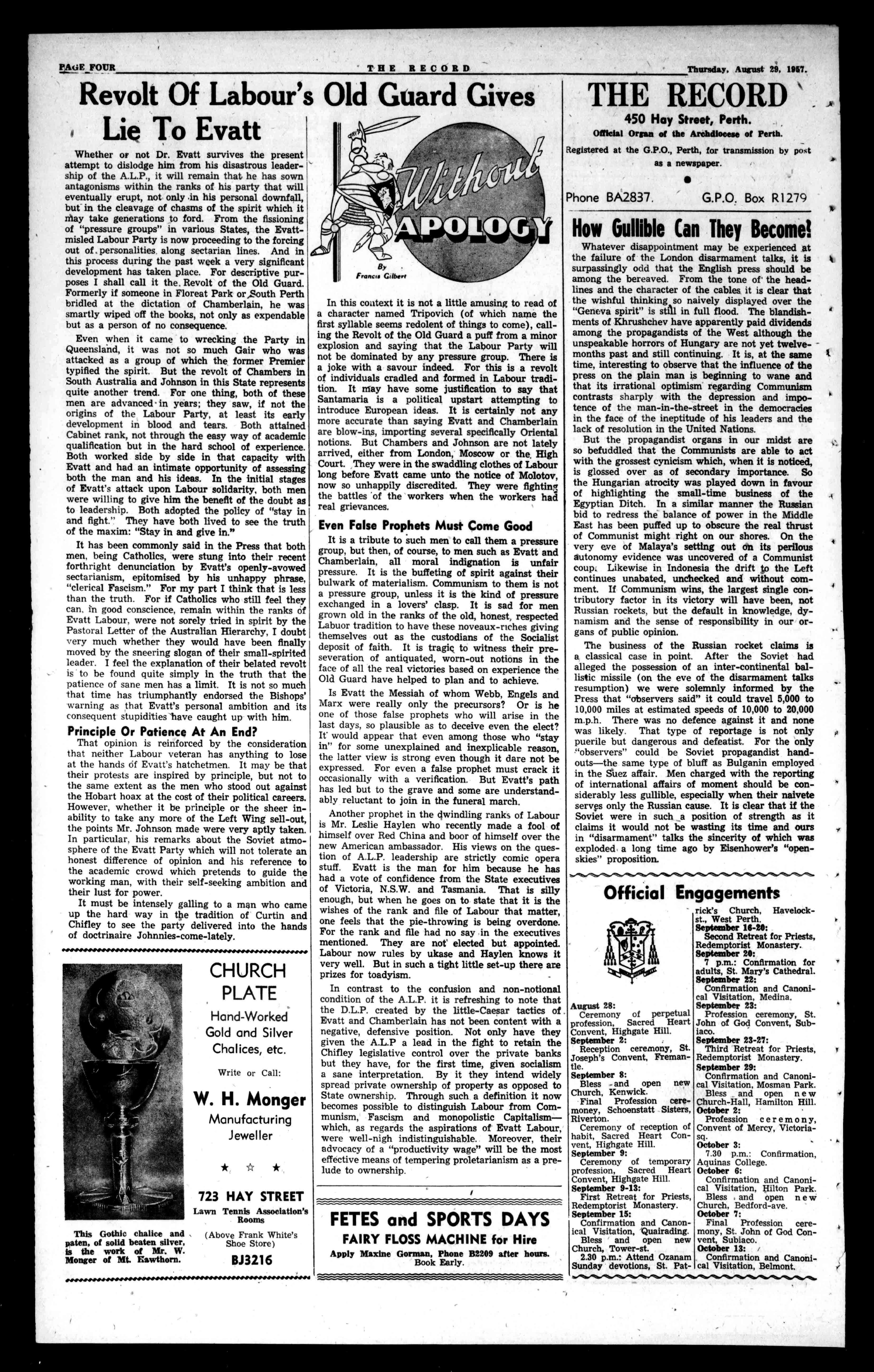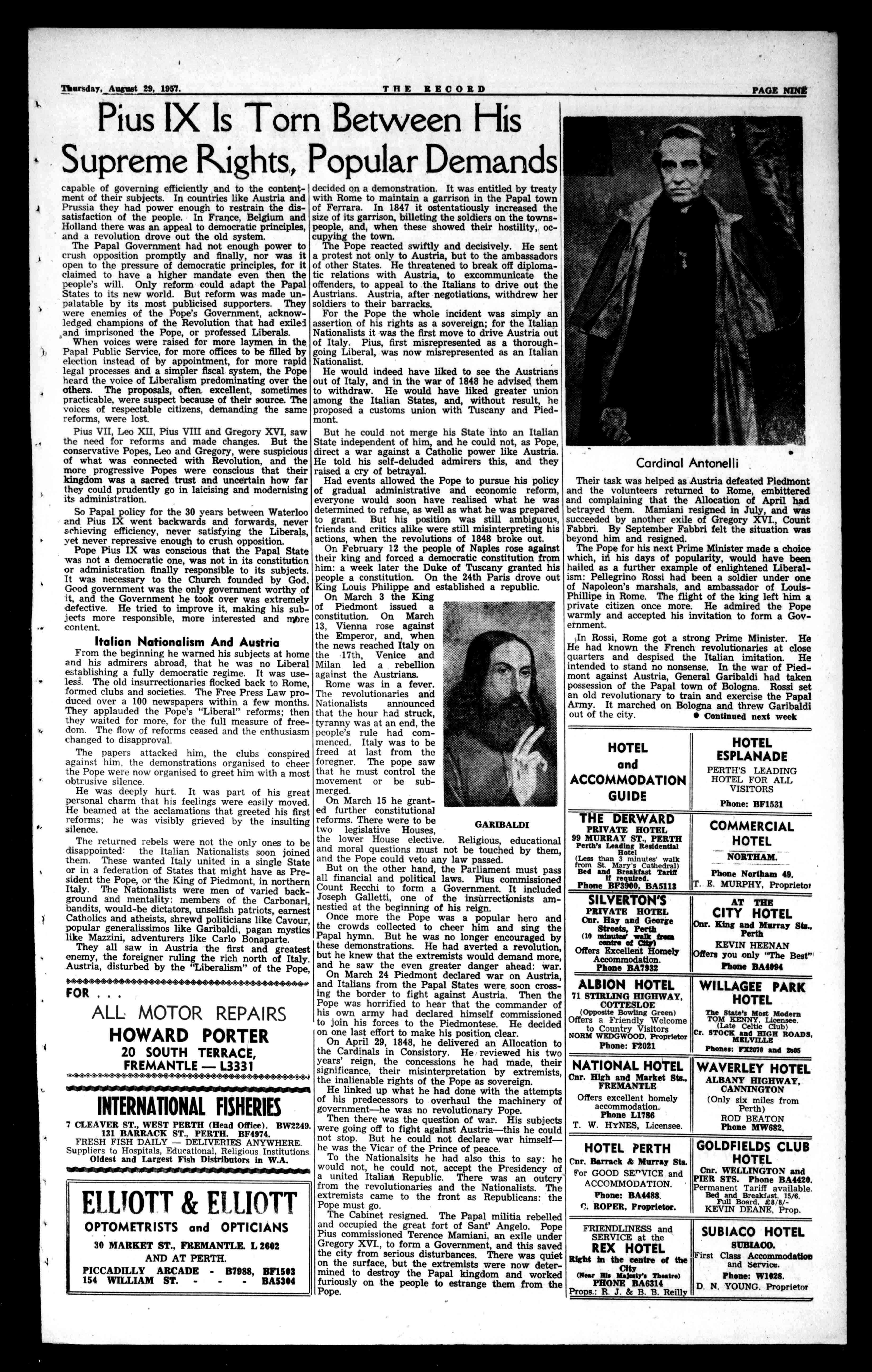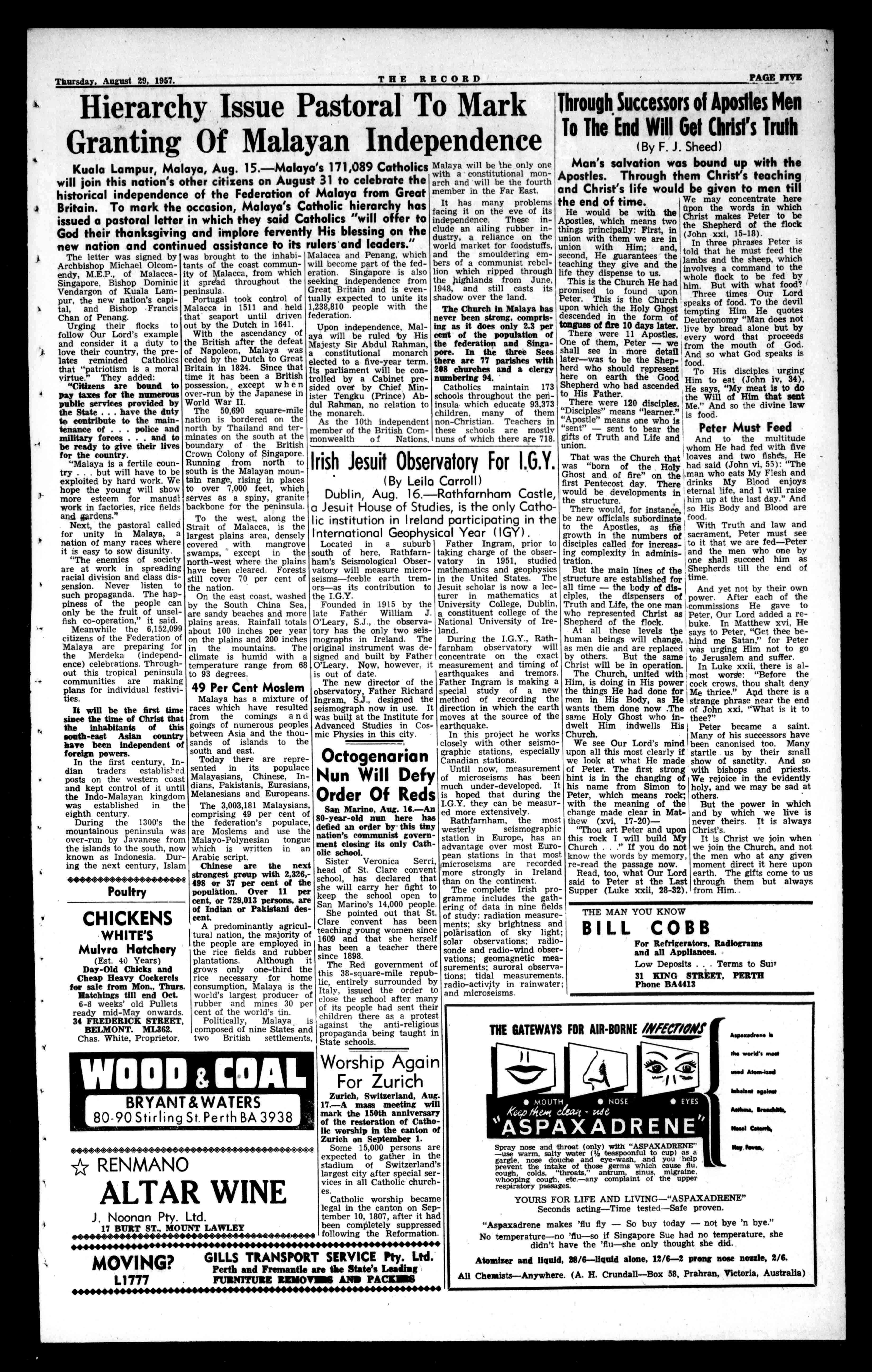 AUSTRALIA'S PREMIER ANTISEPTIC Pine-O-Cleen Availablein 20oz.bottle 1gallontin 4gallondrum 44gallondrum OxfordPolishCo.(W.A.) Pty.Ltd.-BF1089. Ad,eiee.4.0, 4,re4r/No.2821(RegisteredattheG.PO..Perth,for transmissionbypostasaNewspaper) Price6d. Thursday,August29,1957 -e-c=/eLze_ I IFBUILDING .HASSELLS WILLSAVEYOU££E's onstoves,baths.sinks,cupboards andallplumbingandbuildingmaterials. WHITETILES,39/6Yard Justarrived-Spanishand GermanTiles-allcolours. AlsoMosaicFloorTiles. HASSELLS havefirstqualitybaths,£26, pedestalbasins.£14/10/,all colours HASSELLS onlyhavestainlesssteelsinks3ft to7ft.long,sinkcupboards4ft., £6/2/6;41t.6in..£6/13/6;51t., £.7/10/,allsizesandtoorder. Whypaymore,specialconsiderationtoreligiousorganisations. HASSELLSBUILDINGS,553to561 WellingtonStreet.BF2477. "Australia'sBoldAdventure" PolishNunsOfTheHolyFamily OfNazarethToFoundKindergarten