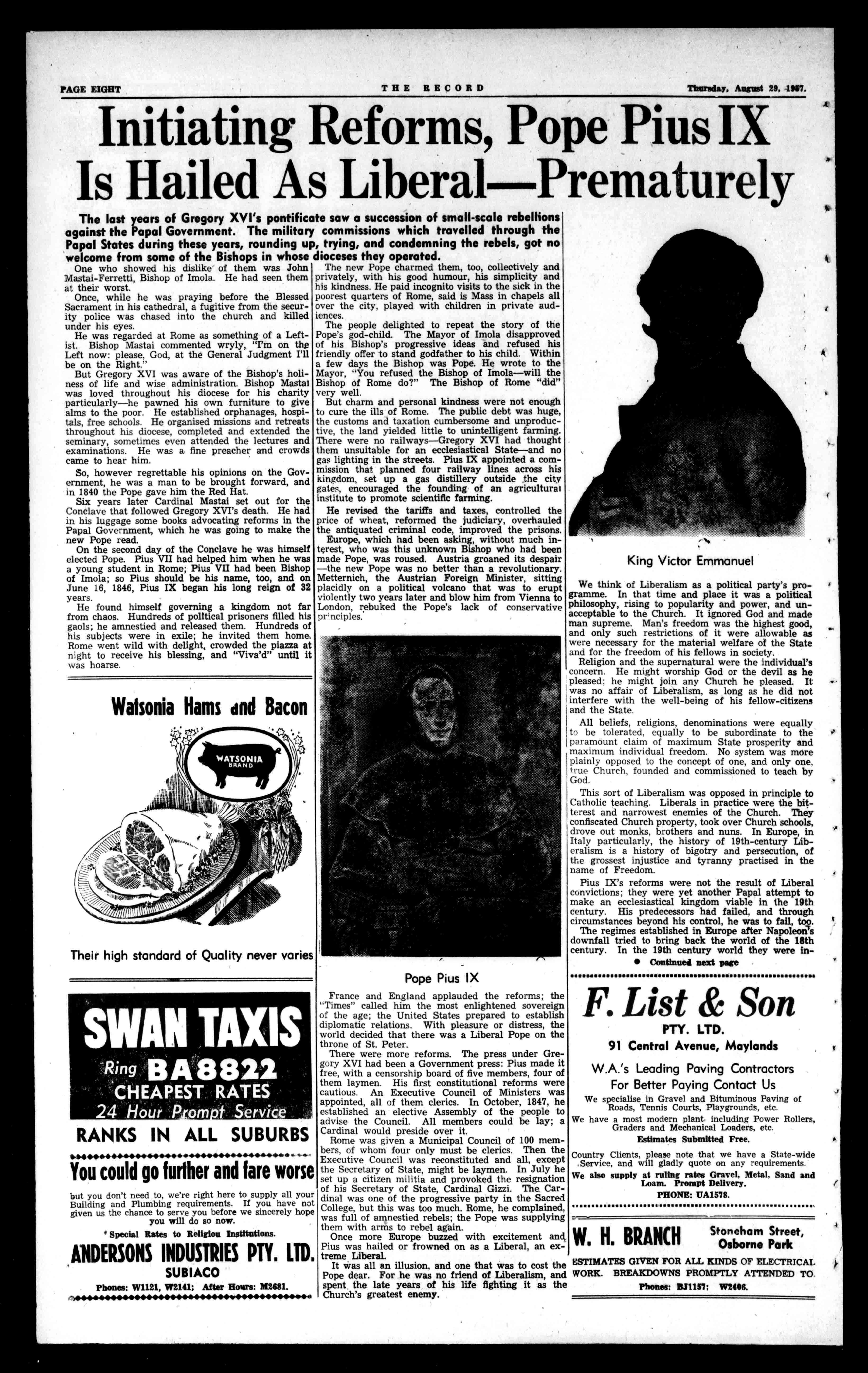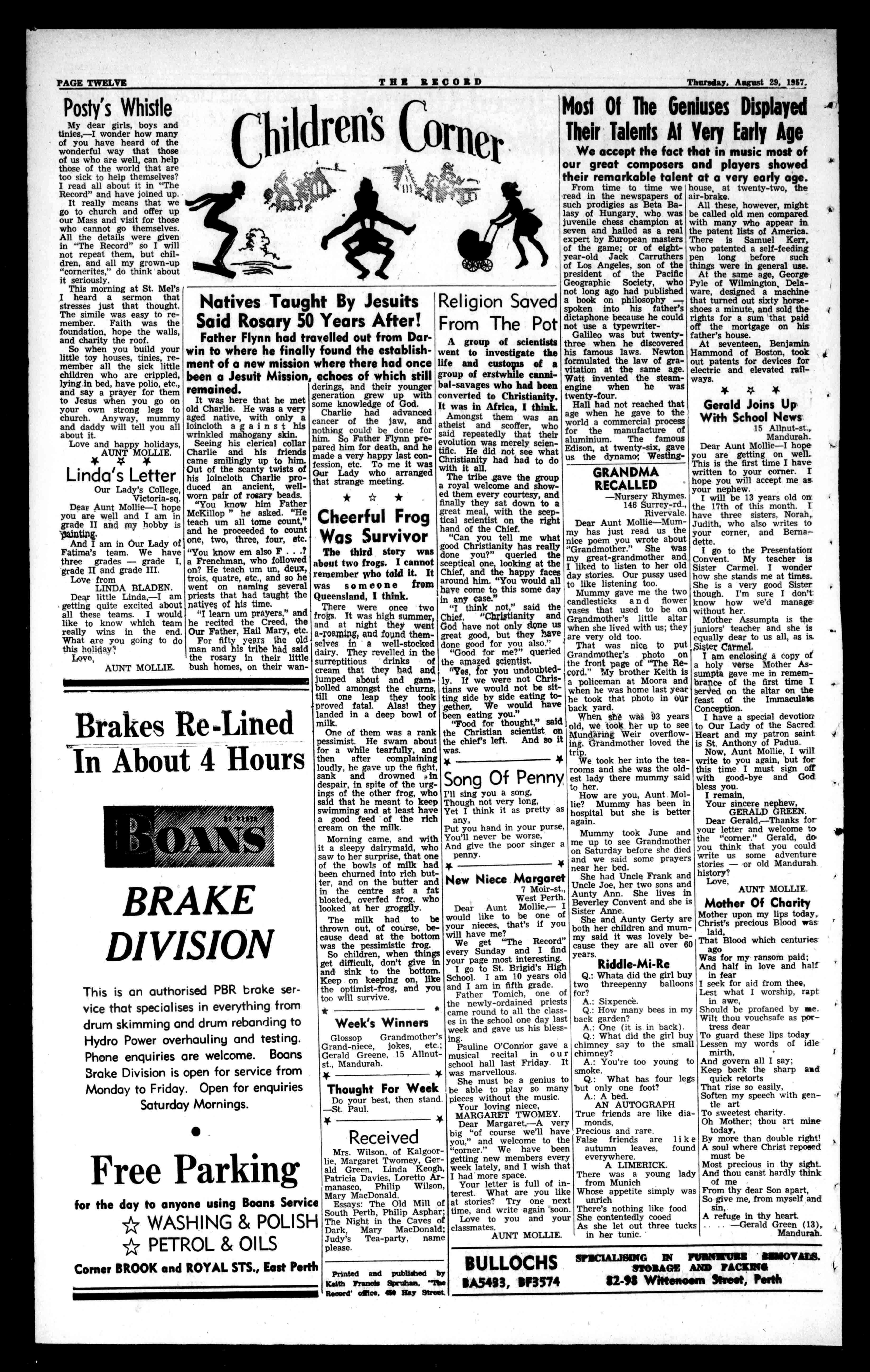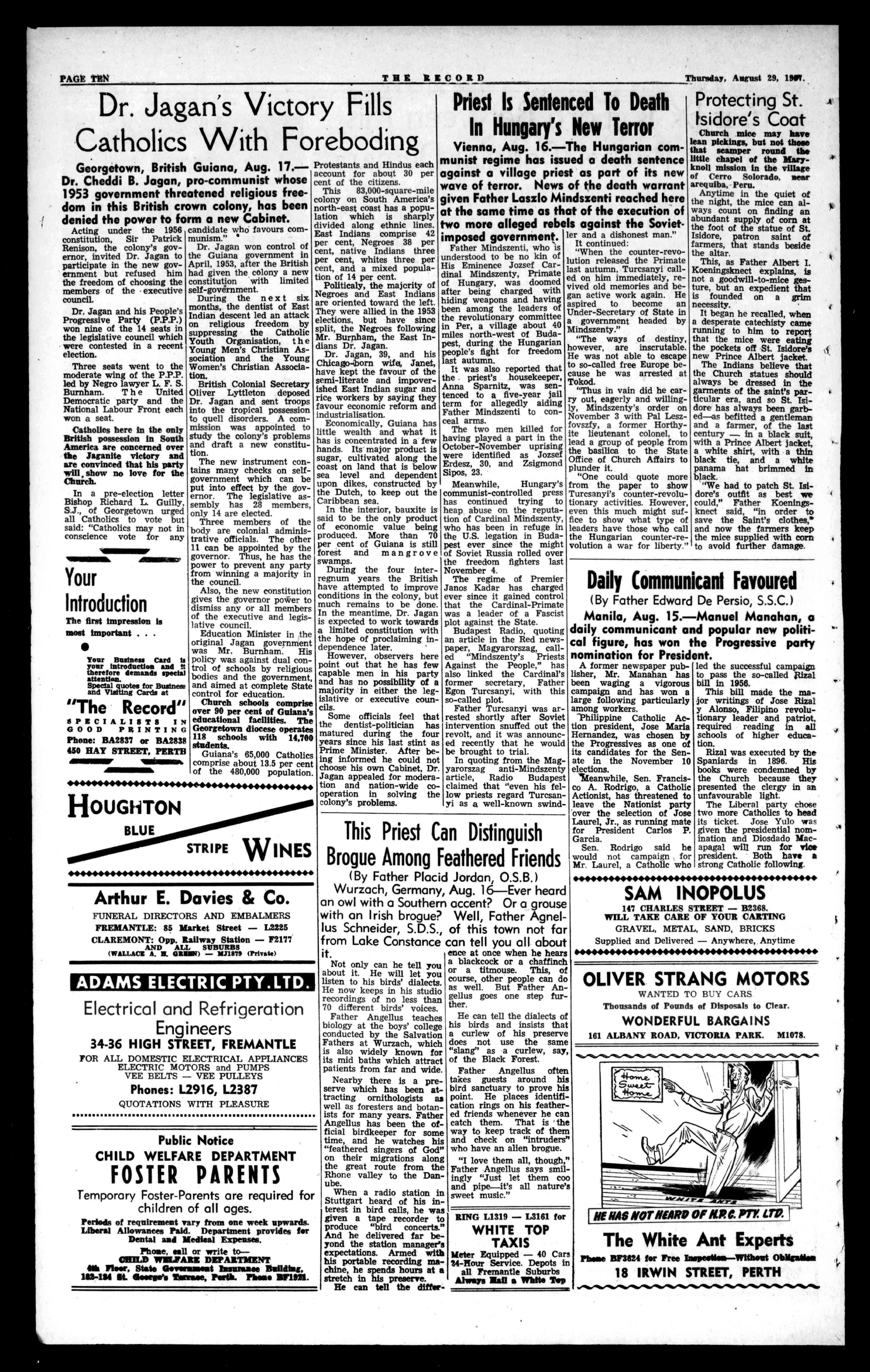 AUSTRALIA'S PREMIER ANTISEPTIC Pine-O-Cleen Availablein 20oz.bottle 1gallontin 4gallondrum 44gallondrum OxfordPolishCo.(W.A.) Pty.Ltd.-BF1089. Ad,eiee.4.0, 4,re4r/No.2821(RegisteredattheG.PO..Perth,for transmissionbypostasaNewspaper) Price6d. Thursday,August29,1957 -e-c=/eLze_ I IFBUILDING .HASSELLS WILLSAVEYOU££E's onstoves,baths.sinks,cupboards andallplumbingandbuildingmaterials. WHITETILES,39/6Yard Justarrived-Spanishand GermanTiles-allcolours. AlsoMosaicFloorTiles. HASSELLS havefirstqualitybaths,£26, pedestalbasins.£14/10/,all colours HASSELLS onlyhavestainlesssteelsinks3ft to7ft.long,sinkcupboards4ft., £6/2/6;41t.6in..£6/13/6;51t., £.7/10/,allsizesandtoorder. Whypaymore,specialconsiderationtoreligiousorganisations. HASSELLSBUILDINGS,553to561 WellingtonStreet.BF2477. "Australia'sBoldAdventure" PolishNunsOfTheHolyFamily OfNazarethToFoundKindergarten
