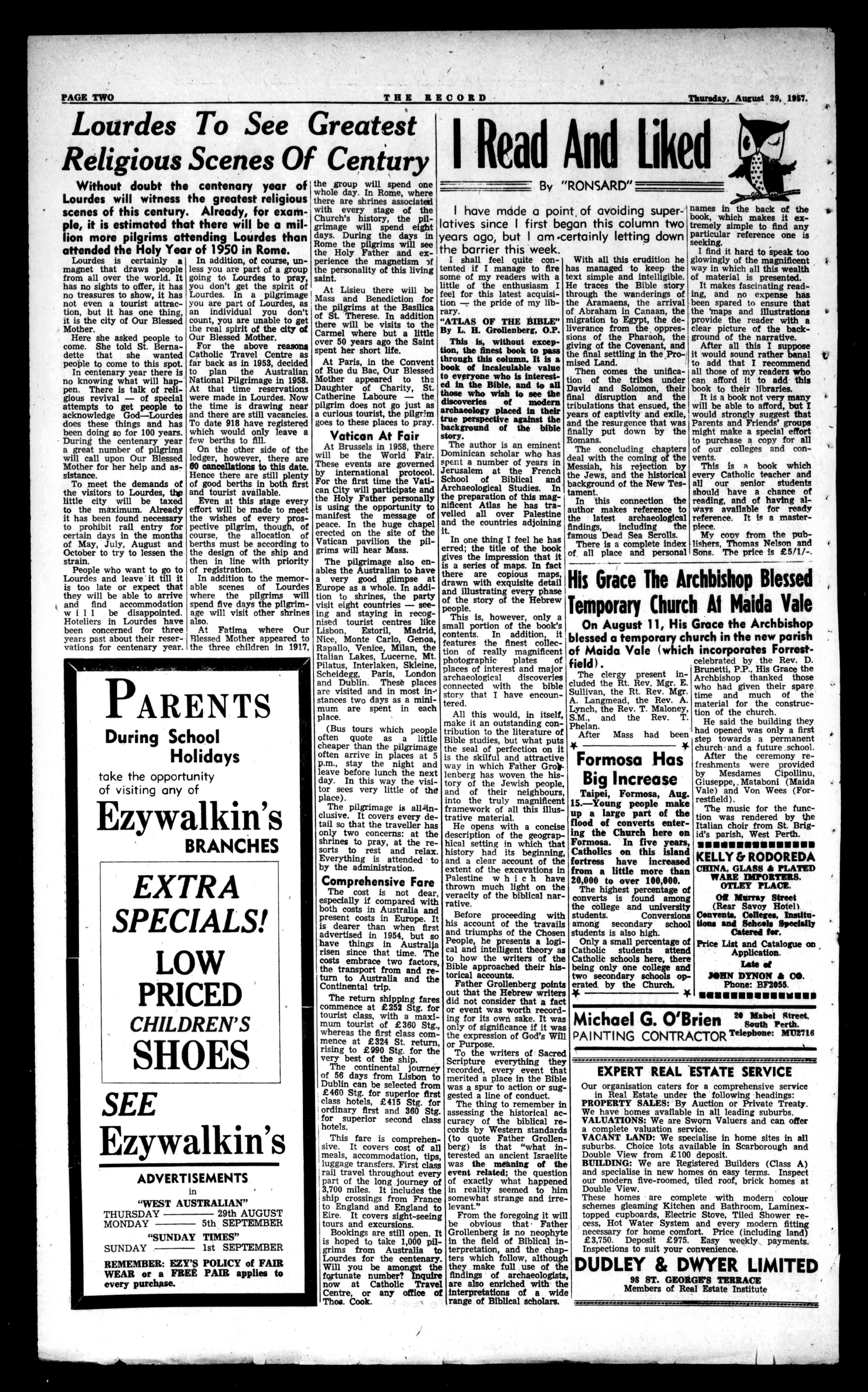 Fortheabovereasons CatholicTravelCentreas farbackasin1953,decided toplantheAustralian NationalPilgrimagein1958. Atthattimereservations weremadeinLourdes.Now thetimeisdrawingnear andtherearestillvacancies. Todate918haveregistered whichwouldonlyleavea fewberthstofill.