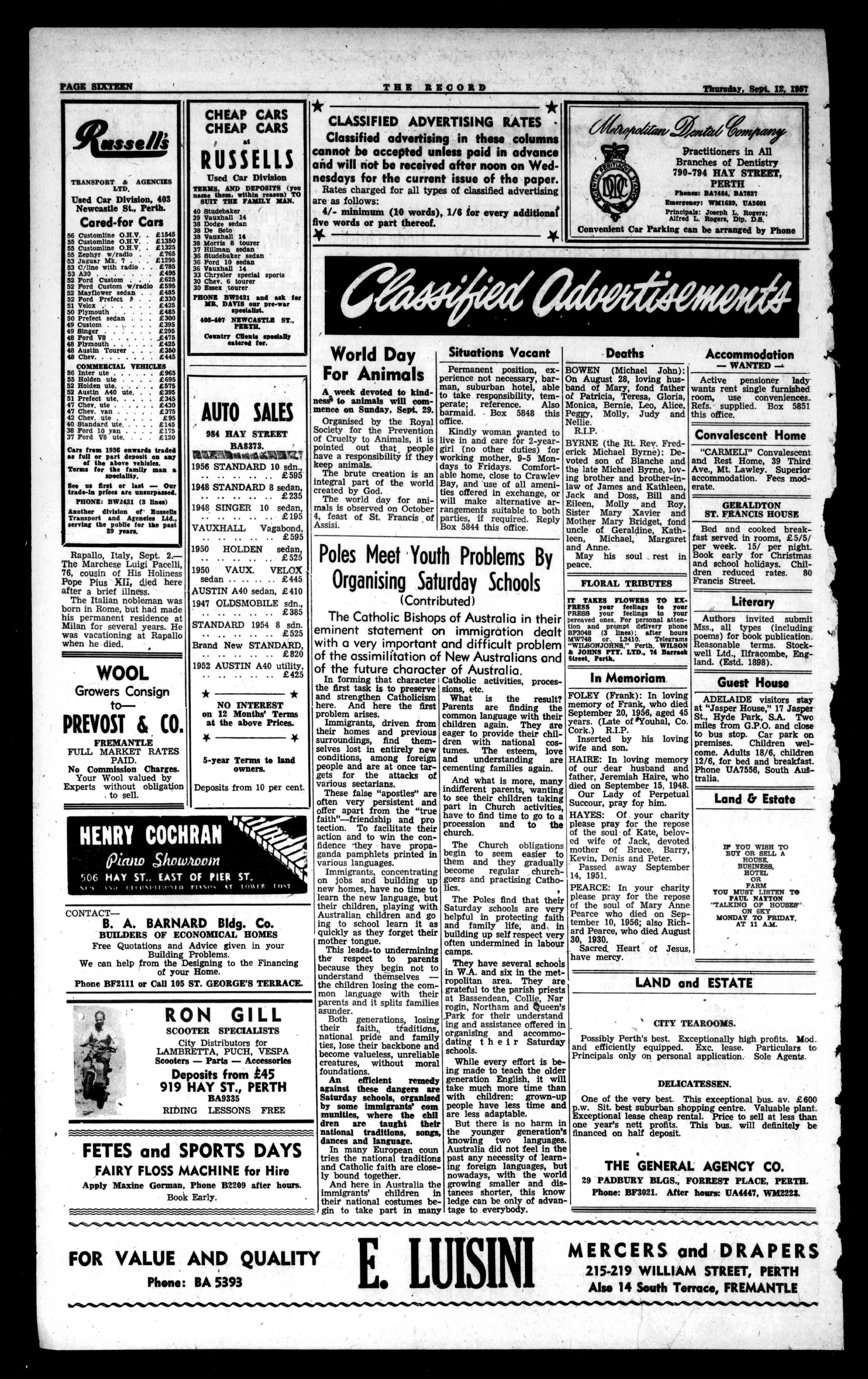PAGESIXTREN THERECORD Thursday,Sept.IZ,II157 asseM TRANSPORT&AGENCIES LTD, UsedCarDivision,403 NewcastleSt.,Perth. Cared-forCars 56CustomlineO.H.V. £1545 55CustomlineO.H.V. £1350 55CustomlineO.H.V. £1325 55Zephyrw/radlo £765 53JaguarMk7 £1295 53C/linewithradio £785 53A30 £495 52FordCustom £625 52FordCustomw/radio£595 52Mayflowersedan £485 52FordPrefectI. £330 51Velox £425 50Plymouth £485 50Prefectsedan £300 49Custom £395 49Singer £295 48FordV8 .E475 48Plymouth £425 48AustinTourer £350 48Chev £445 COMMERCIALVEHICLES 56Interate £965 55Holdenute £695 52Holdenute £575 52AustinA40ute. £395 51Prefectute £345 47Chev,ute £430 47Chev.van £375 42Chev.ute 95 40Standardute. £145 38Ford10yan £115 37FordV8ute. £120 Carsfrem1936onwardstraded asfullorpartdepositonany oftheabovevehicles. Termsforthefamilymana speciality. SeeusSentorlast-Oar trade-Inpricesareunsurpassed. PHONE:BW2431(3lines) AnotherdivisionofRussells TransportandAgenciesLtd., servingthepublicforthepast 39years. Rapallo,Italy,Sept.2.TheMarcheseLuigiPacelli, 76,cousinofHisHoliness PopePiusXIi,Wedhere afterabriefillness. TheItaliannoblemanwas borninRome,buthadmade hispermanentresidenceat Milanforseveralyears.He wasvacationingatRapallo whenhedied. WOOL GrowersConsign toPREYOST&CO. CHEAPCARS CHEAPCARS at RUSSELLS UsedCarDivision TERMS,ANDDEPOSITS(you namethem,withinreason)TO SUITTHEFAMILYMAN. 40Studebaker 39Vauxhall14 38Dodgesedan 38DeSoto 38Vauxhall14 38Morris8tourer 37Hillmansedan 36Studebakersedan 36Ford10sedan 36Vauxhall14 33Chryslerspecialsports 30Chev.6tourer 30Essertourer PHONEEW2431andaskter MR.DAVISspecialist.oarpre-war 403447NEWCASTLEST., PERTH. CountryClientsspeelally cateredter.