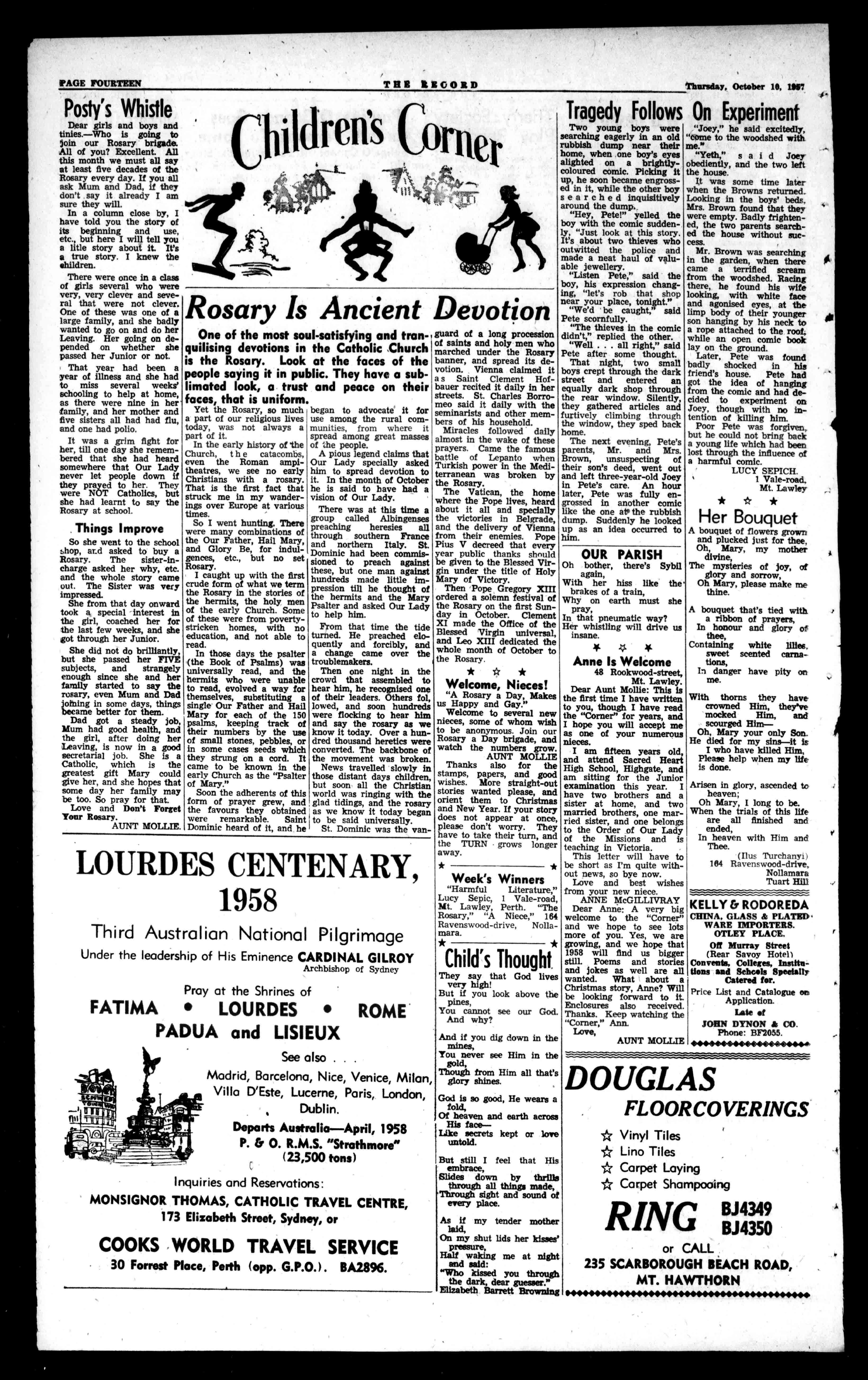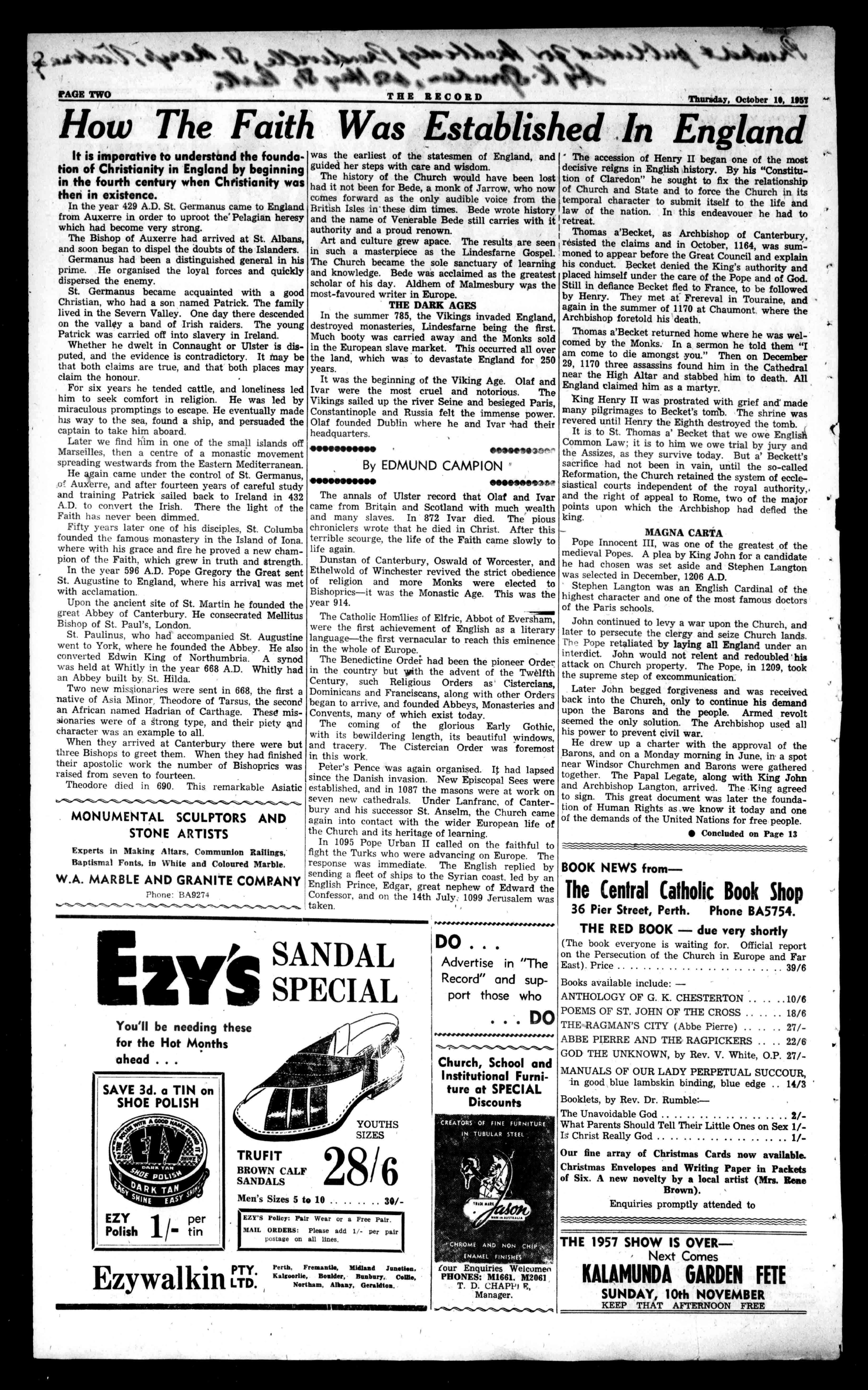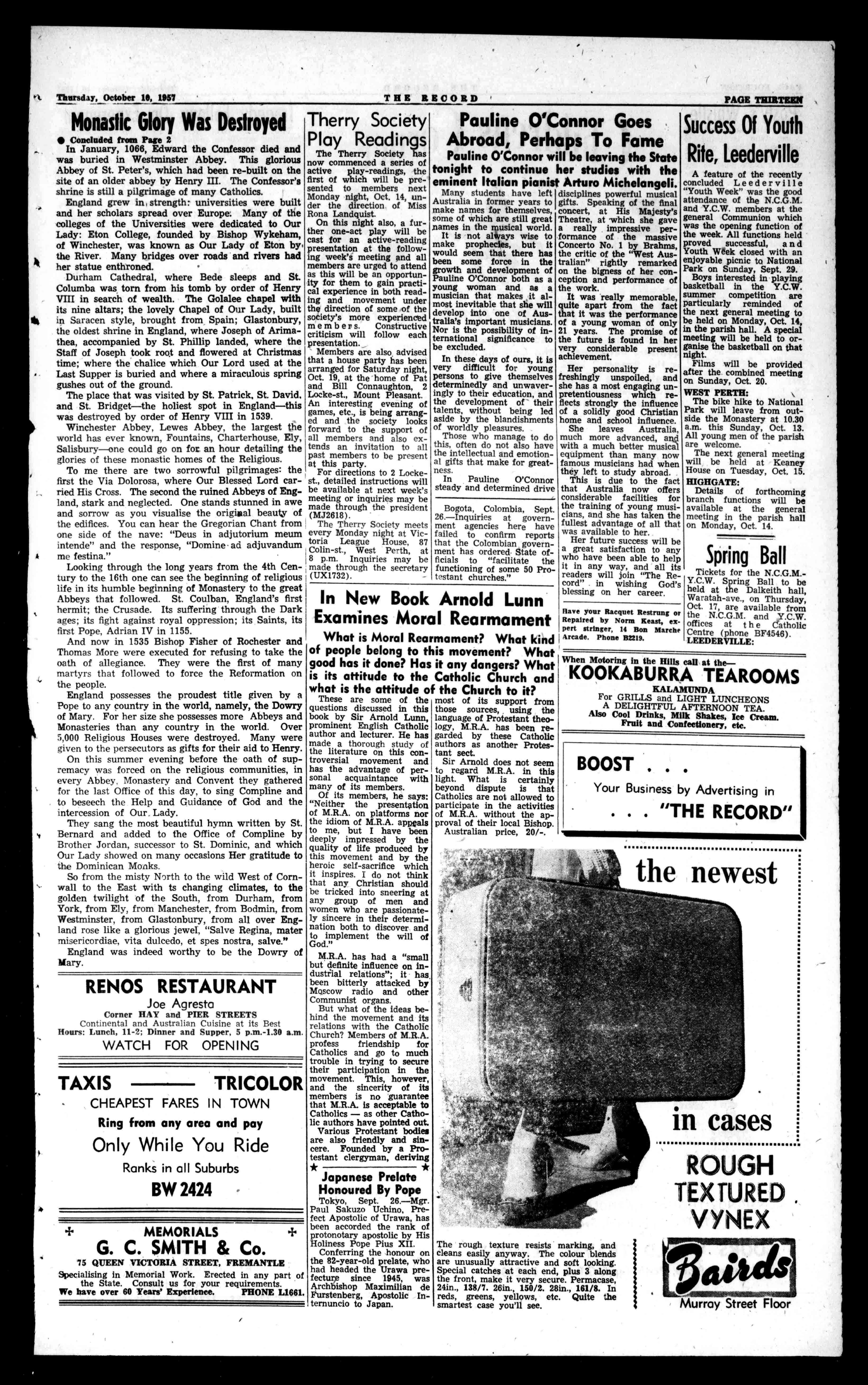 "4"441""fref(-4444'ello/A°d""dVAFA.:es-wire-4 4e4,4Wer-Mest ..searte4is.,As?"if le,44ET 451. WINGYOURWAY. withANA's Pressurised DouglasDC6B Ring-Write-orCall 414MurraySt.BA9651. 55St.George'sTer.BF3982. Price6d. No.2827(RegisteredattheG.P.O.Perth.forPerthThursd transmissionbypostasaNewspaper) ay,October101957 IFBUYING StovesBaths,Sinks,Cupboards,Palate,etc., HASSELLS WILLSAVEYOU£Vs BRONZEWIREDOORS withIronGrillecomplOte, only£41191-,12designs HASSELLS havewhiteand'allcolourswall andfloortiles,alsostainlesesteel sinks3ft.to cupboards.7ft.long.Sinkswith 4ft.,£23;Oft.61e.. £25;511.,£27/10/. Allshies andtoorder. Whypaymore?Specia.cunsideraliontoreligiousorgriniselons HASSELL!!BUILDINGS,553toMI WelliarteaStreet.BF2477. 40YearsToExactDateNativeMissionToHisGraceSeeks OpenExtensions ing gThoefbtlhesesinegxteant