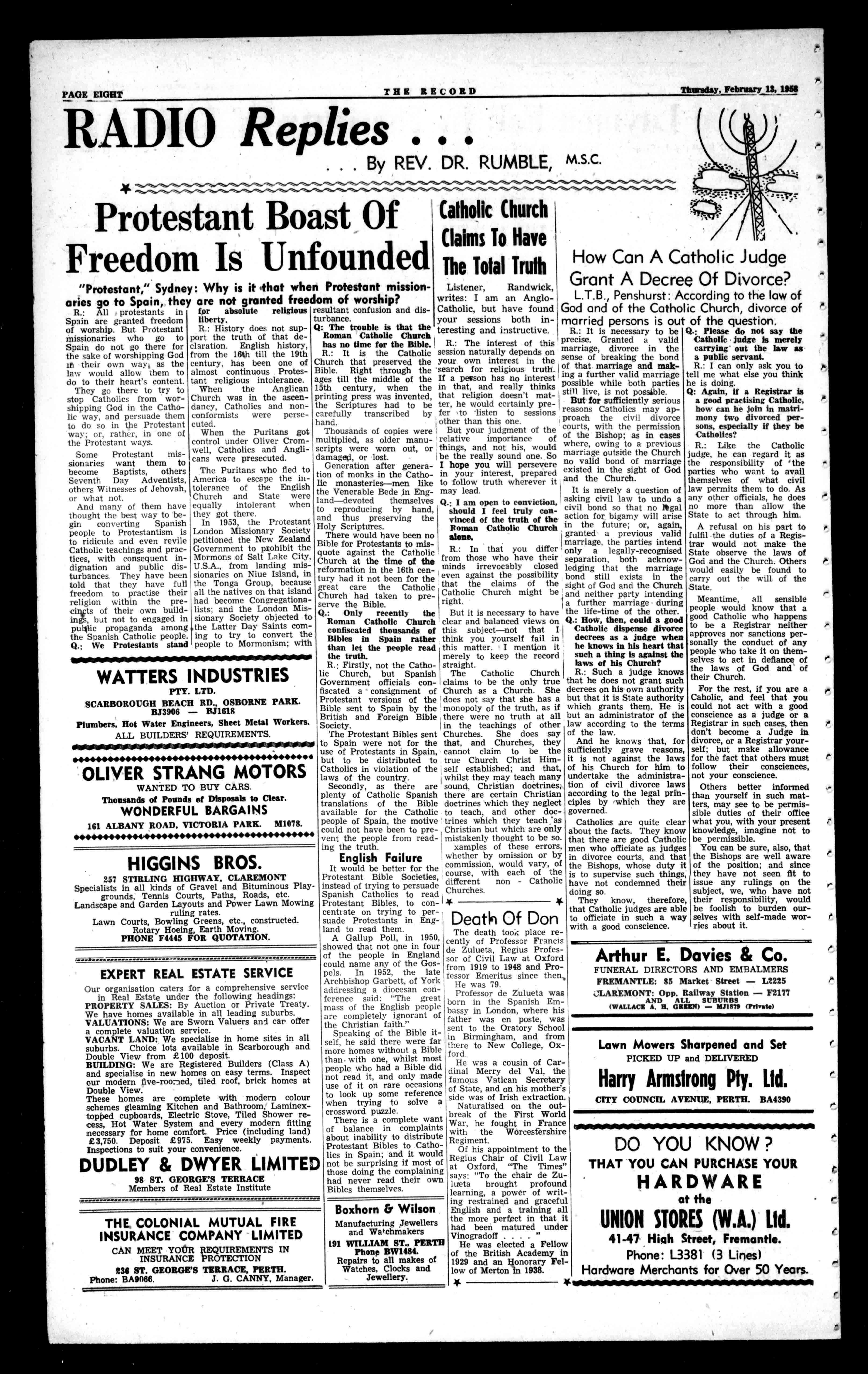 Thisstatementmeans reachedthenewSt.Philip'sXaverianFunctions littletoalayman,heconSchoolwherehewasmetForthcoming Xaverian tinued,unlessitwasref'bytheboysofthenewClubfixturesareasfol- memberedthatthecostof schooldressedintheirat-pi Feb.18:Recordevening afullpageofadvertising spaceinapopulardaily tractiveuniform. lows: AEucharisticprocessionofschoolchildrenatVictoria-sq.con", AftertheblessingoftheatthehomeofBrian paperwasapproximately buildingtherefollowedtheO'Leary(Tel.WU1323).vent,eveningMassattheCathedralandthearrivaloftheNew£7,500. ceremonyofdeclaringtheFeb.23:Beachpicnic. ZealandnationalpilgrimageusheredintheLourdesCentennialInEngland,anationaladnewschoolopen.FirstlytheNighttennisisconducted vertisingcampaignusually r,parishpriest,onbehalfofeachFridayatLoftusParkYearfortheCatholicsoftheArchdiocese. envisagedaminimumexthepriestsandparishionerstenniscourts,Leederville. SchoolchildrenfromOurBlessedSacramentwasEveningMasswasofferedpenditureof£35,000. oftheseveralparishesofTheXaverianClubisaLady'sCollegeandSt.borneinprocessiontotheattheCathedralat5.45FatherO'Connorhas theregiontobeservedbysocialgatheringforsingleJoseph'sschoolrecitedthegrottowhenBenedictionp.m.beforealargecon-giventwoaddresses,oneto thenewschoolwelcomedCatholicsover23years.Rosarybeforethegreatwasimparted. gregationbytheV.Rev.thepriestsoftheArchdioHisGrace,andreadastate-Enquiriesregardingmem-open-airgrottointhecon-TheRev.W.FoleyspokeDeanJ.Hogan,Adm. cese,theothertoSisters mentofcosts,etc. bershipmaybehadbycon-ventgrounds. tothechildrenofLourdesThenumberofcommuni-andBrothers.Hegavea t" HisGracesaidthathefadingthesecretary,11aThenprecededbyHolyandoftheneedofdevotioncantswasconspicuouslytalkonFeb.11tothe wasparticularlypleasedtoLearoyd-street,Mt.LawleyAngels,flower-strewersandtoOurLadyintheirdailylarge,threepriestsbeingLegionariesofManyatthe beassociatedwiththefunc-(Tel.UA4450)after6p.m.ChildrenofMarythelives. engagedinthedistribution.Cathol:cCentro. A