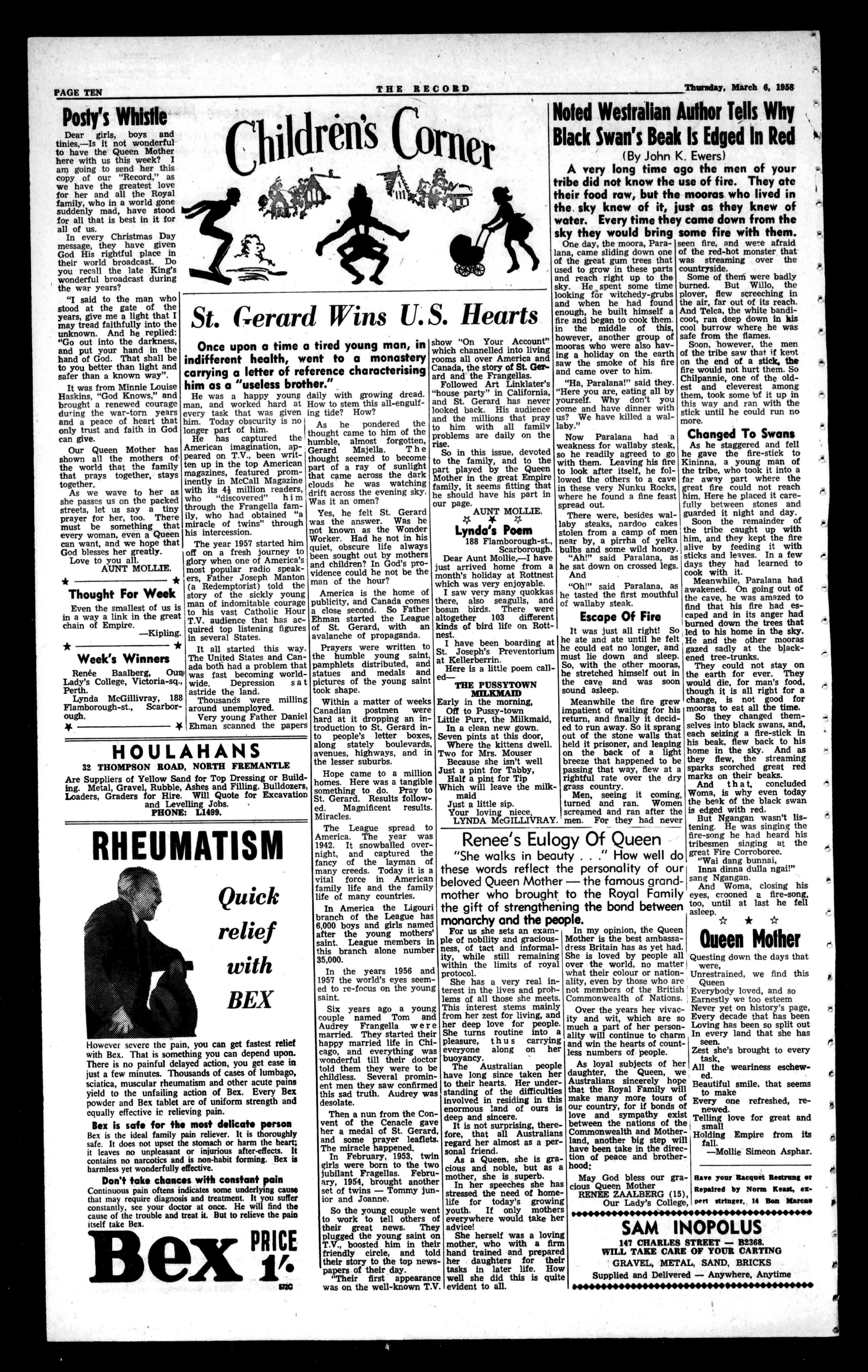 Barbecuescateredfor. PhoneWC2002. amostiousweirop~ovoloolles PERTHFISHERIES 419WellingtonSt.ThanePIF2791. Private:WI71015. Also509Oxfordstreet.5.701011. FRESHFISHDaily:Wholesale andRetail. CrayfishandPrawnsforbait alwaysonhand. CookedFishandChinsallday, OPENWEEK-ENDS. ARTHRITIS Ifyouareoneofthosesufferers whohastried"everytring"withoutresults,Iwouldliketohear fromyou.Whysufferneedlessly? Youwillbethrilledwithencouragementasyoureadtruecopies ofhundredsofrecentlyreceived testimonialswhichIwillsendYOU alongwithdetailstellingexactly howyoucangainsimilarbenefits andlastingreliefrightinyour ownhomewithoutunduedelayandinconvenience.Noobligation IsincurredbywritingtoO.P.O. BoxI629M.,Melbourne,orcall andseemepersonallyifyou Prefer. W.J.PIETSCH 46ElizabethSt.,Melbourne KELLY&RODOREDA CHINA.GLASS&PLATED WAREIMPORTERS. OTLEYPLACE. OffMurrayStreet (RearSavoyHotel) Convents,Colleges,institutionsandSchoolsSpecially Cateredfor. PriceListandCatalogueon Application. Lateof JOHNDYNON&CO. Phone.RF2055 1:FCAICKR:Forfecce:PaCeRYCFCR:ccent LandandEstate HOUSEFORSALE McCourtSt.,WestLeederville Brick-Lounge-DiningRoom-4Bedrooms Garage. WellMaintained. SomeCarpetsandBlindsincluded,atpriceof £3,250 DetailsfromtheAgent_ ALANROBERTSON M.R.EI. 49WilliamStreet AfterHours:WU2255. MERCERSandDRAPERS 215-219WILLIAMSTREET,PERTH Also14SouthTerrace,FREMANTLE 4