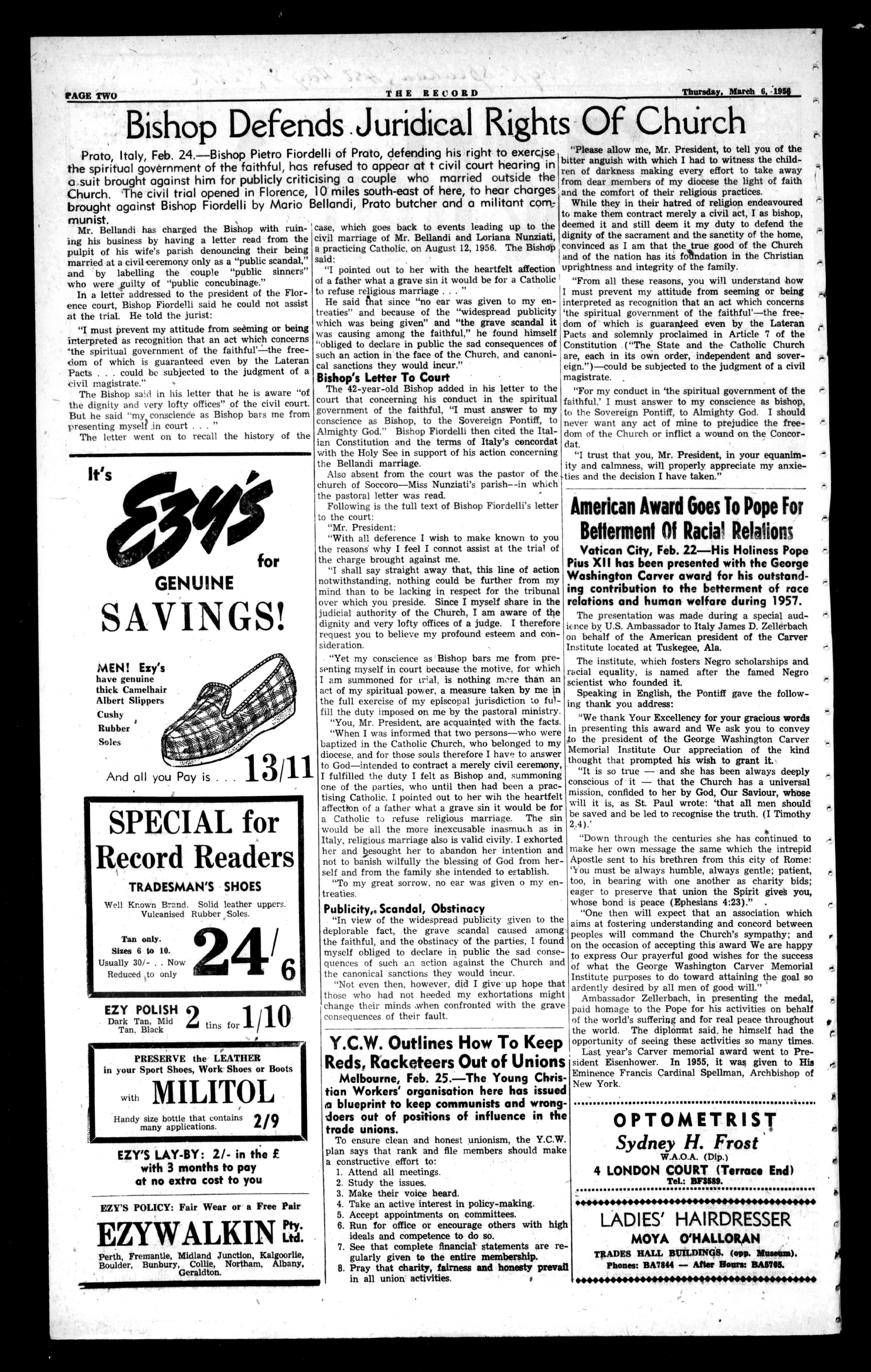 case,whichgoesbacktoeventsleadinguptothe civilmarriageofMr.BellandiandLorianaNunziati, apracticingCatholic,onAugust12,1956.TheBish6p said: