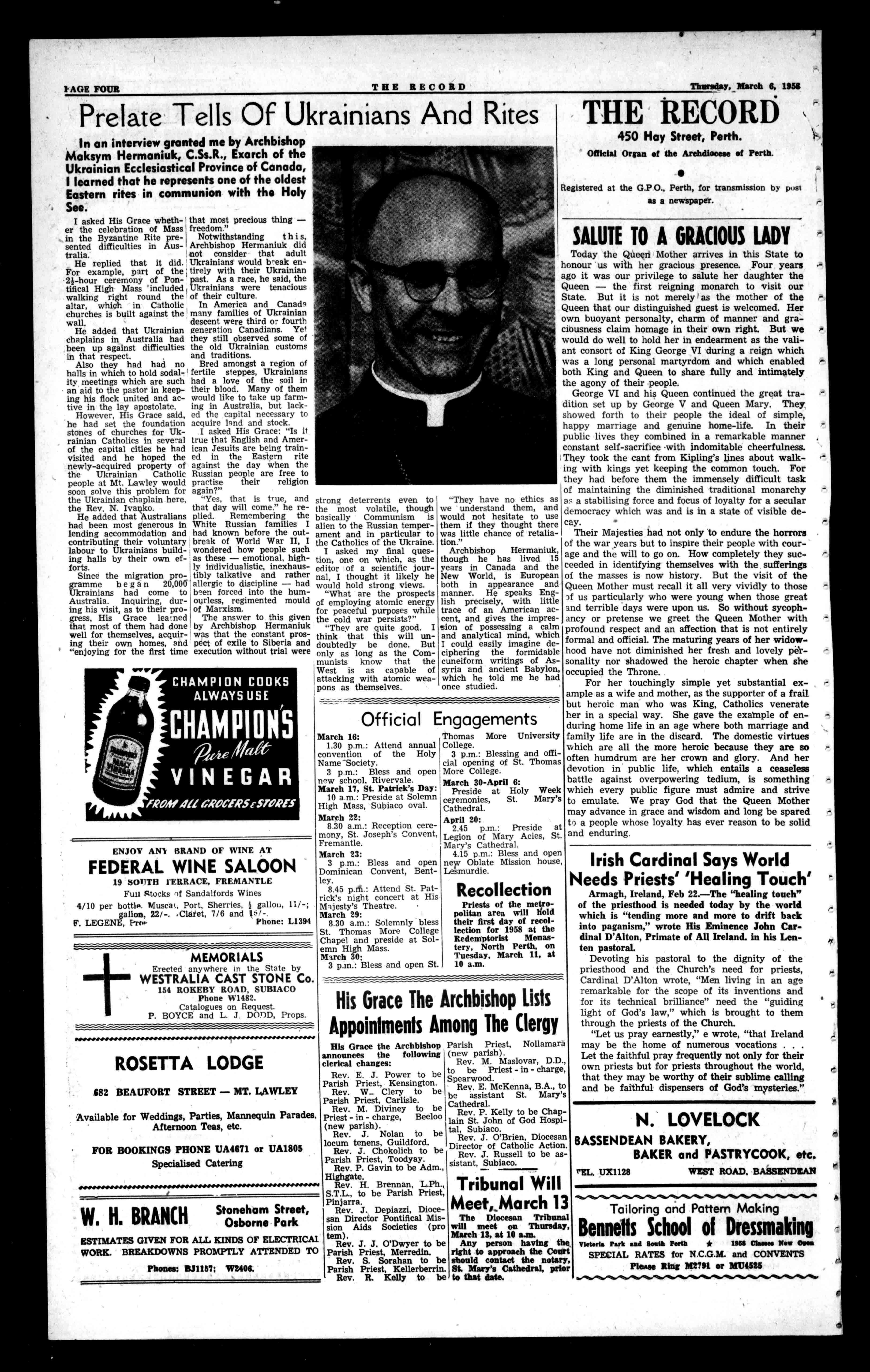 AlargecrowdofUkrainianCatholics gatheredatPerthAirportonthenightof Feb.26togreettheirExarch,theMostRev. M.Hermaniuk,C.Ss.R.,notedchurchman, scholarandscientist. HisGrace,isApostolictheRev.L.Hansberry, VisitortoUkrainianCatho-C.Ss.R.andtheRev.C.A. liesandtheirchaplainsinCahill,C.Ss.R. AustraliaonbehalfoftheTheUkrainians,manyof SacredCongregationofthetheminnationalcostume, EasternChurches. presentedthedistinguished ArchbishopHermaniuk,prelatewiththetraditional accompaniedbytheRev.offeringsofbread,sugar Nicholas Kotiakiwsky,andflowers.Speecheswere C.Ss.R., was officiallymadeonbothsides. greetedbyHisGracethe Archhishop.