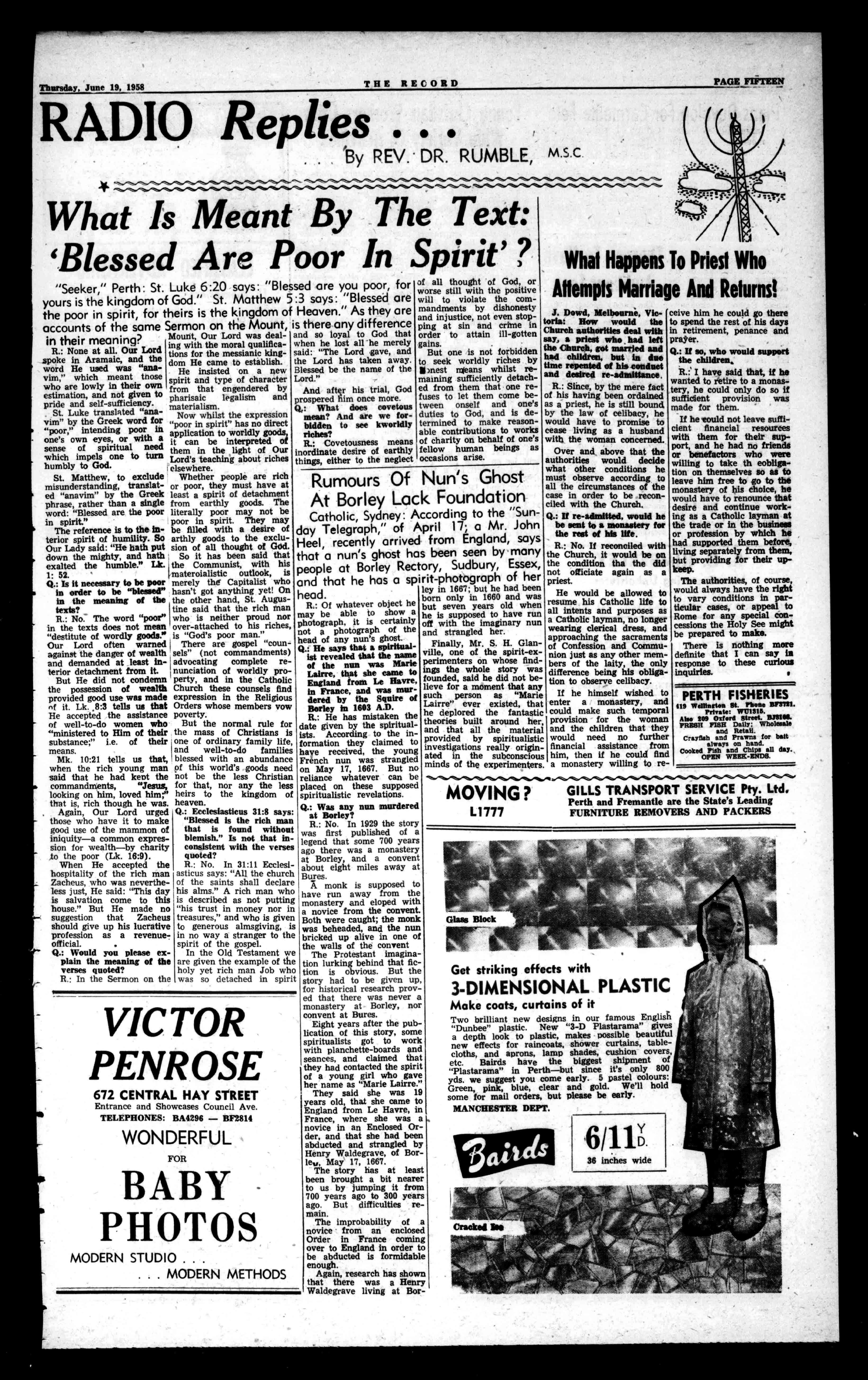 NERI(Philip):Yourcharitableprayersarerequested forthereposeofthesoul ofPhilipNeriof109Wright St.,Highgate,diedJune8, 1958.Belovedhusbandof Mabel,lovingfatherof Phil, Denis (Sydney, N.S.W.),Mavis(Mrs.W. Lyall,Albany),Gladyit (Mrs.W.T.Davidson)and Lionel,andsincerefriend ofMarie.Father-in-lawof Alex,BillandRon;Il grandchildrenand2greatgrandchildren. SacredHeartofJesus, havemercyonhissoul.