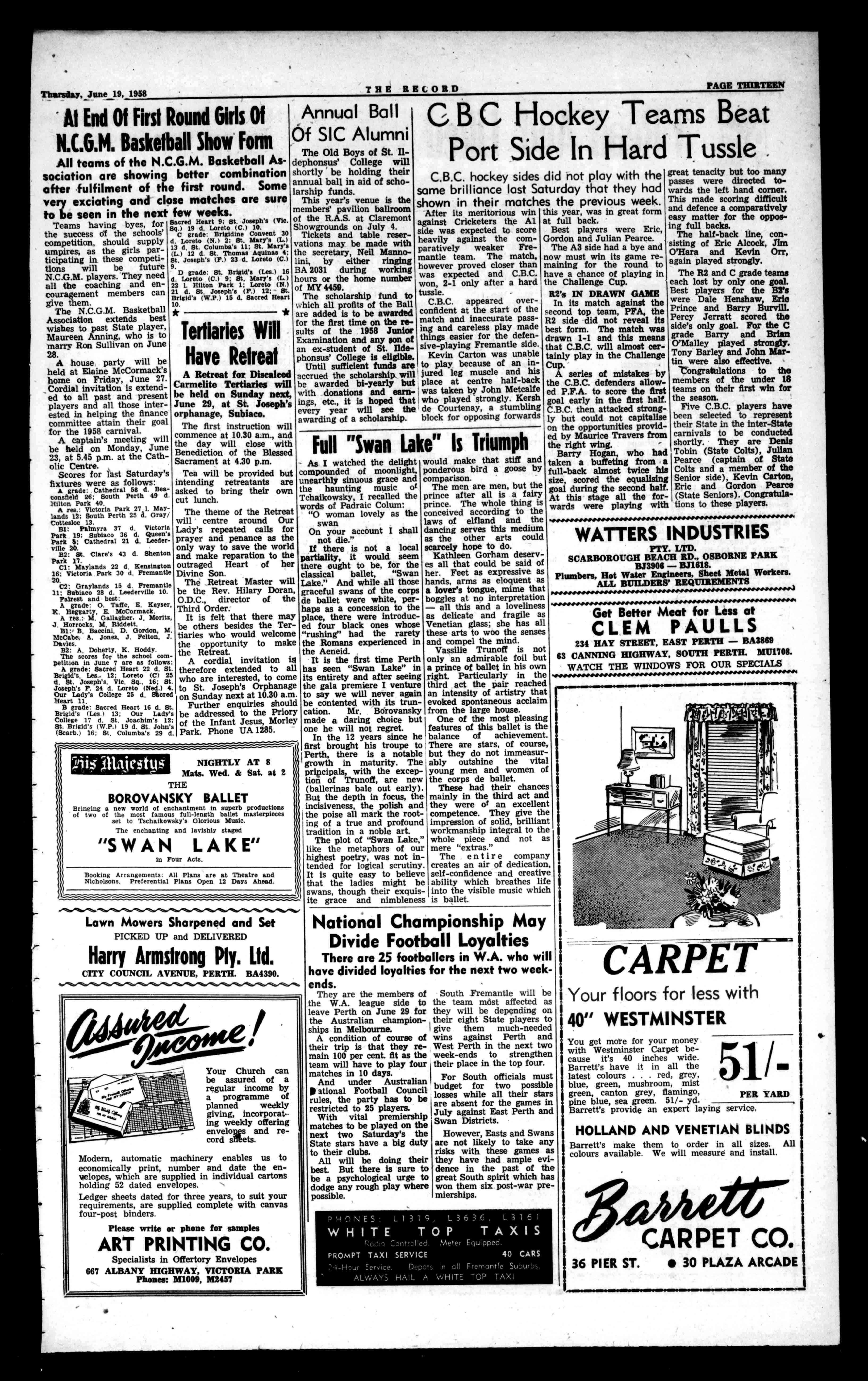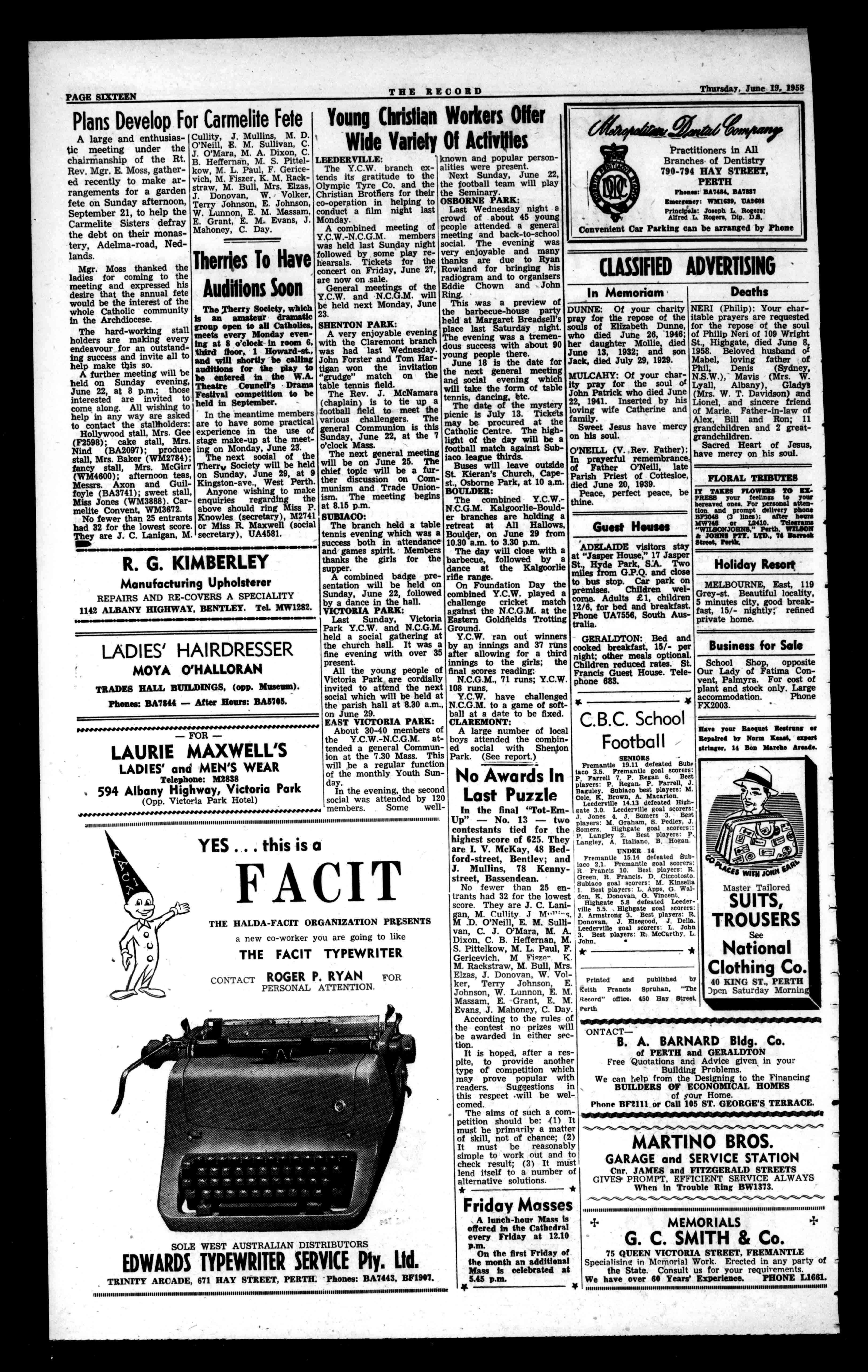 LEEDERVILLE: knownandpopularpersonTheY.C.W.branchex-alitieswerepresent. tendsitsgratitudetotheNextSunday,June22, OlympicTyreCo.andthethefootballteamwillplay ChristianBrothersfortheirtheSeminary. co-operationinhelpingtoOSBORNEPARK: conductafilmnightlastLastWednesdaynighta Monday. crowdofabout45young Acombinedmeetingofpeopleattendedageneral Y.C.W.-N.C.G.M.membersmeetingandback-to-school washeldlastSundaynightsocial.Theeveningwas followedbysomeplayre-veryenjoyableandmany hearsals.TicketsforthethanksareduetoRyan concertonFriday,June27,Rowlandforbringinghis arenowon.sale. radiogramandtoorganisers GeneralmeetingsoftheEddieChownandJohn Y.C.W.andN.C.G.M.willRing. beheldnextMonday,JuneThiswasapreviewof 23. thebarbecue-houseparty SHENTONPARK: heldatMargaretBreadsell's Averyenjoyable placelastSaturdaynight. withtheClaremontbranchTheeveningwasatremenwashadlastWednesday.doussuccesswithabout90 JohnForsterandTomHar-youngpeoplethere. tiganwontheinvitationJune18isthedatefor "grudge"matchonthethenextgeneralmeeting tabletennisfield. andsocialeveningwhich