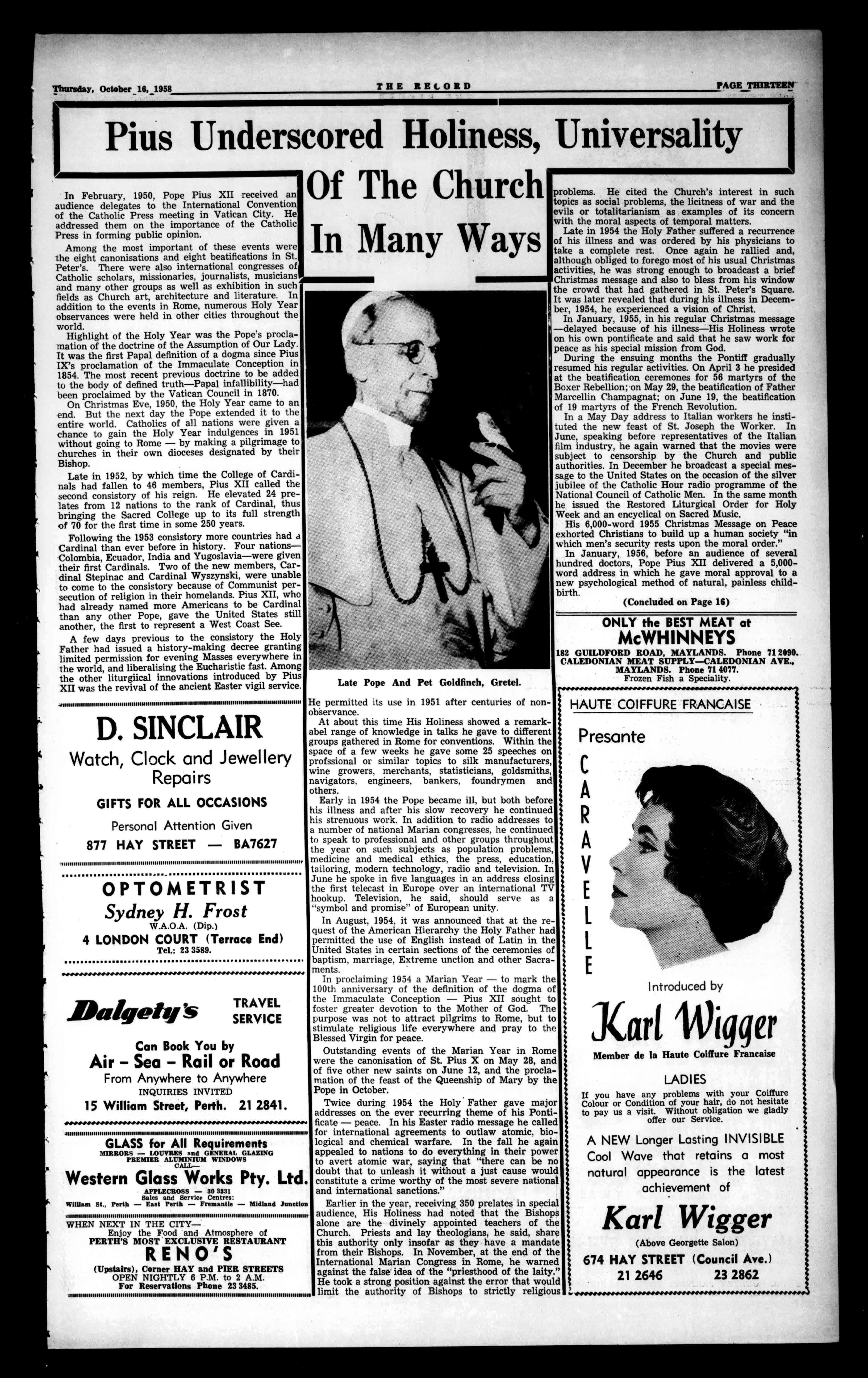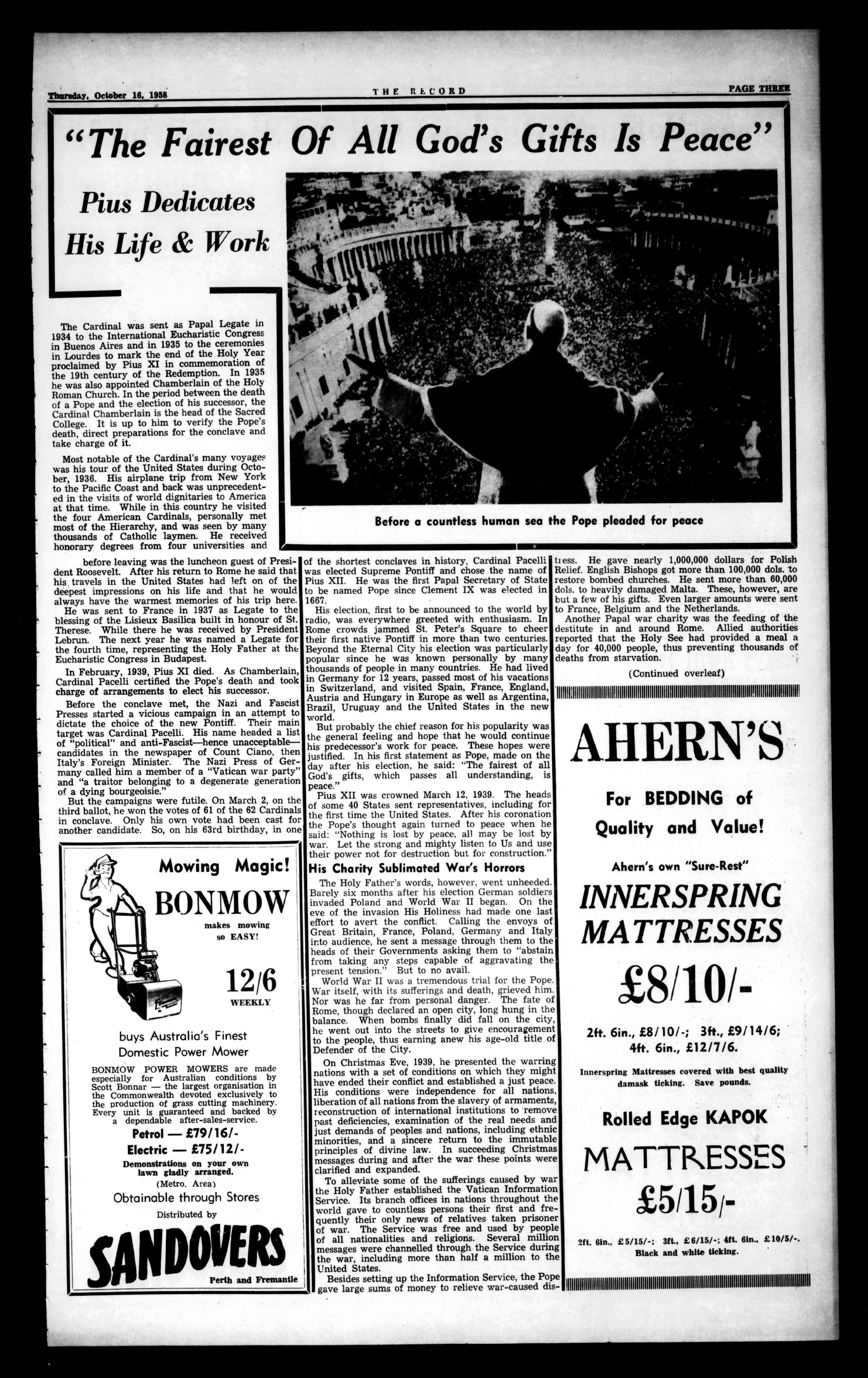 HisGracetheArchbishopsaidthatCatholicChristendom-alwaysunitedbythebondofacommon faith-wasthatdaymorecloselyknitbythewandof death.Duringthosedaysofmourningfivehundred millionspiritualchildrenwerebroughtmoreclosely togetherinprayerfulsorrow-profoundlymovedand grievedbythelamenteddeathoftheirHolyFather. PopePiusXII.inthe82ndyearofhislife,andthe 19thofhistroubledpontificate. comparedwiththatofmanyofhispredecessors. Measuredbyotherstandardsitwaseventfuland fruitfultoahighdegree,illuminedbybrilliantand arrestingEncyclicalsonreligious,socialandeconomic questionsthatreflectedtheworkingofapowerful intellectandthatrivetedtheattentionoftheworld atlargeonthe261stsuccessorofSt.Peter,inthe SeeofRome.