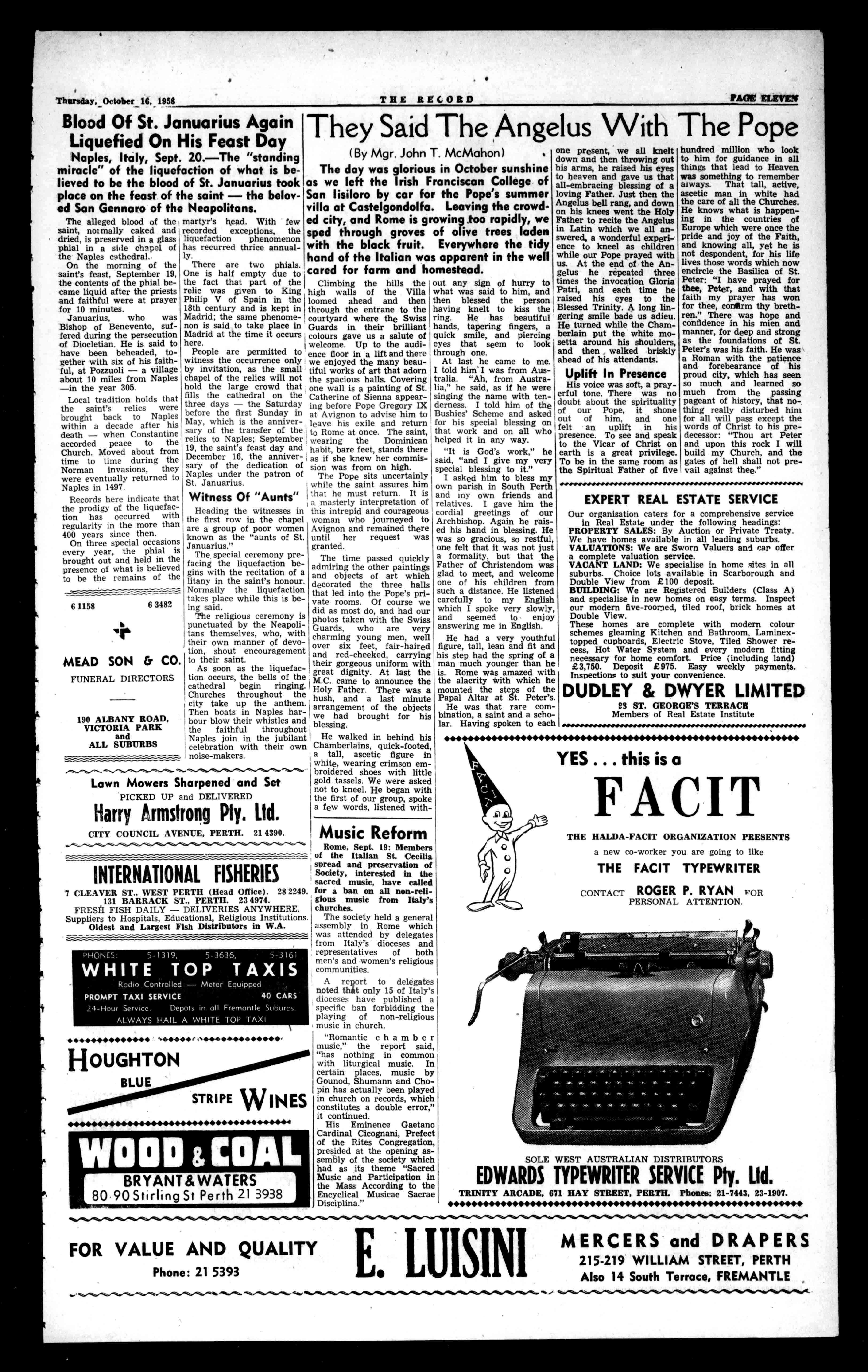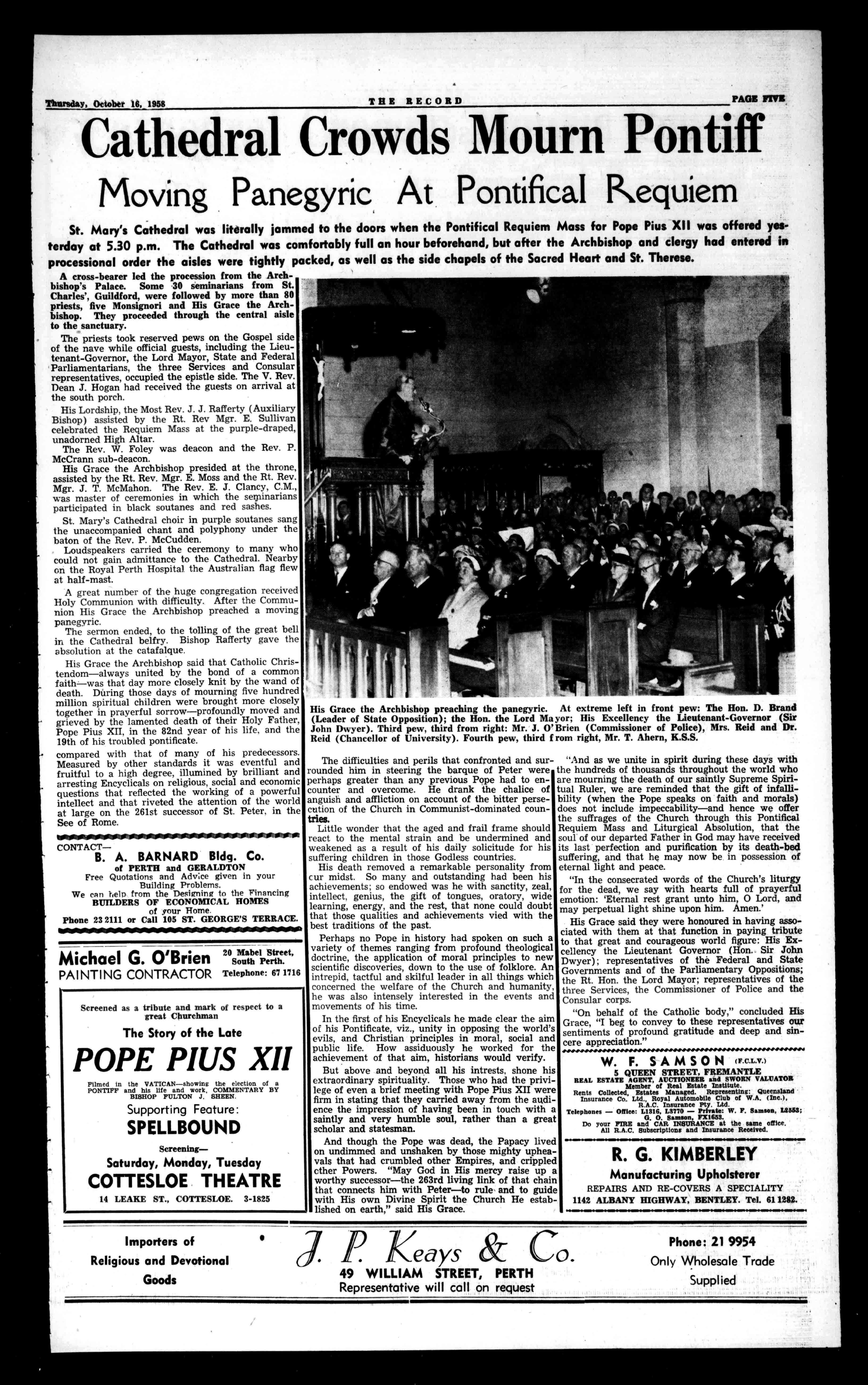 St.Mary'sCathedralwasliterallyjammedtothedoorswhenthePontificalRequiemMassforPopePiusXIIwasofferedyesterdayat5.30p.m.TheCathedralwascomfortablyfullanhourbeforehand,butaftertheArchbishopandclergyhadenteredin processionalordertheaislesweretightlypacked,aswellasthesidechapelsoftheSacredHeartandSt.Therese.