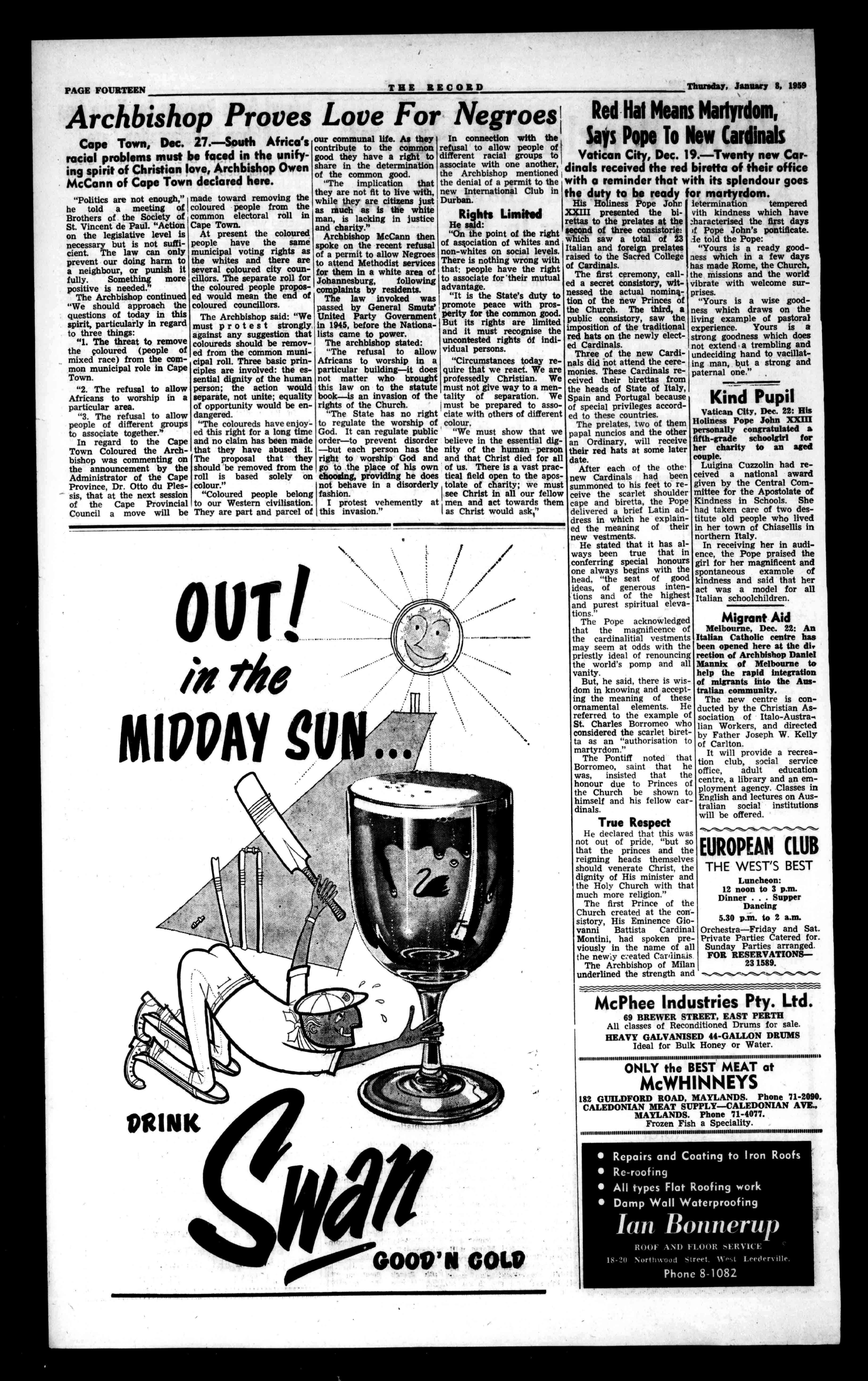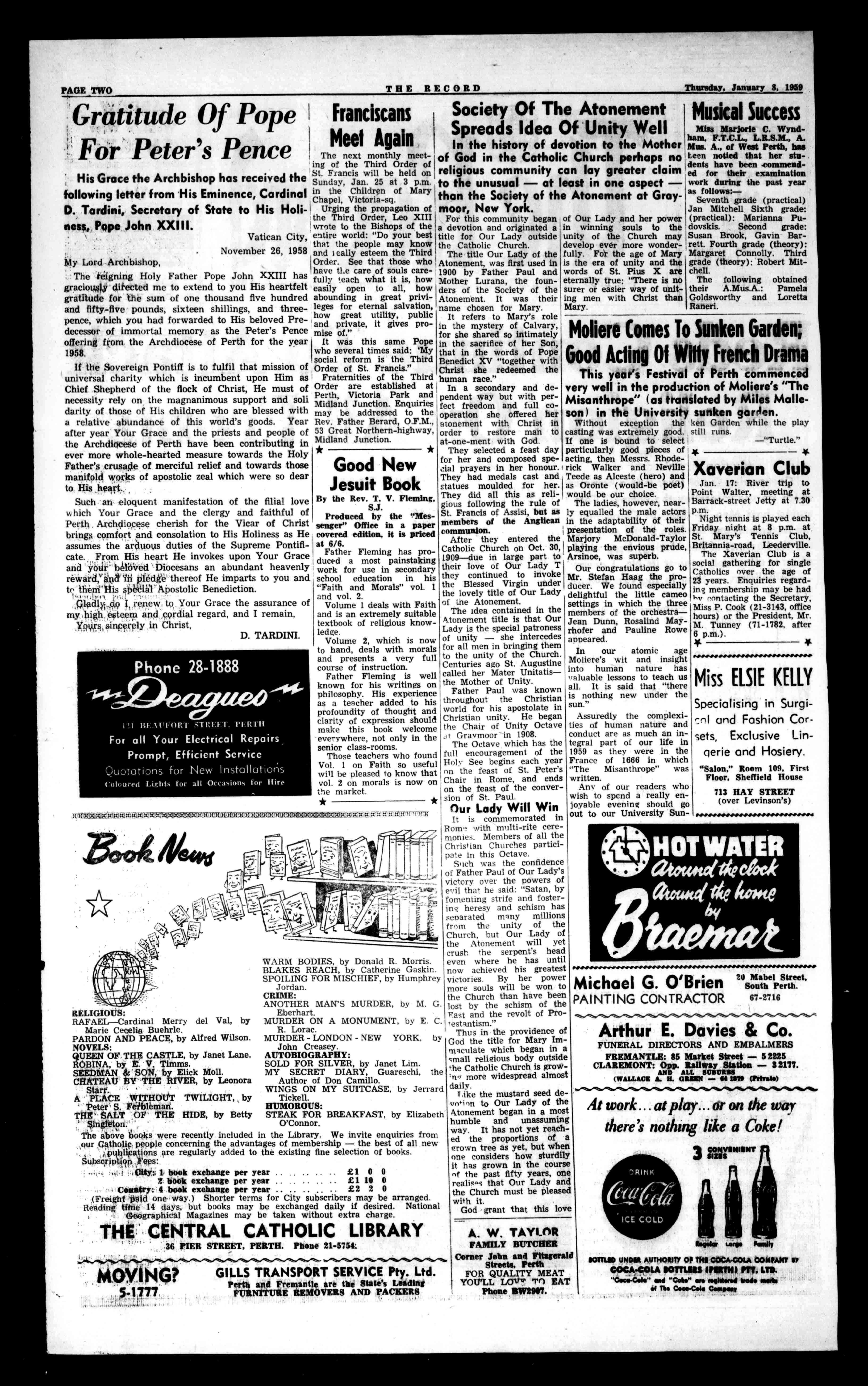 ThereigningHolyFatherPopeJohnXXIIIhas graciouAyditectedmetoextendtoyouHisheartfelt gratitudeforthesumofonethousandfivehundred andfifty-fivepounds,sixteenshillings,andthreepence,whichyouhadforwardedtoHisbelovedPredecessorofimmortalmemoryasthePeter'sPence offeringfromtheArchdioceseofPerthfortheyear 1958.