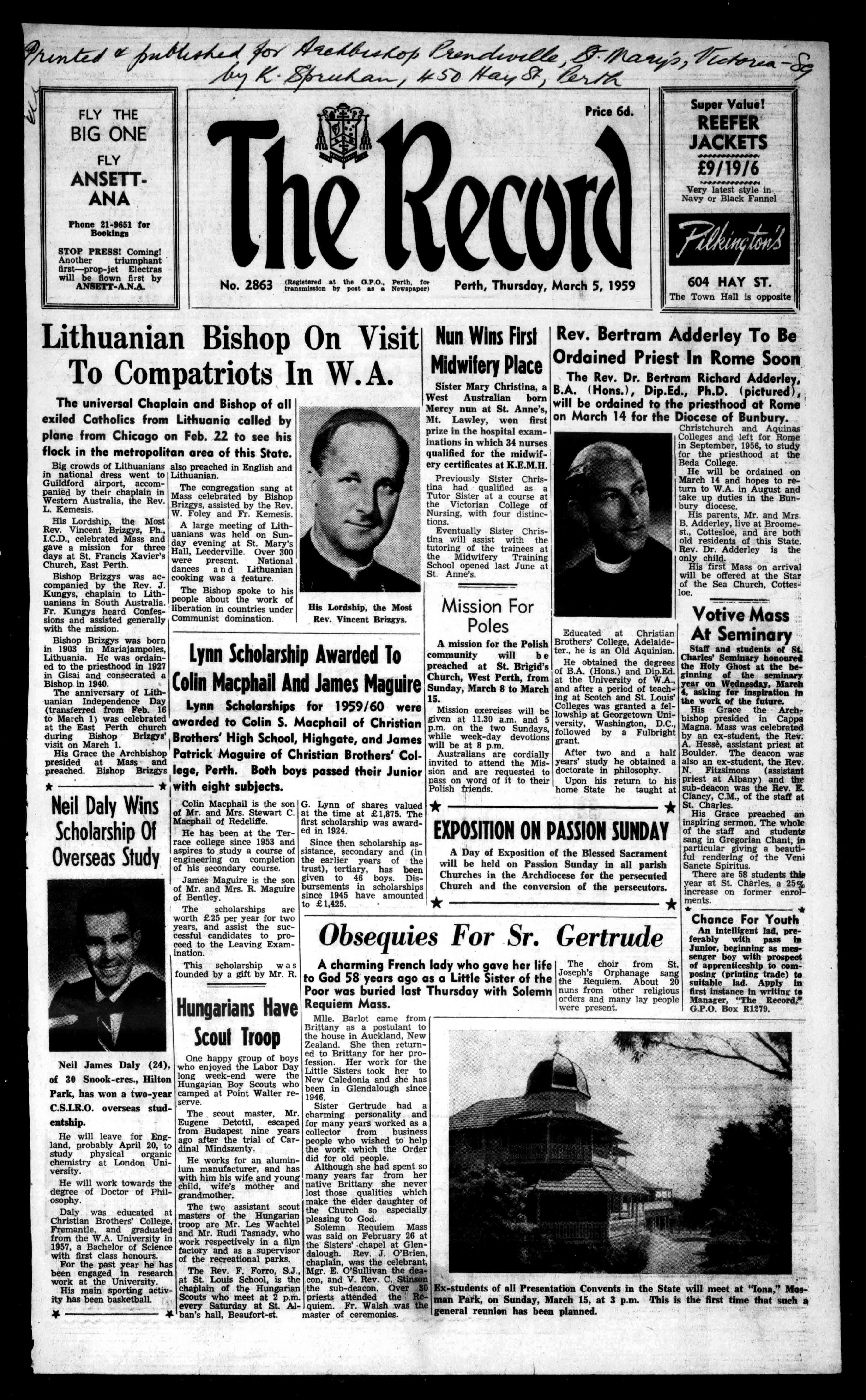 LynnScholarshipsfor1959/60were awardedtoColinS.MacphailofChristian duringBishopBrizgys'Brothers'HighSchool,Highgate,andJames visitonMarch1. HisGracetheArchbishopPatrickMaguireofChristianBrothers'Col- presidedatMassand preached.BishopBrizgyslege,Perth.BothboyspassedtheirJunior *witheightsubjects.
