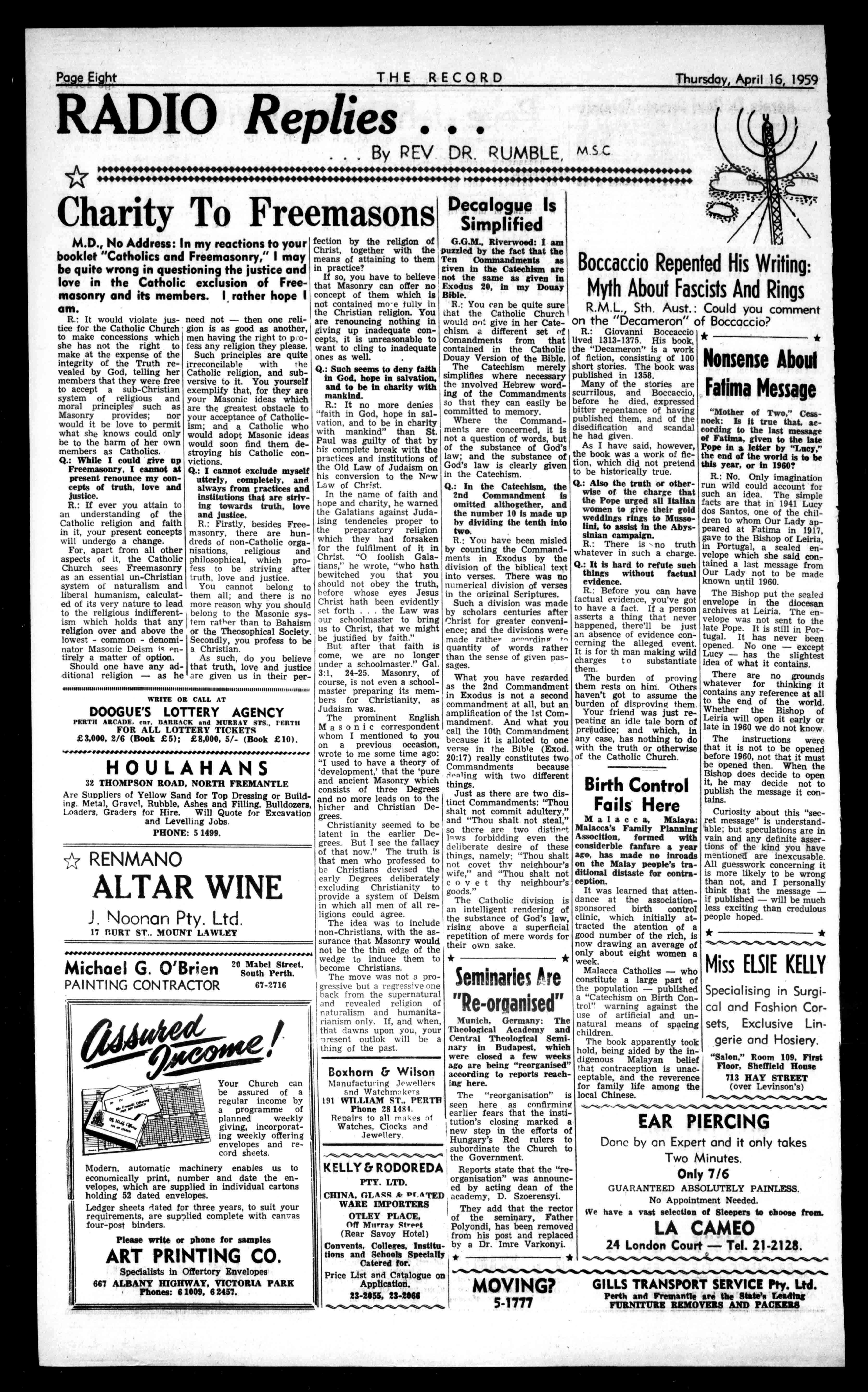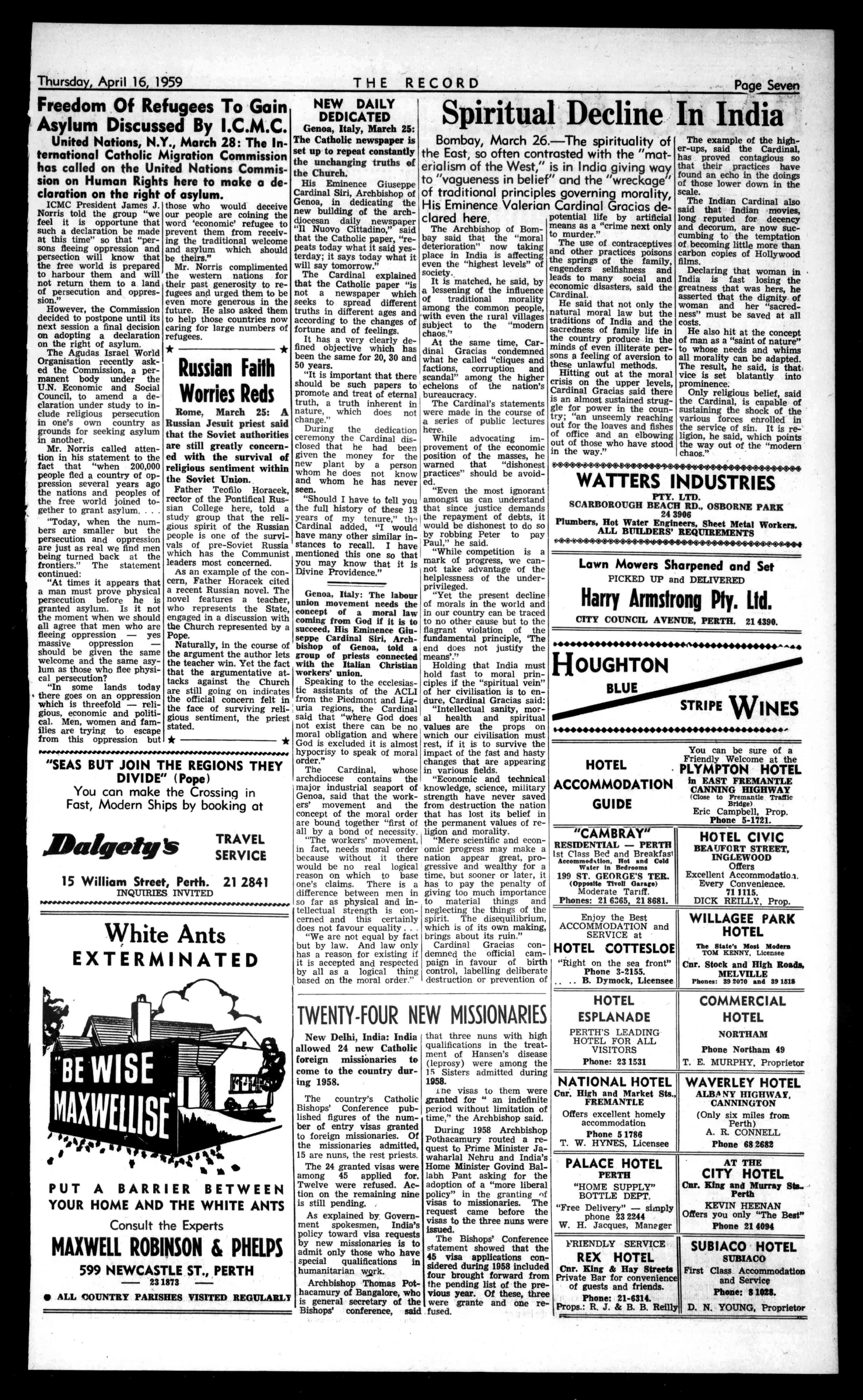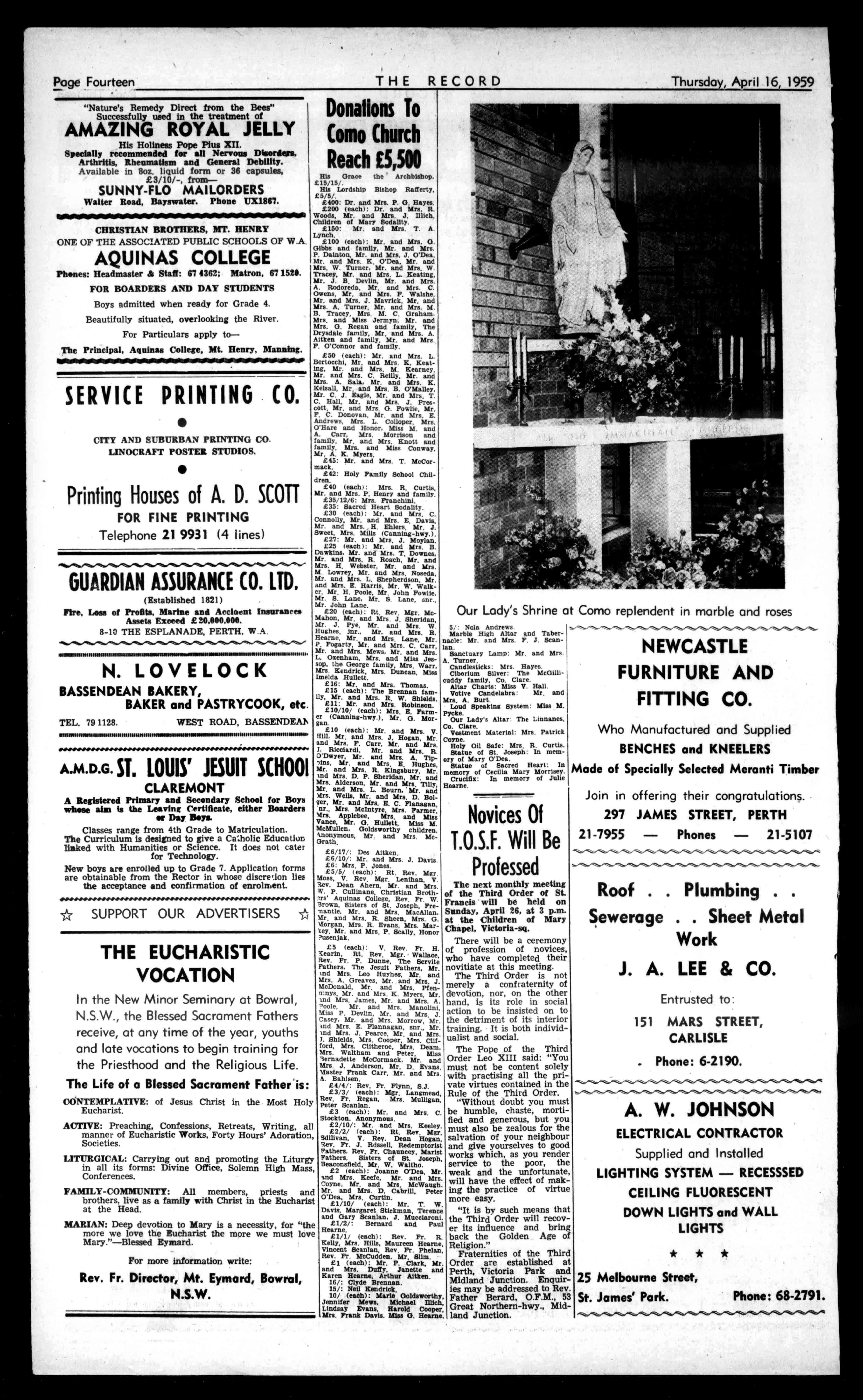 Aceeciie."-zdtie..r-e-e -# -Cp. 49, FLYTHE BIGONE FLY ANSETTANA Phone21-9651for Bookings STOPPRESS!Coming! Another triumphantfirst-prop-jetElectras willbeflownfirstby ANSETT-A.N.A. Price6d. r?ecot No.2869,Registeredatthe0.P0Perth,far transmissionbypostasaNewspaper Perth,Thursday,April16,1959 DONATIONSEXCEEDONE-THIRDOFBUILDINGCOST LargeCrowdSeesArchbishop BlessComo'sUnusualChurch menandwomenmaylisten toMary,theMotherofGod andQueenoftheholyhome atNazarethsayingnowof herSonasshesaidonthe occasionofthefirstmiracle atCana:"WhatsoeverHe shallsaytoyou,doye." SolemnPontificalBenedictionoftheBlessedSacConcludedonPage4