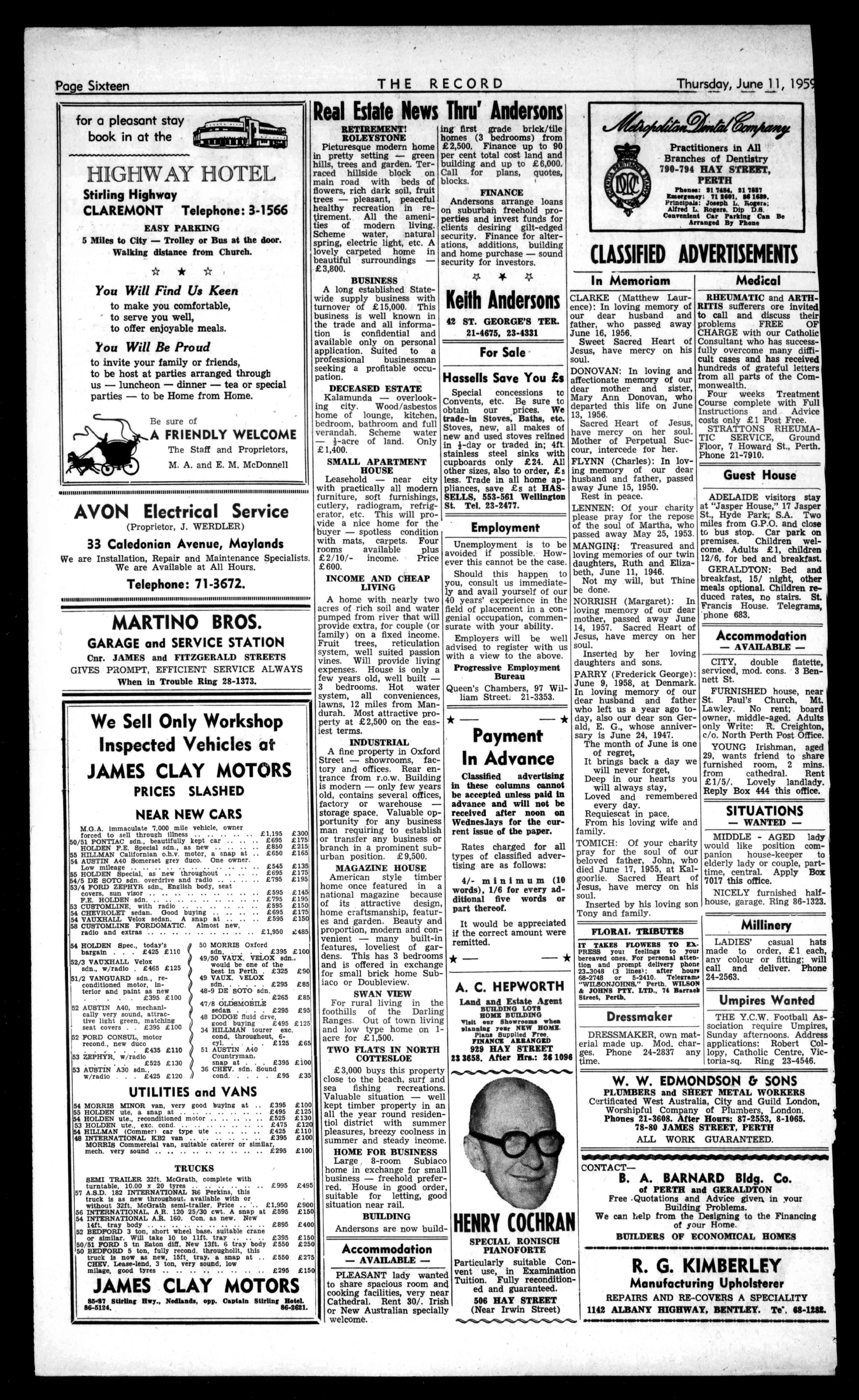 A.C.HEPWORTH LandandEstateAgent BUILDINGLOTS HONEBUILDING ',liltoarShowroomswhen .!armingYOUNEWHOME. PlansSuppliedFree. FINANCEAERANGED 929HAYSTREET 223858.AfterHrs.:261096 IN, HENRYCOCHRAN SPECIALRONISCH PIANOFORTE ParticularlysuitableConventuse,inExamination Tuition.Fullyreconditionedandguaranteed. 506HAYSTREET (NearIrwinStreet) FLORALTRIBUTES ITTAKESFLOWERSTOEXPRESSyourfeelingstoyour bereavedones.Forpersonalattentionandpromptdeliveryphone 23_3048(3lines';afterhours 68-2748or5-2410.Telegram. "WILSONJOHNS,"Perth.WILSON &JOHNSPTY.LTD.,74B Street,Perth. Dressmaker