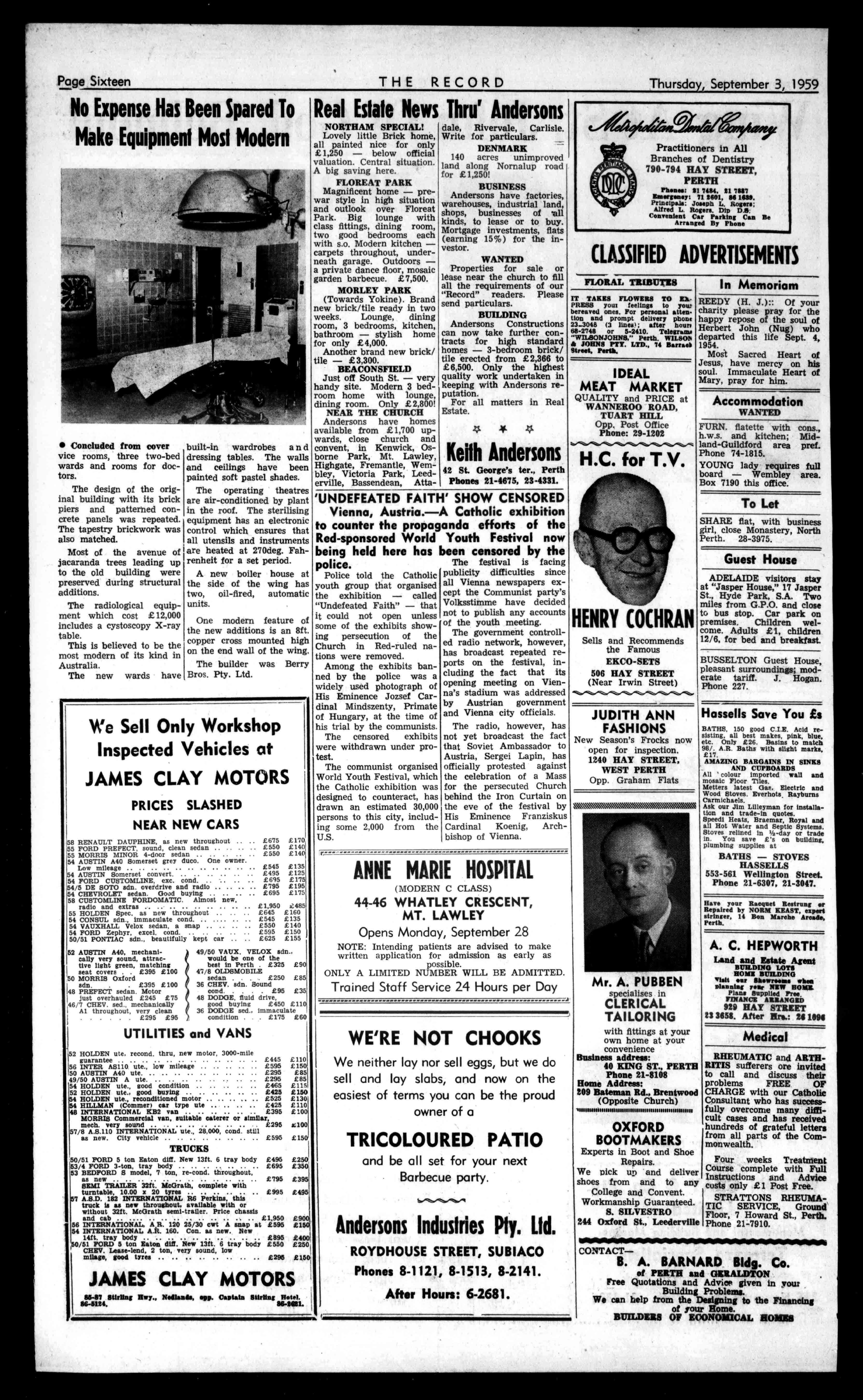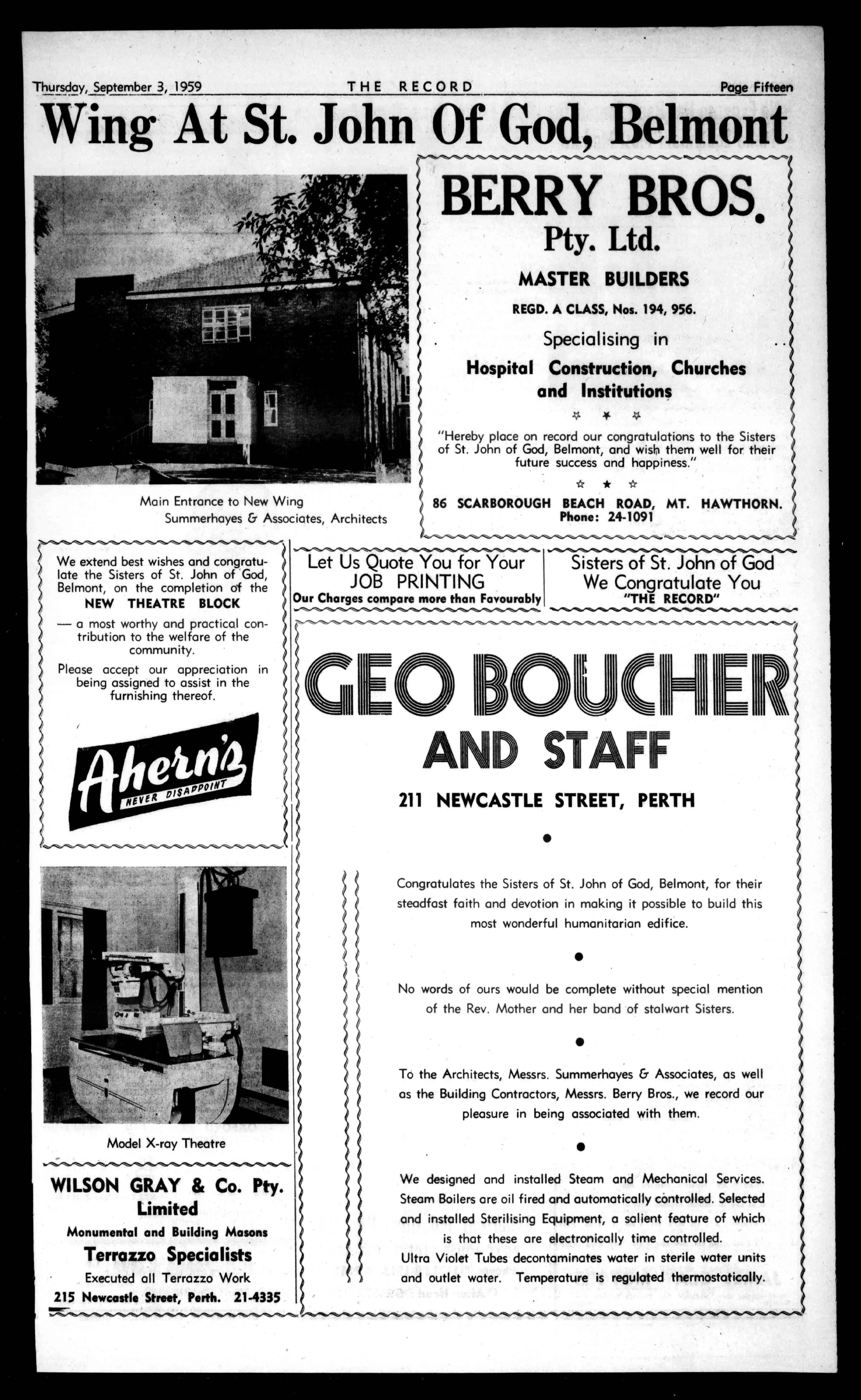 A.C.HEPWORTH LandandEstate AgentBUR.DINOLOTS HOMEBUILDING `iltearlikewrtromewhen phsnataryyearNEWBOMB. PlaneSuppliedFree. FINANCEARRANGED 920HAYSTREET 233658.AfterBro.:241092 Medical RHEUMATICandARTHRITISsufferersoreinvited tocallanddiscusstheir problems FREE OF CHARGEwithourCatholic Consultantwhohassuccessfullyovercomemanydifficultcasesandhasreceived hundredsofgratefulletters fromallpartsoftheCommonwealth. FourweeksTreatment CoursecompletewithFull InstructionsandAdvice costsonly 1PostFree. STRATTONSRHEUMATICSERVICE,Ground Floor,7HowardSt.,Perth. Phone21-7910. IIIEM1011111110111111011011811061 CONTACTB.A.BARNARDBldg.Co. ofPERTHandORRALDTON FreeQuotationsandAdvicegiveninyour BuildingProblems. WecanhelpfromtheDesigningtotheFinancing ofyourHome. BUILDEROFECONOMICALRODIE8