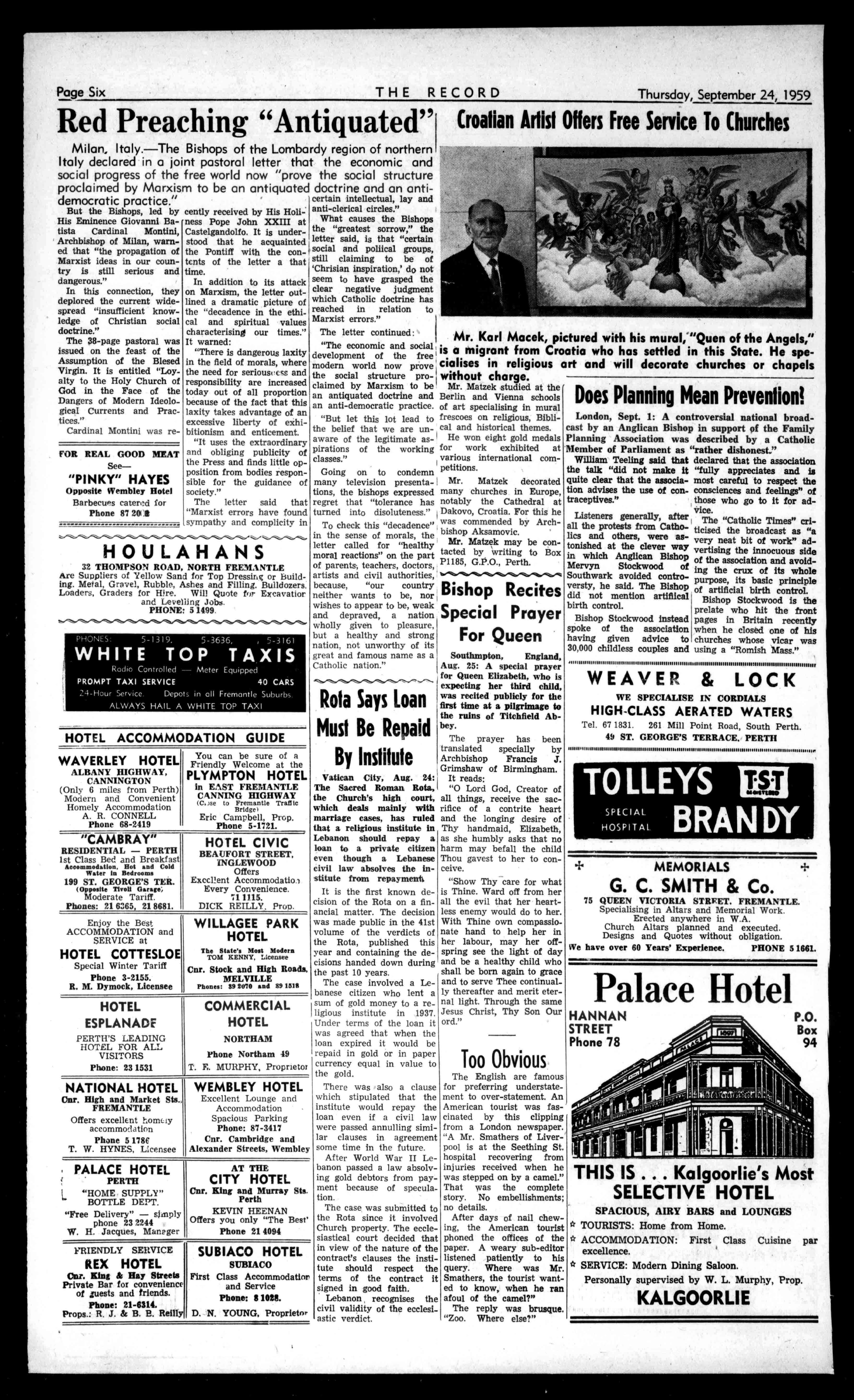 /t414Z//1.11e6446.e/f_e,e4.4ea,-/-iee, (5,e4e, -c45-04(tr HASSELLS SaveYouEES's on BATHS-BestMakes BASINS STAINLESSSTEELSINKS CUPBOARDS TILES-FloorandMosaic STOVES-BestMakes (Gas,ElectricorWood) HOTWATERSYSTEMS BigSavingsonBuilding andPlumbingSupplies at HASSELLS 553-561WELLINGTONST. Phones21-6307.21-3047. rLENri t?ecot ll0.1014I! No.2892'Registered atthe0.P.O.,Perth,for transmissionbypoetasaNewapape'' Price6d. Perth,Thursday,Sept.24,1959 NOW!BuytheBargains oftheYearatPilkington's TheTownHallisopposite ANNIVERSARYand STOREEXPANSION SALE! 602HAYSTREET TheTownHallisopposite CardinalAgagianianPaysNotable HisEminenceGregoryPeterCardinalAgagianian,Patriarch ofCiciliaoftheArmeniansandPro-PrefectoftheSacredCongregationofthePropagationoftheFaith,arrivedatPerthAirport onMondaynightlastonatwo-dayvisittothisState.