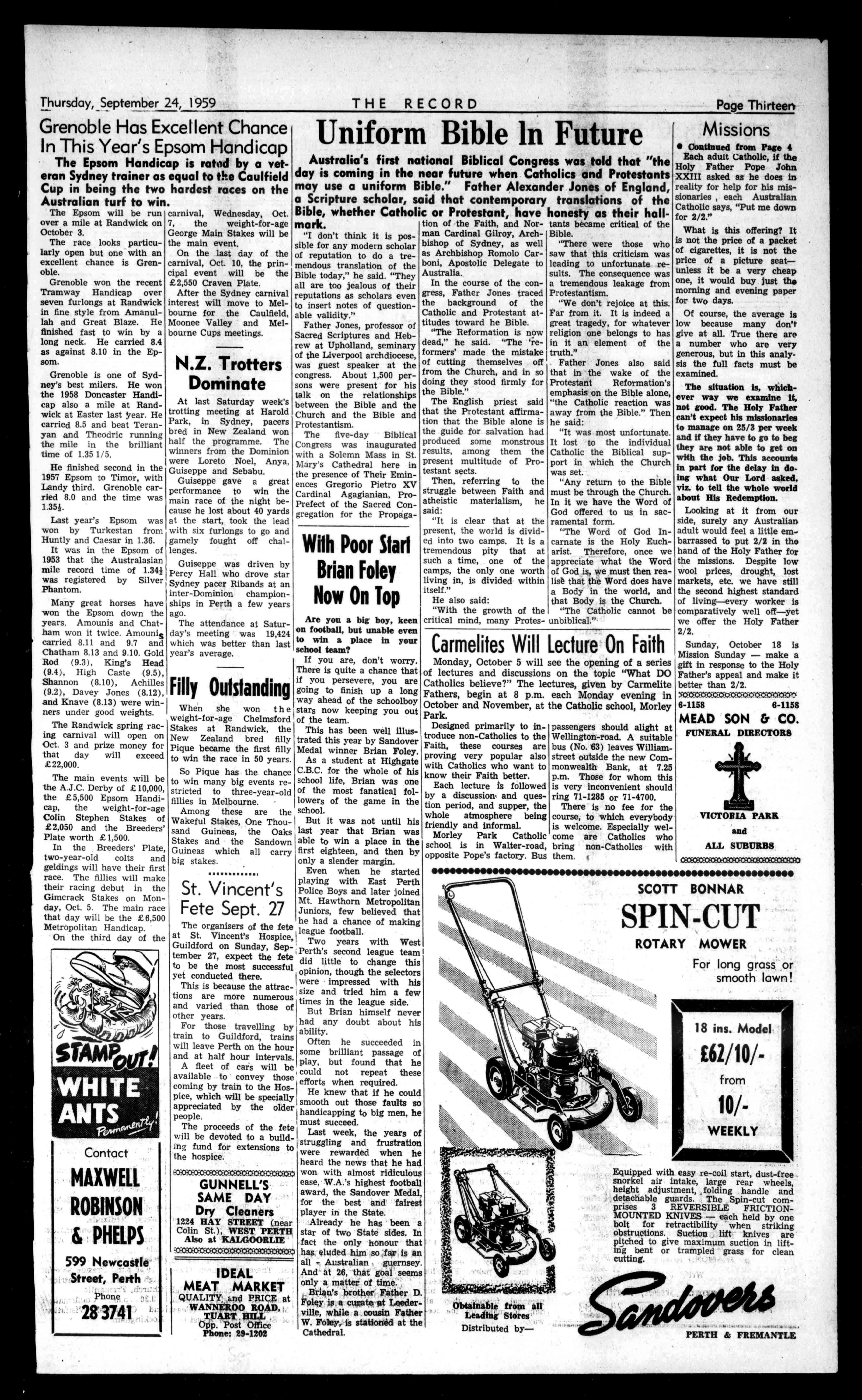 PageSixteen THERECORD Thursday,September24,1959. £50REWRRD THISPROPERTY ISBEING BYTHE AUSTRALIANWATCHING ISYOURS? 3980"" KELLY&RODOREDA PTY.LTD. CHINA,GLASS&PLATED WAREIMPORTERS OTLEYPLACE, ORMurrayStreet (RearSavoyHotel) Convents,Colleges,InstitutionsandSchoolsSpecially Cateredfor. PriceListandCatalogueon Application. 23-2055.23-2066 JAMES CLAY MOTORS Nedlands 83-87STIRLINGHWY. Capt.StirlingHotelopp. 86-2621 86-5124 All vehicleshavebeen workshopinspectedandnow carrya6monthsmaintenance atcostwarranty. Pre-Show Sale BARGAINS GALORE CashDep. 58MORRISMajor 5.000miles 850215 FEHOLDENSpec825210 56,7PREFECTDe luxe28.000mls, 595150 55HOLDENSpec 665160 55MORRISMinor 4dr. 550140 54AUSTINMO Somerset 545135 54AUSTINSomerset Convert 495125 54FORDCustomline. Immac. 695175 1954/5DESOTOeft. overdrive&radio795195 54/5C'dEV.sdn. 695175 58CUSTOMLINE Pordomatic,W/r.1,795450 55HOLDENSpec. 645160 54CONSULsdn. 550135 54PORD radioZephyrw/595150 52HILLMANsdn.very cleanA,soundcar425110 50/1PONTIACsdn., beaut.keptcar 650165 S2AUSTINA40,immaculate 395100 50/51MORRISOxford sdn 395100 48DODGEFluid drive,bestoffering 450110 47/8OLDSMOBILE sdn. 25085 92FORDTwinspin. 295100 Wewilltradeyourprevent carandifunderhirepur- chase,paythebalanceout, thewholeoftheremainder canbeleftasadepositor ifinexcessoftherequireddeposit.cashwillbepaid toyou. EXAMPLE YOURPRESENT CARtradedat £575 Payouttofinance company £200 leavingbalanceof £375 Ourchequetoyou for 1175 beingdepositon anothervehicle £200 /fadvehiclenotbeenander hirepurchasewecould haverivenyouourskew forL375. 41.44.4.04,00.0.41,04.04,00.. UTILMEMANDVANS 54HOLDENate 495125 14HILLMAN(Cointilerute 421100 115HOLDENute., recoridmotor 525130 ftINTERNATIONAL AM!10ute28.000 tithes 595150 IdWILIAMut. rterundmotor 475120 411INTERKay can 296IOU 49/1.0AtflITINA ate 23660 SOMORRISCons morclalvan an100