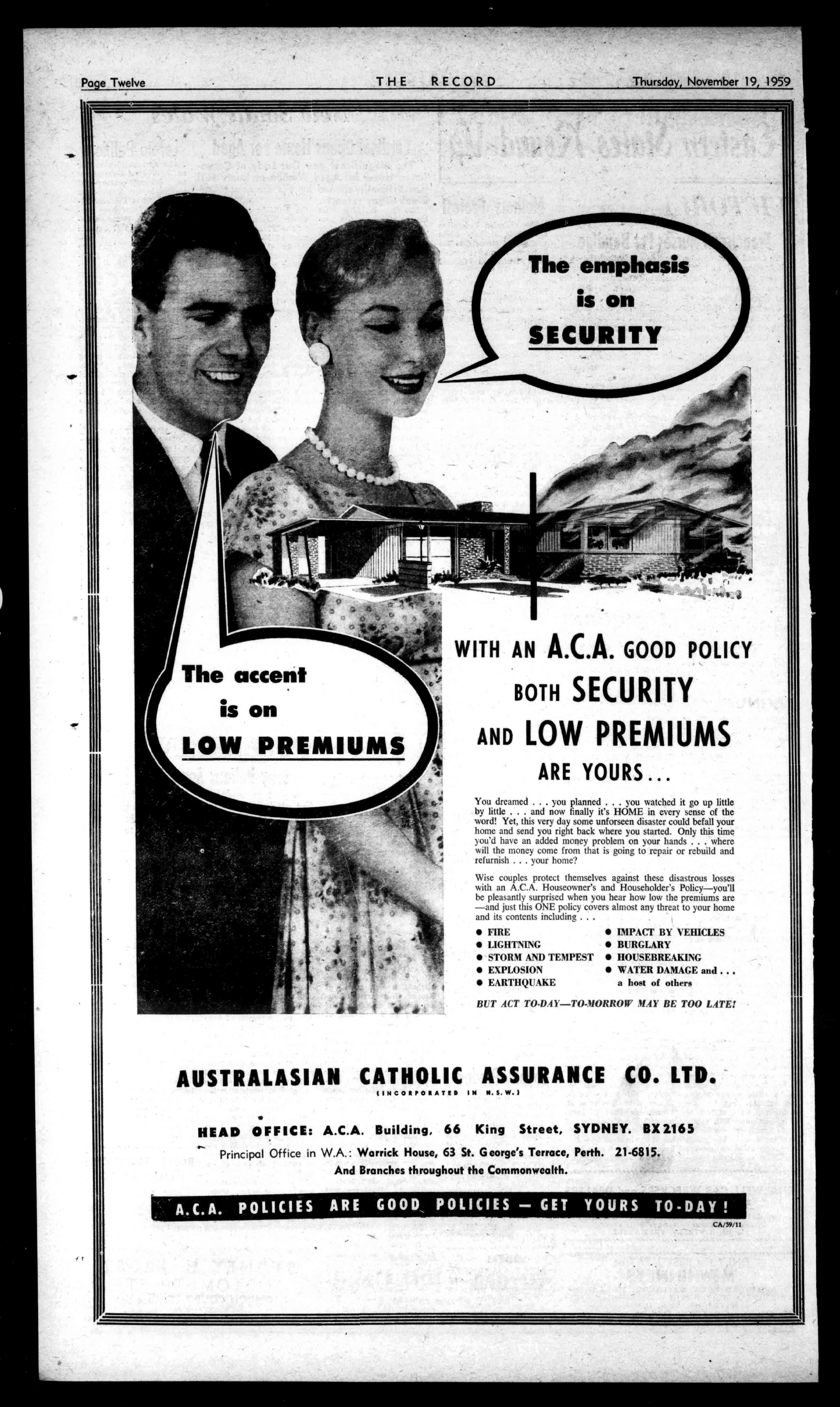 area, FLORALTRIBUTES ITTAKESFLOWERSTOEXPRESSyourfeelingstoyour bereavedones.Forpersonalattentionandpromptdeliveryphone 23-3048(3lines,:afterhour. 68-2748or5-2410.Telegram. "WTLSONJOHNS."PerthWILSON JOHNSPTY.LTD.,74Itarraeli Street,Palk herr.14,4,44erherhee.erre....P.IvNeareel HASSELLSSAVE YOUL's lotqualityBATHS,allcolours, £17,were£32,(Wetrade15.5 GoodusedBaths,£8.Allmakes ofBathsL'sless.4ft.5.5. Sinks,£13;4'6",£14;5', £15.AllsizeCupboards,lamfoesunits.Ironbronzewire Doors,92/6.ColourTiles,45,'yd.AllStoves,NettersR.C. EnamelStoves,£14,Everhot, Rayburn.Carmichael,Braemar, Royal, septicSpeedi-Heathotwaterand system.Stovesrelinedin 'A-dayortradedin.Wequoteto install.SaveC'sonallbuilding atippl!esat HASSELLS 21-3047. 533-561WELLINGTONST. PrintedandpublishedbyFrancis JosephDillon,TheRecord"office, 450Hay-st.,Perth. W.W.EDMONDSON&SONS PLUMBERSandSHEETMETALWORKERS CertificatedWestAustralia,CityandGuildLondon, WorshipfulCompanyofPlumbers,London. Phones28-1714.AfterHours:87-2553,8-1065. 78-80JAMESSTREET,PERTH ALLWORKGUARANTEED. C8:8:9)3:8:118:81M0301:1011:1°CRICCCitataat8a1:8:13:8:8101:iti W.F.SAMSON R.E.I.W.A. 5QUEENSTREET,FREMANTLE REALESTATEAGENT,AUCTIONEERandSWORNVALUATOR RentsCollected,EstatesManaged.Representing:Queensland InsuranceCo.Ltd.,RoyalAutomobileClubofW.A.lee R.A.C.InsurancePty.Ltd. Telephones-Office:5-1316,5-3770-Private::WF.Samson,5-25531 G.0.Samson,89-1653. DoyourTrimandCARINSURANCEatthesameoffice, AllR.A.C.SubscriptionsandInsuranceReceived, CONTACTB.A.BARNARDBldg.Co. ofPERTHandGERALDTON FreeQuotationsandAdvicegiveninyour BuildingProblems. WecanhelpfromtheDesigningtotheFinancing ofYourHome, BUILDERSOFECONOMICALHOMES