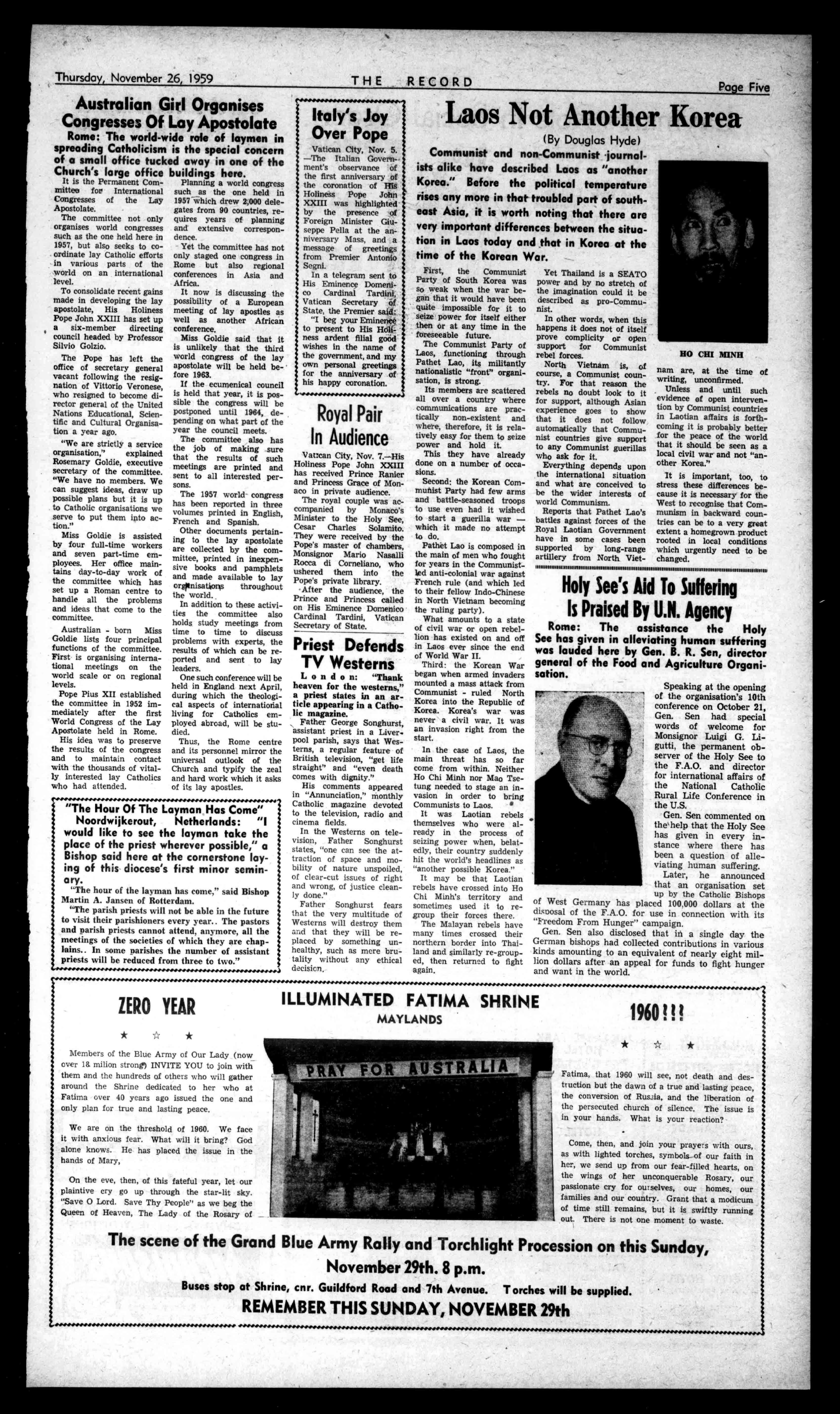 Itgivesmegreatpleasuretoinformyouthat HisExcellencytheApostolicDelegatehasforwardedtotheSovereignPontiffPopeJohnXXIII themunificentPeter'sPenceofferingfromthe ArchdioceseofPerthfortheyear1959,inthe amountofonethousandfivehundredandeightyfivepounds,eighteenshillings,andsixpence. ByvirtueofthehighOfficetowhichHewas electedayearago,theCommonFatherhasthe responsibilityofpromotingtheChurch'sinterest andwelfarethroughouttheworld.IfHeistobe abletofurthervariousprojectsofapostoliczeal, itwillbedueinlargemeasuretothemagnanimoussolidarityandunflinchingsupportofthose who,likeYourGraceandthegoodpriestsand faithfulpeopleofPerthArchdocese,haverepeatedlytestifiedtheiratachmenttotheHolySee bymakingconspicuousdonationslikethepresent offering.