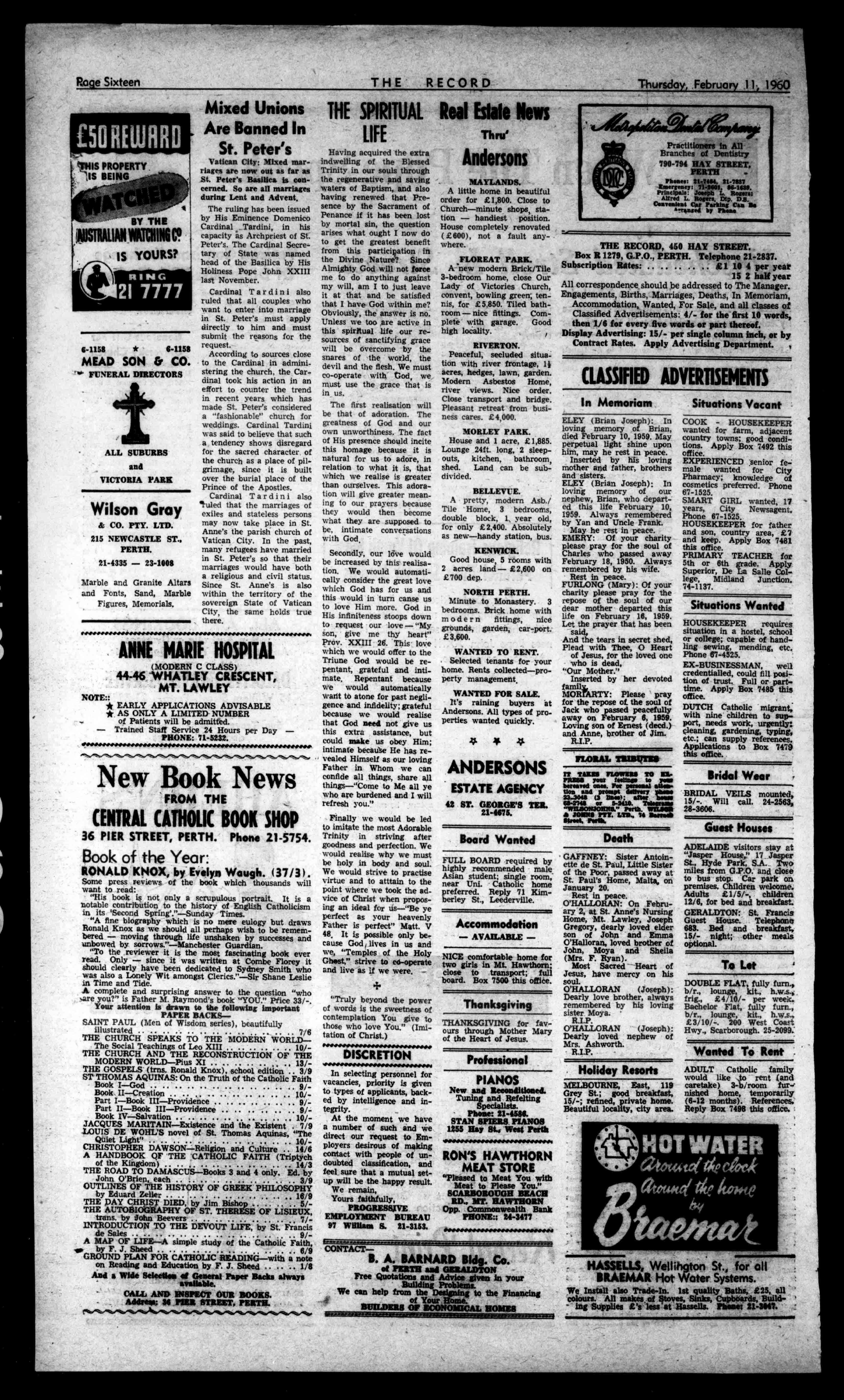 PAYCHRISTDIED,byjimBishop..-5/THEAUTOBIOGRAPHYOFST.THERESEOFLISIEUX, trans.by;JohnBeevers _ 7/INTRODUCTIONTOTHEDEVOUTLIFE,bySt.Francis de Sales AMAPOFLIFE-1Asimples.tuclyofiheCatholicFaith, ipbyF.J.Sheed --- 6/9 GROUNDPLANFORCATHOLICREADING-withanote onReadingandEducationbyF.J.Sheed 1/8 AndaWideSelectionatGeneralPaperBacksalways available. CALLANDINSPECTOURBOOKS. Addrisaa;34PIERSTREET.PERTH. RealEstateNews P.1 DISCRETION Thru' Andersons MAYLANDS. Alittlehomeinbeautiful orderfor£1,800.Closeto Church-minuteshops,station-handiestposition. Housecompletelyrenovated £600),notafaultanywhere. 4.4. Inselectingpersonnelfor vacancies,priorityisgiven totypesofapplicants,backedbyintelligenceandintegrity. Atthemomentwehave anumberofsuchandwe directourrequesttoEmployersdesirousofmaking contactwithpeopleofttndoubtedclassification,and feelsurethatamutualsetupwillbethehappyresult. Weremain, Yoursfaithfully, PROGRESSIVE EMPLOYMENTBUREAU 97WilliamS.21-3153. FLOREATPARK. A.newmodernBrick/Tile 3-bedroomhome,closeOur LadyofVictoriesChurch, convent,bowlinggreen;tennis,for£5.850.Tiledbathroom-nicefittings.Completewithgarage.Good highlocality. RIVERTON. Peaceful,secludedsituationwithriverfrontage,1} acres,hedges,lawn,garden. ModernAsbestosHome, riverviews.Niceorder. Closetransportandbridge. Pleasantretreatfrombusinesscares.£4,000. MORLEYPARK. Houseand1acre,£1,885. Lounge24ft.long,2sleepouts,kitchen,bathroom, shed.Landcanbesubdivided. BELLEVUE. Apretty,modernAsb./ TileHome,3bedrooms, doubleblock,1.yearold, foronly£2,400.Absolutely