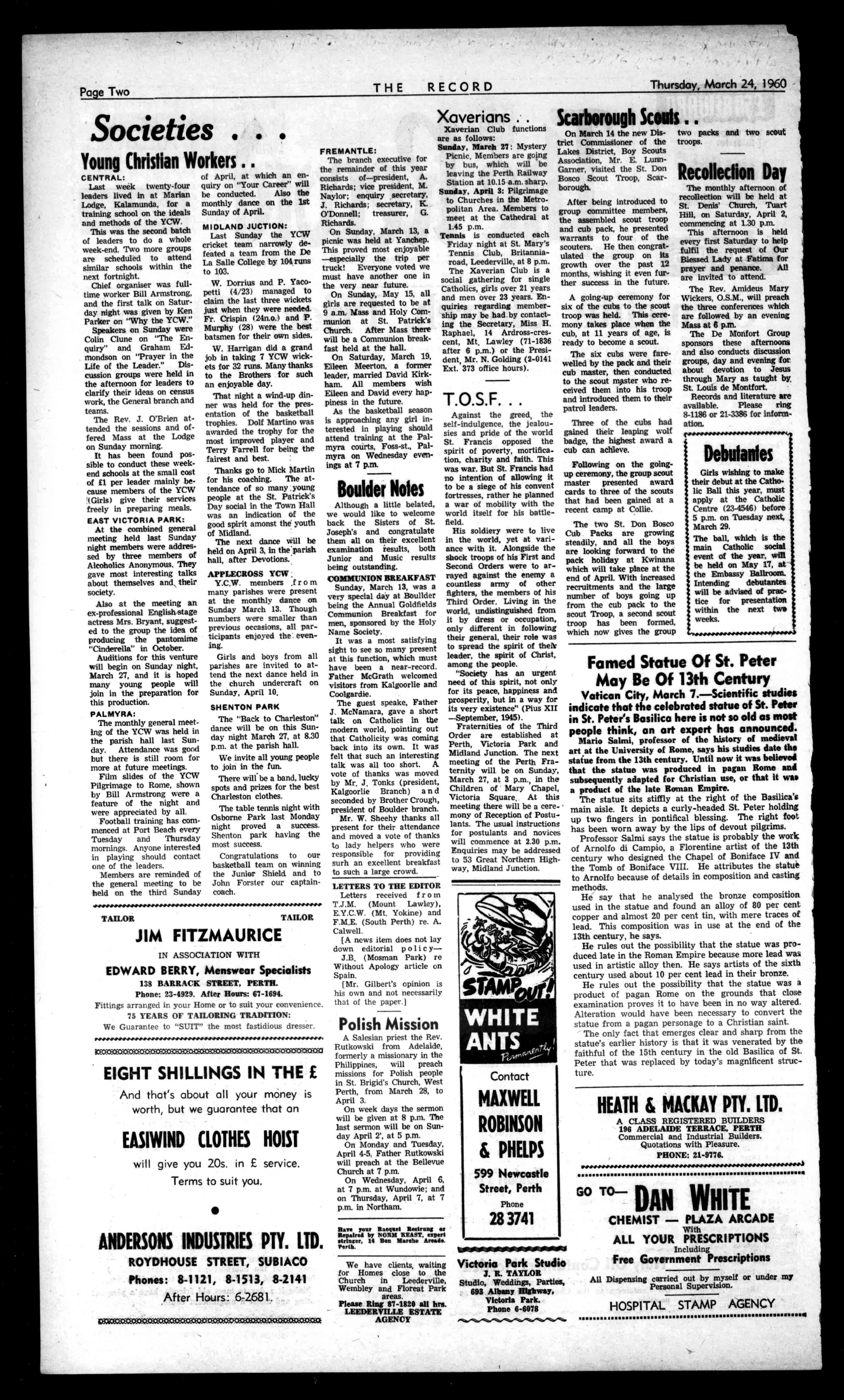 SAMSON F.C.I.V.,R.E.I.W.A. 5QUEENSTREET,FREMANTLE REALESTATEAGENT,AUCTIONEERandSWORNVALUATOR RentsCollected,EstatesManaged.Representing:Queensland InsuranceCo.Ltd.,RoyalAutomobileClubofW.A.(Inc.), R.A.C.InsurancePty.Ltd. Telephones-Office:5-1316,5-3770-Private::WF.Samson,5.25531 G.0.Samson,39-1653. DoyourFIREandCARINSURANCEetthesameoffIce. AllR.A.C.SubscriptionsandInsuranceReceived. W.W.EDMONDSON&SONS PLUMBERSandSHEETMETALWORKERS CertificatedWestAustralia,CityandGuildLondon, WorshipfulCompanyofPlumbers,London. Phones28-1714.AfterHours:87-2553,8-1065. 78-80JAMESSTREET,PERTH ALLWORKGUARANTEED. ANNEMARIEHOSPITAL (MODERNCCLASS) 44-46WHATLEYCRESCENT, MT.LAWLEY NOTE::*EARLYAPPLICATIONSADVISABLE *ASONLYALIMITEDNUMBER ofPatientswillbeadmitted. -TrainedStaffService24HoursperDayPHONE:71-5232. CONTACTB.A.BARNARDBldg.Co. ofPERTHandGERALDTON FreeQuotationsandAdvicegiveninyour BuildingProblems. WecanhelpfromtheDesigningtotheFinancing ofYourHome. BUILDERSOFECONOMICALHOMES HOTWATER atowitae e 0temtt.4 HASSELLS,WellingtonSt.,forall BRAEMARHotWaterSystems. WeInstallalsoTrade-In.1stqualityBaths,£25,all colours.AllmakesofStoves,Sinks,Cupboards,BuildingSuppliesVslessatHassells.Phone:21-3047.