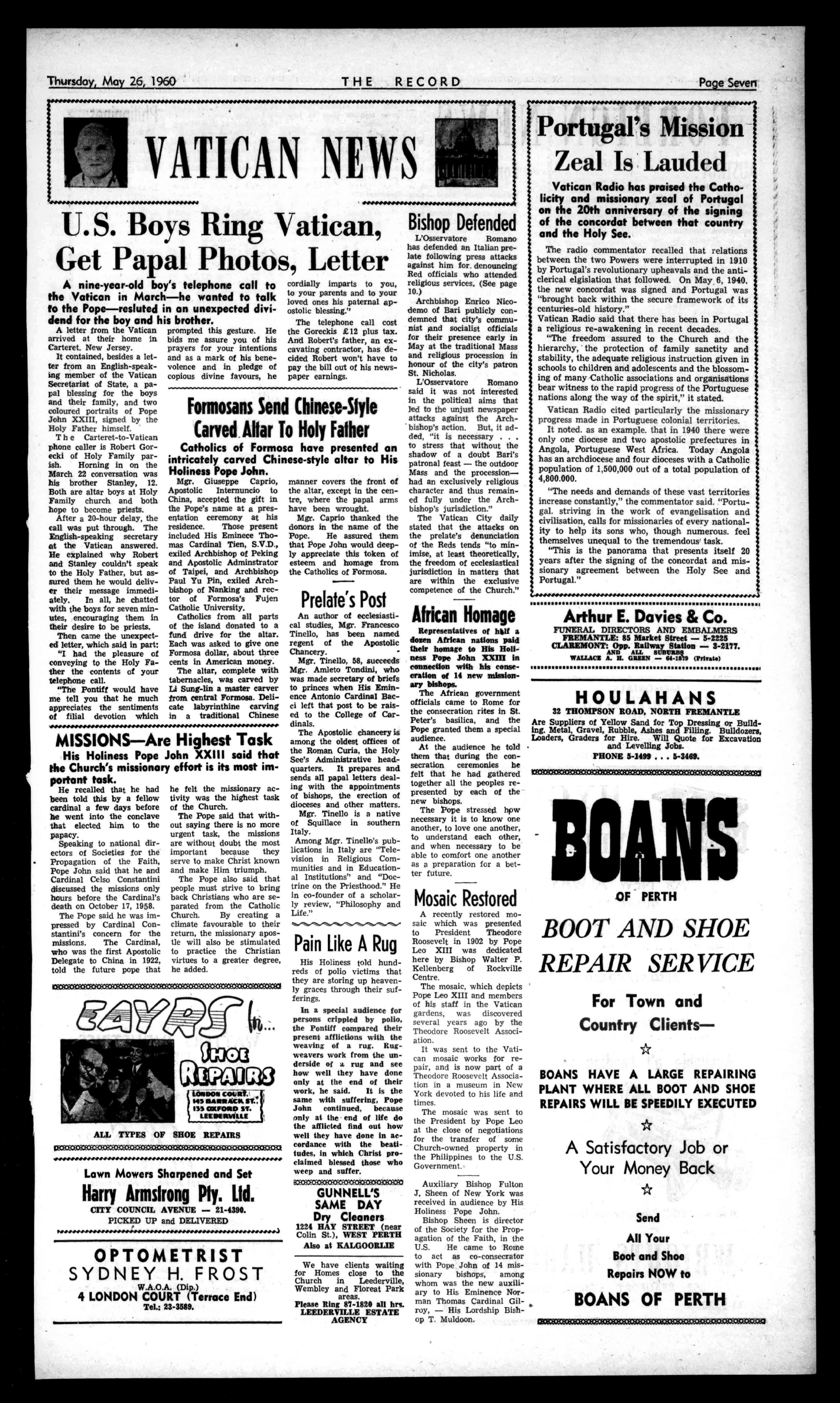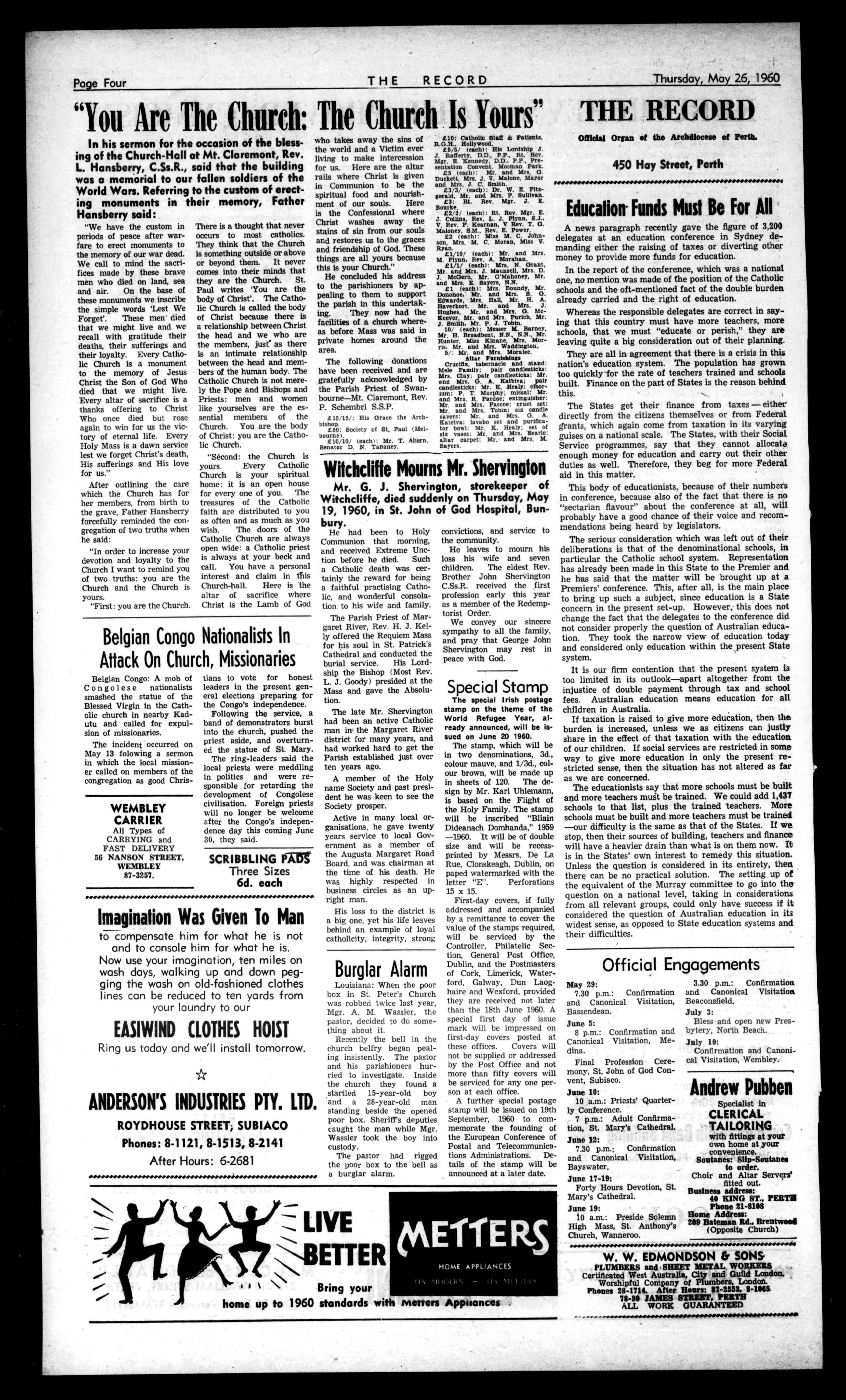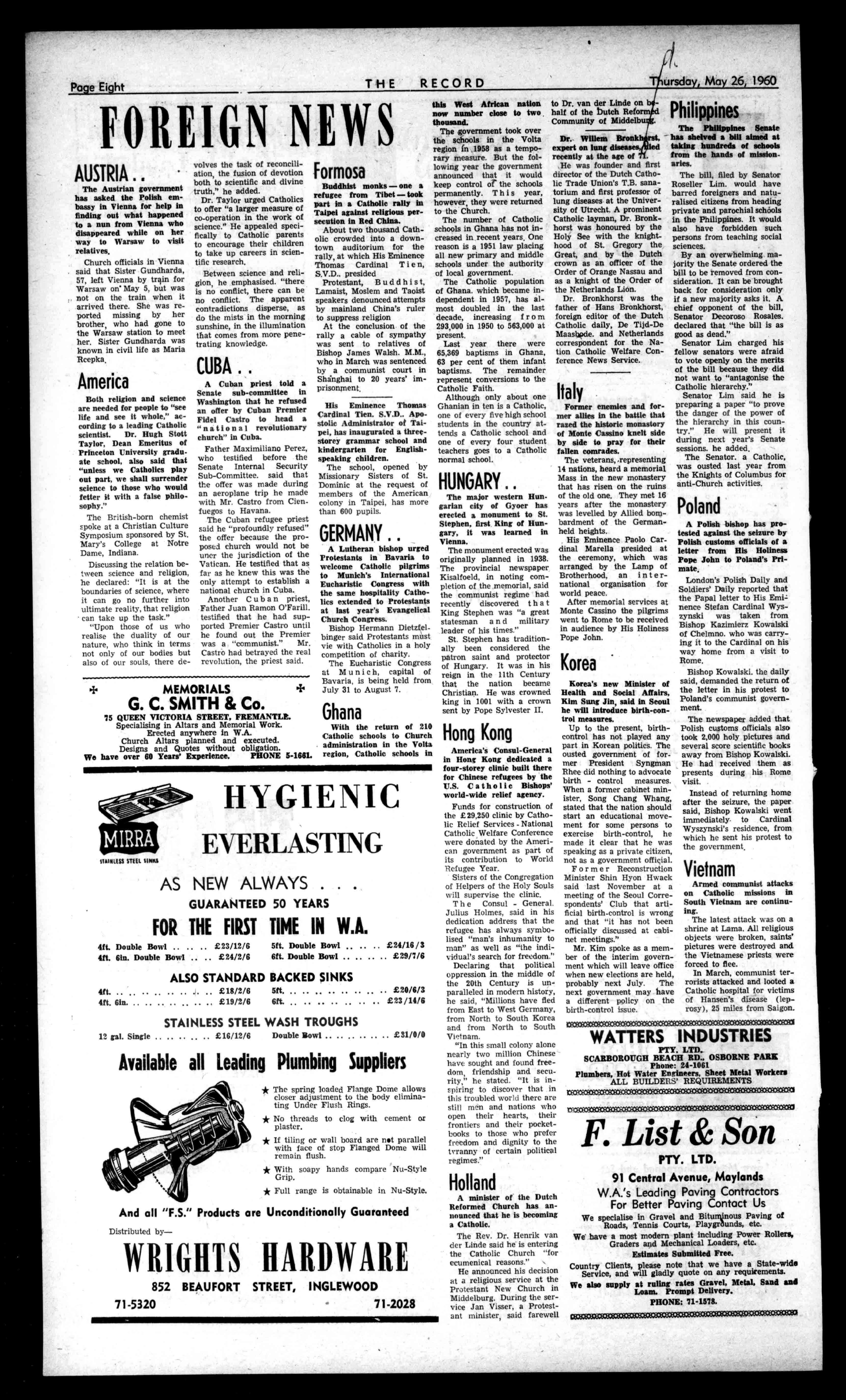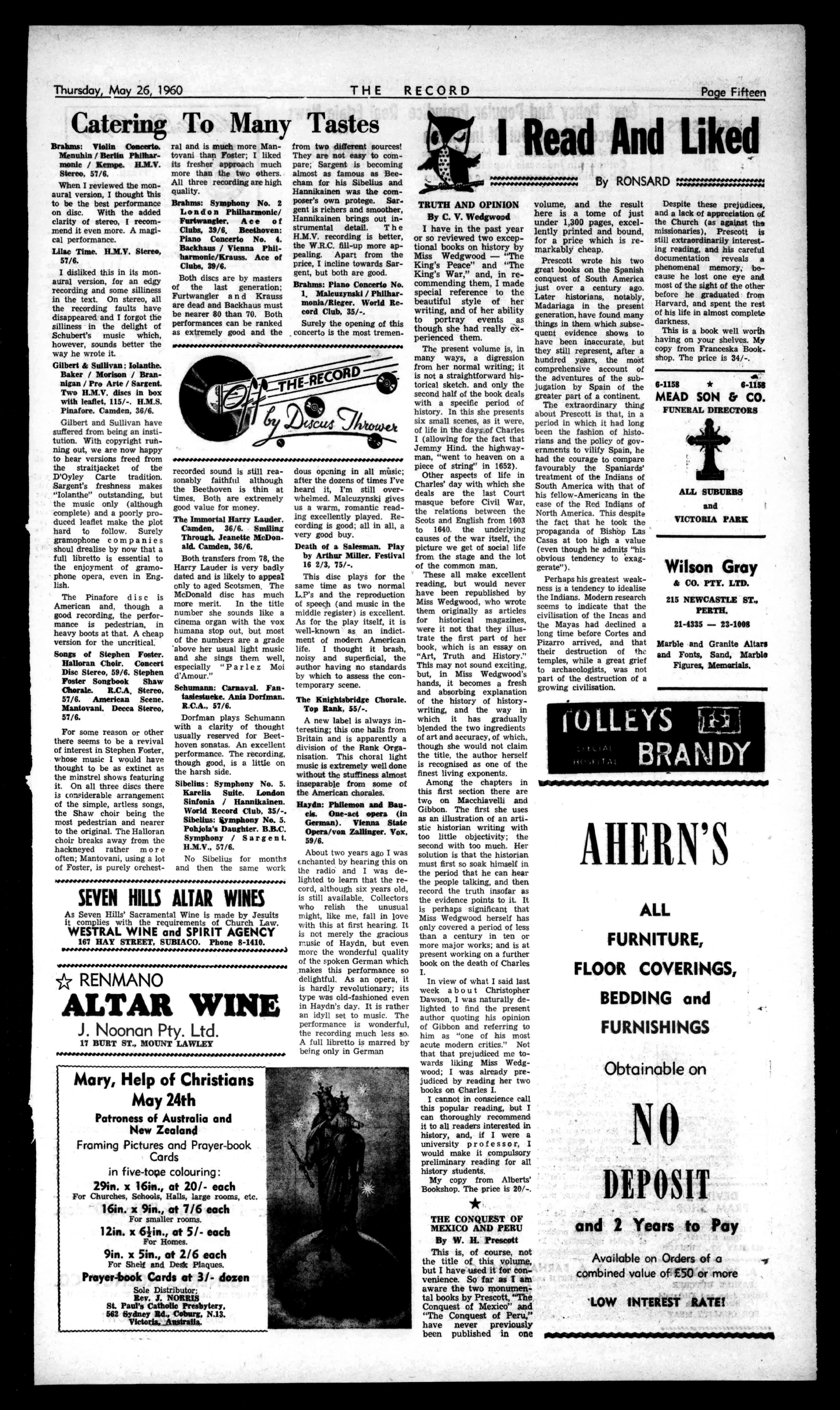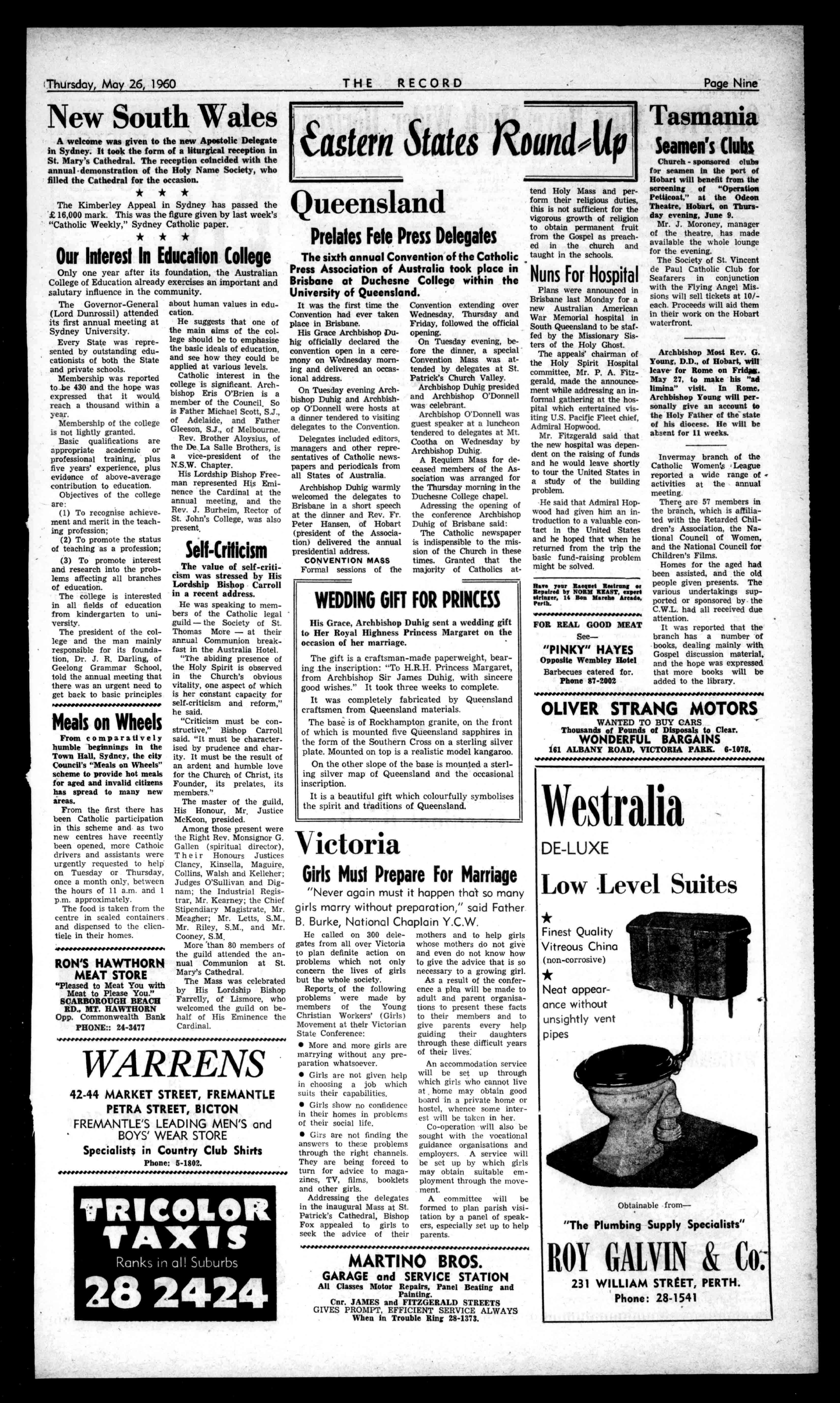 otiatstienandAdviesgiverlvse,. rl,iildingProblem, .beDesigning 'to.Ft,i YourHerne F(IONo'lltt55.154 RealEstateNews Thru' Andersons DIANELLA NewmodernBrickhome populardesign2beds/sS.O. Nicecupboardfittedkitchen dinetteClosetrolley£3600 Terms. BELMONT NewStylishBrickhome ingoodlocality(nearly completed).Wellfittedmodernhome,£3,250.Terms. MAYLANDS FourroomAsbestoshouse, clean,painted,goodsound orderfullyfurn,Refrig.etc. Closeshopcentre,Railway, Town-hall.£1650thelot. WESTPERTH £1850buyswellkept J.W.B.withprettygarden, seclusion. Closemodern school.Veryconvenient. INGLEWOOD Closeconventschool.5 yearoldbeautifullykept BrickTilehomewithcarpetseveryconvenience, lawnsetc.£4125. RIVERVALE Central,closechurch, mainshopcentre.Classhome expensivelyfittedlarge rooms,brightwithwindows. Lounge20x17,2largebedrooms,tiledbathroom,kitchendinette,35footsun room,S.O.Garageandterrace.Lovelygarden,With carpets£4300. FORLEASE PetrolServiceStationon highway.Garage,plantetc. £3p.w.Flatavailable£3. FarmletBullsbrook,55 acres.Sheepgrazingproperty. £300year. PROPERTYADVICE Withaboominproperty andbuildingnowimminent Andersonsfreeadviceand valuationisattheservice ofallRecordreaders. ANDERSONS 42ST.GEORGE'STER. 21-4675, HomeNumber71-6167. MOTORISTSTUCKERand AURISCH are RADIATORSPECIALIATS AllReplacementsandRepairsby QualifiedTradesmen, PHONE21-2107 orCall 1012HAYST.,PERTH Professional PIANOS NewandReconditioned. TuningandRetelling Specialists. Phone:21-4586. STANSPIERSPIANOS 1255HaySt.,WestPerth dINIVNIININPIN11414P.I.N1141.41,11.41,4411114141\1111S/4 SaveL'satHASSELLS Seeusbeforebuyingar.yhome appliances,T.V.,WashingMachines,Stoves,HotWaterSystems,etc. AllBuildingandPlumbingsup-pliesverylowestprices.Nointerest onterms.NewBaths,allcolours, from£17.Tiles,45/-yard. EnamelWoodStoves,£14.Bronze wireGrillDears,88/,Barrows, 59;6.StainlessSteelSinksand Drainersfrom510/10/-,sizesup to7ft.LargestdisplaysinW.A., over100Baths,Stoves,Cupboardstochoosefrom.Stoves relinedortradedin.Itcoatyou lessat HASSELLS 653-561WELLINGTONSTREET. 114047. esess.e...m.s.s.sosseswoow.s.sess SPORTING Equipment SEEGeoffO'NeiII (LateofTambellup at PractitionersinAll BranchesofDentistry 790-794HAYSTREET. PERTH Phone.:21-7484,81-7837 Rimerl 71-2601,84-1619, Principals:JosephL.Rogers: AlfredL.RogersDip.D.S. CsvealentCarParkingCamBe vaisgedby?beim THERECORD,450HAYSTREET. BoxR1279,G.P.O.,PERTH.Telephone21-2837. SubscriptionRates 1132peryear 167halfyear AllcorrespondenceshouldbeaddressedtoTheManager. Engagements,Births,Marriages,Deaths,InMemoriam, Accommodation,Wanted,For'Sale,andallclassesof ClassifiedAdvertisements:4/-forthefirst10words, then1/6foreveryfivewordsorpartthereof. DisplayAdvertising:15/-persinglecolumninch,orby ContractRates,ApplyAdvertisingDepartment. CLASSIFIEDADVERTISEMENTS Deaths CUNNINGHAM(Sr.M. Teresa,PresentationConvent,Geraldton):OnMay 5,atSt.JohnofGodHospital,Subiaco,lovedsister