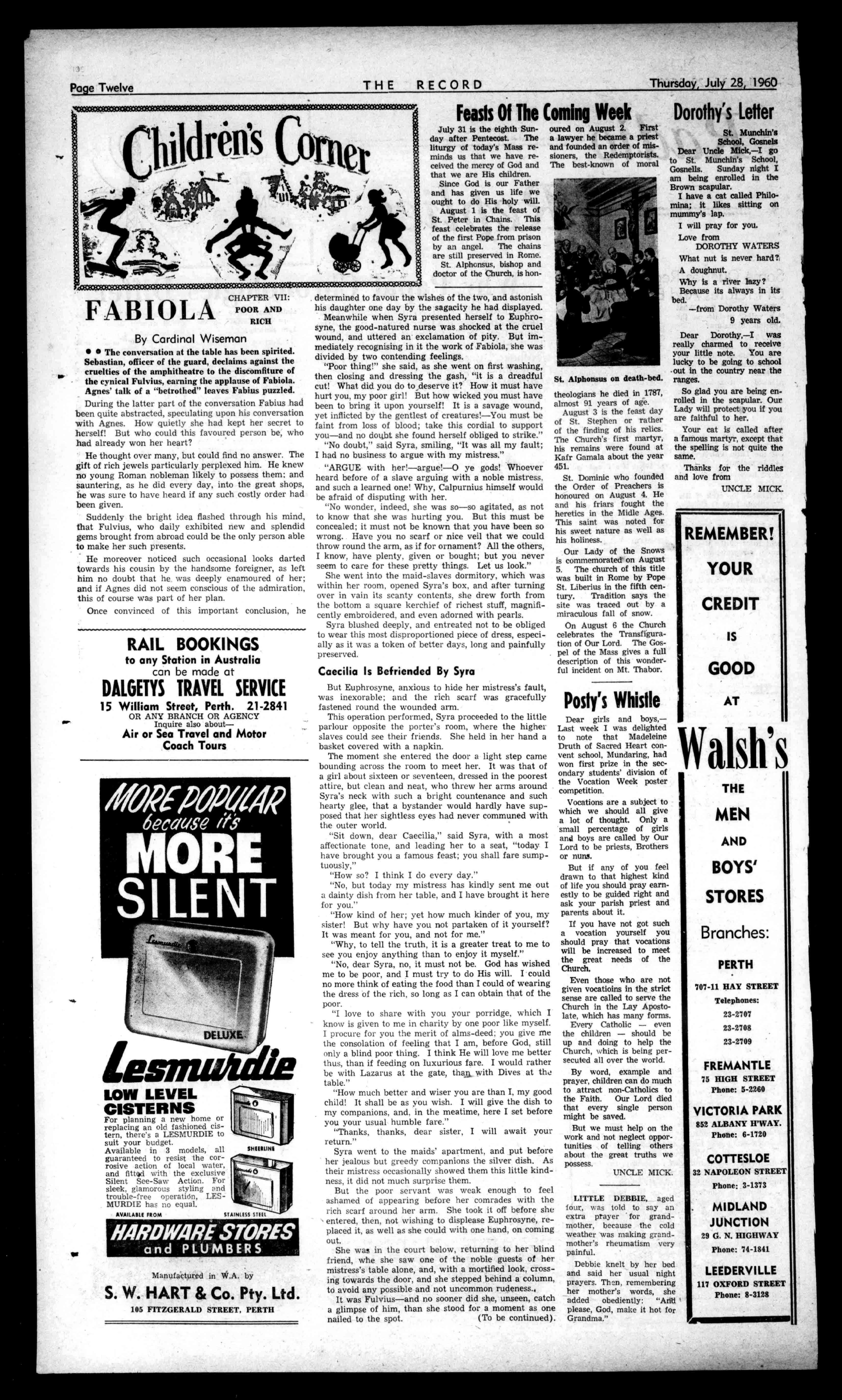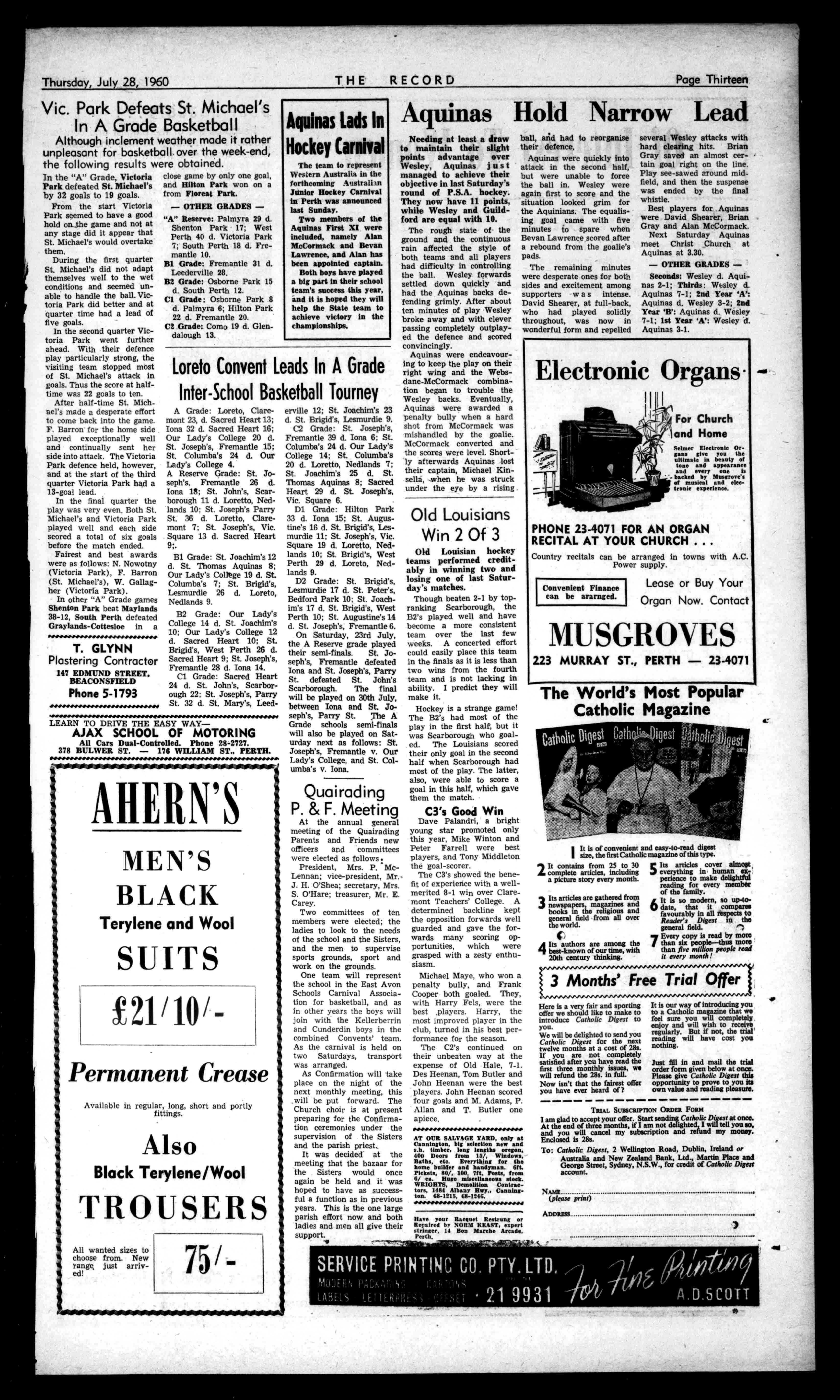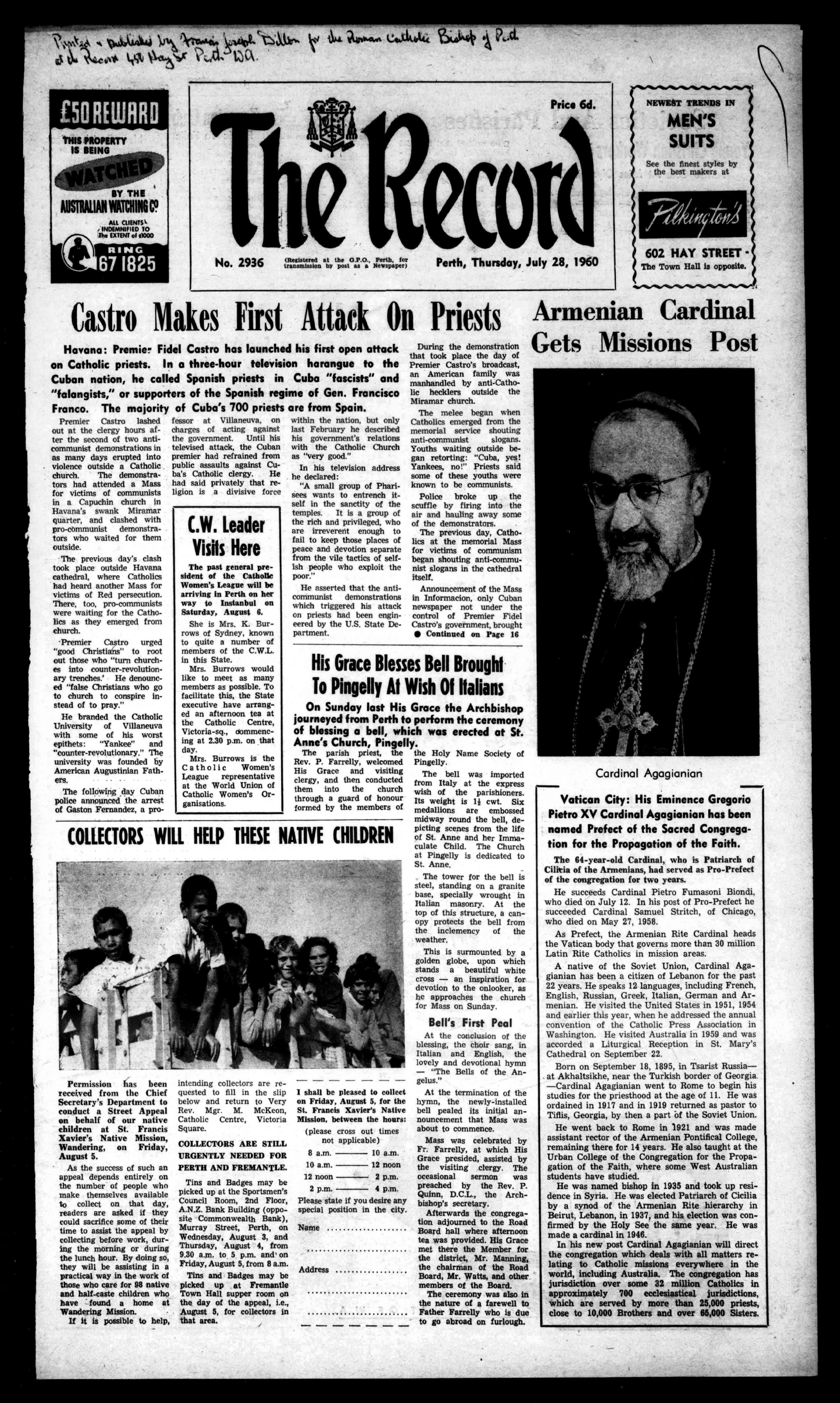 nay', 1.:;)(A AllCLIENTS, INDEMNIFIEDTO to.EXTENTof10000 RING 671825 Price6d. The1?ecot ,T No.2936 (RetisteredattheGP0Perth.for transmissionbypoolasaNewspaper) Perth,Thursday,July28,1960 NEWESTTRENDSIN MEN'S SUITS Seethefineststylesby thebestmakersat ?lyetia 602HAYSTREET TheTownHallisopposite.