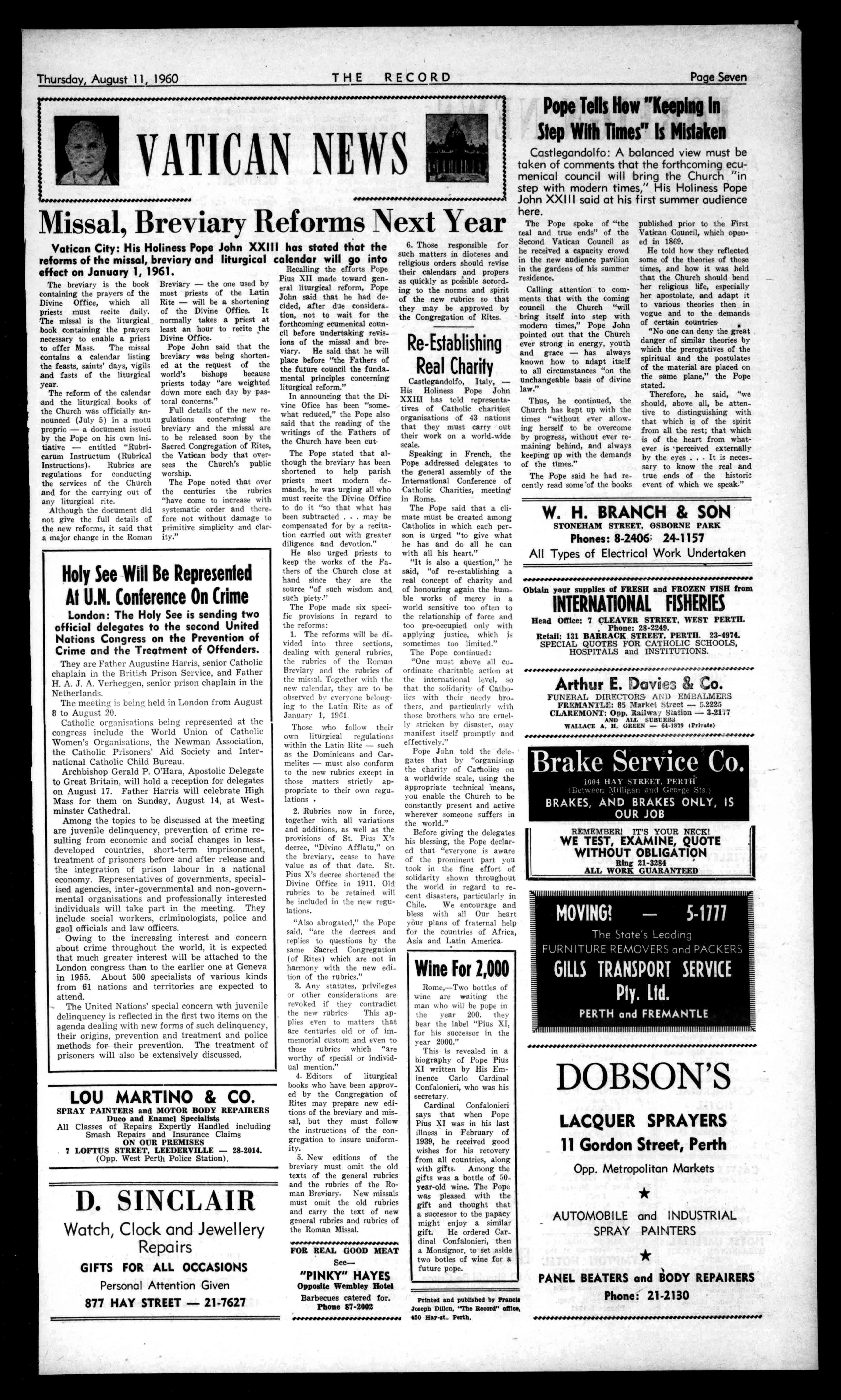 andRefelting Specialists. Phone:21-4586. STANSPIERSPIANOS 1255HaySt..WestPerth GuestHouses ADELAIDEvisitorsstayat "JasperHouse,"17Jasper St.,HydePark,S.A.Two milesfromG.P.O.andclose tobusstop.Carparkon premises.Childrenwelcome Adults£1/5/-,children 12/6,forbedandbreakfast. T.V.available. GERALDTON:St.Francis GuestHouse.Telephone 683.Bedandbreakfast, 15/-night;othermeals optional. TheDepartmentofAgriculturereceivedaletter fromaladywhichcalledfor acarefulanswer, "Willyoupleasesendme abookletexplainingthe differentusesofpoisonin thegarden?"shewrote."I haverecentlylostmyhusbandandIhavealotofdifferentpoisonsonhand." BRIANSTEVENSON Photographer StanleyYoungPty.Ltd.ContinentalRecordShop 372WELLINGTONSTREET.PERTH(closetoBeaufortSt.Bridge, Telephone:21-4804. CompleteWeddingCoverage-Home,ChurchReception.BOOKEARLY. HOTWATER somata%44 84461/"wl 6t42et HASSELLS,WellingtonSt.,forall BRAEMARHotWaterSystems. WeInstallalsoTrade-In.1stqualityBaths,£25,all colours.AllmakesofStoves,Sinks,Cupboards,BuildingSuppliesL'slessatHassells.Phone:21-3047. PractitionersInAll BranchesofDentistry 790-794HAYSTREET, PERTH Thanes:21-7484,81-7887 Emergency:714601,84-18811. Principals:JosephL.Rogers; AlfredLRogers,Dip.D.B. ConvenientOarParkingCanBe naagedbyChess THERECORD,450HAYSTREET. BoxR1279,G.P.O.,PERTH Telephone21-2837. SubscriptionRates: Allcorrespondenceshould £1/13/2peryear beaddressedtoThe 16/7perhalf-year Manager. Engagements,Births,Marriages,Deaths,InMemoriam, Accommodation,Wanted,ForSale,andallclassesof ClassifiedAdvertisements:4/-forthefirst10words, then1/6foreveryfivewordsorpartthereof. DISPLAYADVERTISING:15/-persinglecolumninch, orbycontractrates.-ApplyAdvertisingDepartment. CLASSIFIEDADVERTISEMENTS Deaths MULCAHY (Catherine): WidowofthelateJohnPatrickMulcahy,lovedmother ofLucy,(MrsArthurDonald),Molly(Mrs.Tom O'Loughlin)andDaniel. GrandmotherofEdmond, GeraldineandKathleen